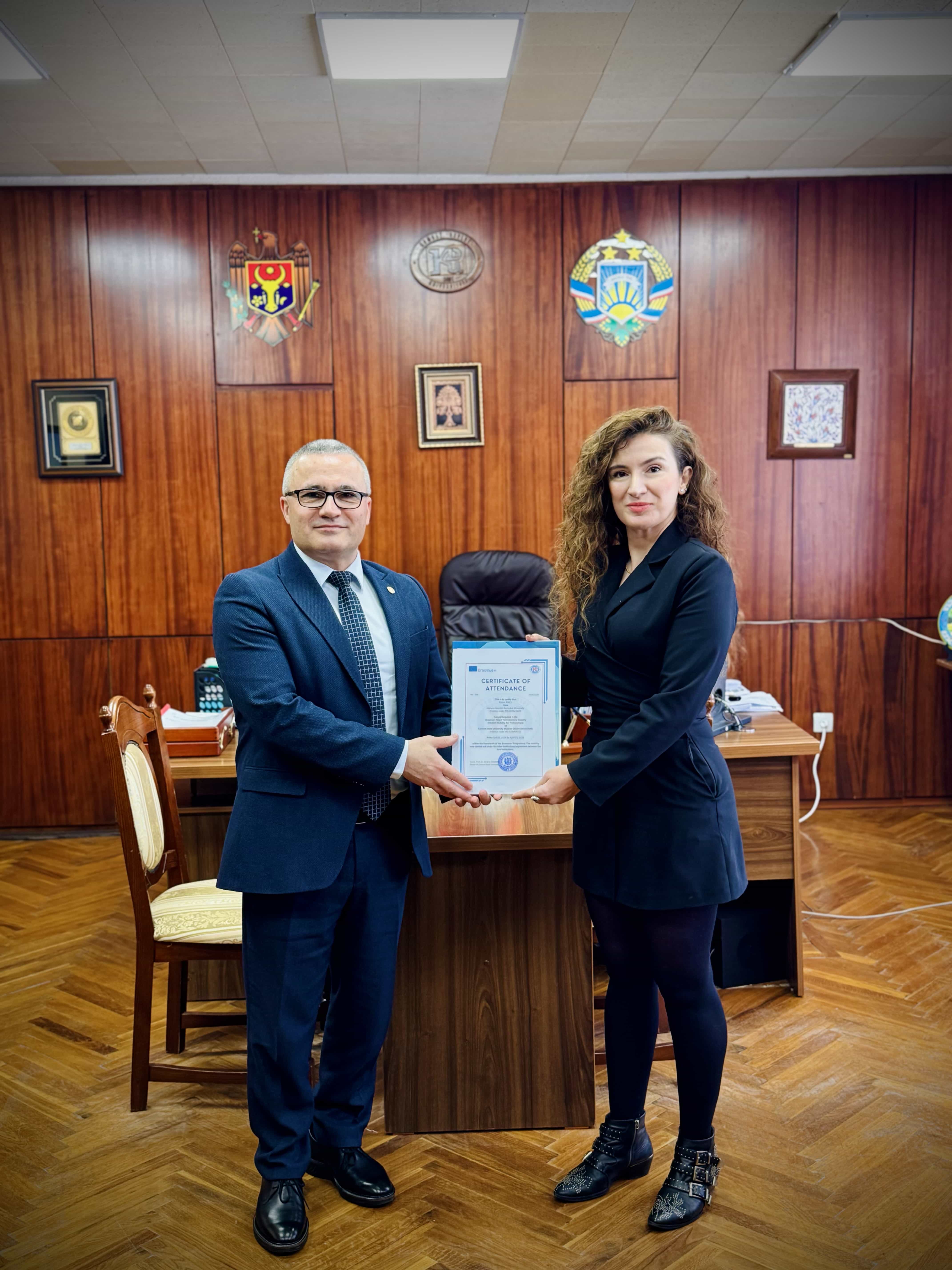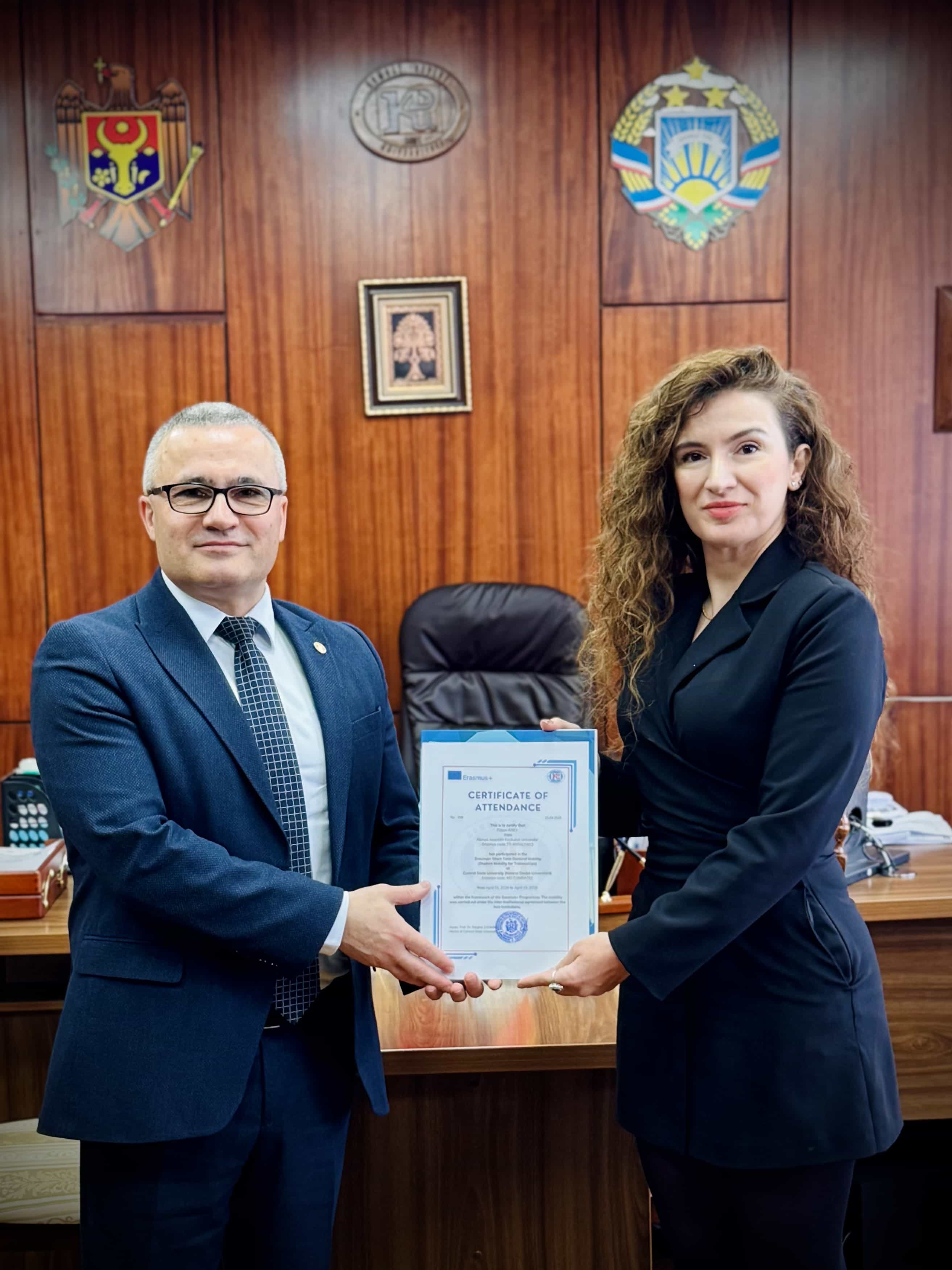 On April 14, 2026, Comrat State University hosted a ceremony dedicated to awarding a certificate of participation in the Erasmus+ program to student Füsun Arıcı, representing Alanya Alaaddin Keykubat University. Within the framework of academic mobility, the student completed a 15-day internship at CSU, which became an important step in strengthening bilateral cooperation between educational institutions of Gagauzia and the Republic of Türkiye.