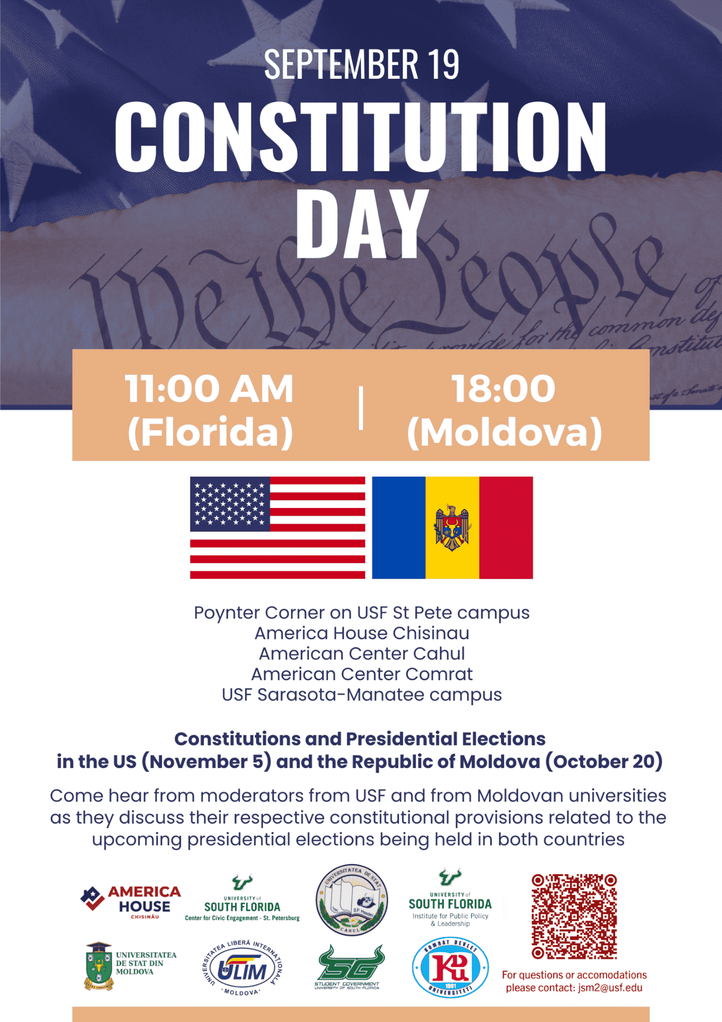 The faculty, doctoral candidates, students, and master's students of Comrat State University (CSU) are invited to an online conference on September 19, 2024, at 6:00 PM, mun. Comrat, Republic of Moldova, which will take place on the Microsoft Teams platform. On September 19, 2024, a teleconference will be held with the University of South Florida on the topic "Constitutional Elections in the United States of America (USA) on November 5, 2024, and the Presidential Elections in the Republic of Moldova on October 20, 2024." The purpose of the event is to discuss the constitutional provisions related to the upcoming presidential elections in the Republic of Moldova and the United States of America. Participants will include Comrat State University (CSU), Moldova State University (MSU), the International Independent University of Moldova (ULIM), the University of South Florida (USF), and the American Cultural Center (America House) in Chișinău. The event is organized by the University of South Florida and the American Cultural Center (America House) in Chișinău in collaboration with Comrat State University. To join the conference, please use the following link: https://teams.microsoft.com