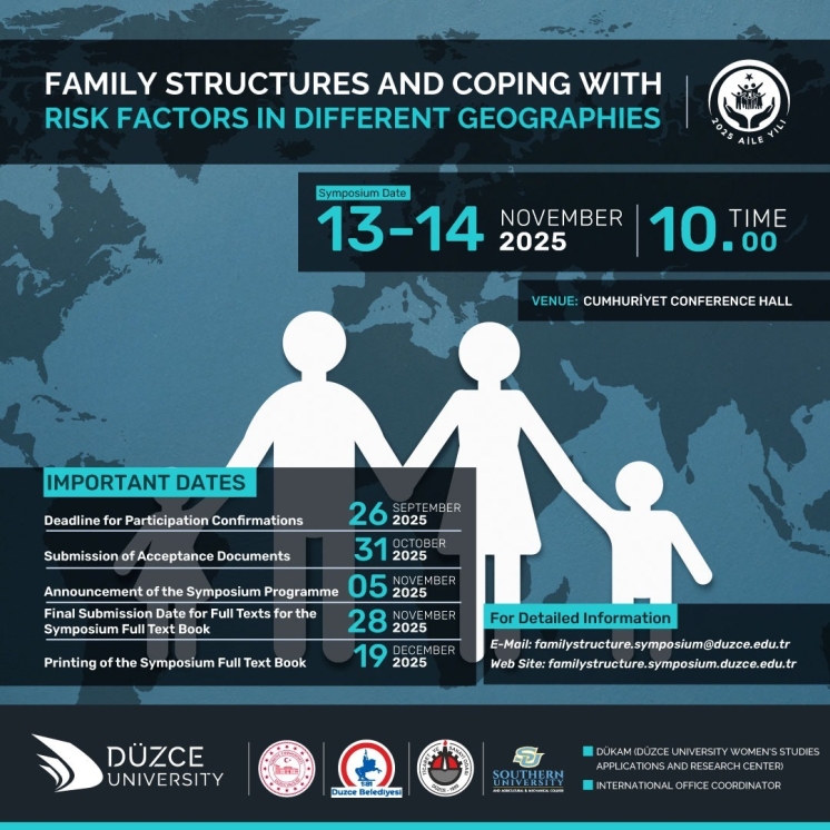 Düzce University invites the faculty members of Comrat State University to participate in the International Symposium “Family Structures and Coping with Risk Factors in Different Geographies”, which will take place on 13–14 November 2025 at the Cumhuriyet Conference Hall. The event will begin at 10:00 a.m.