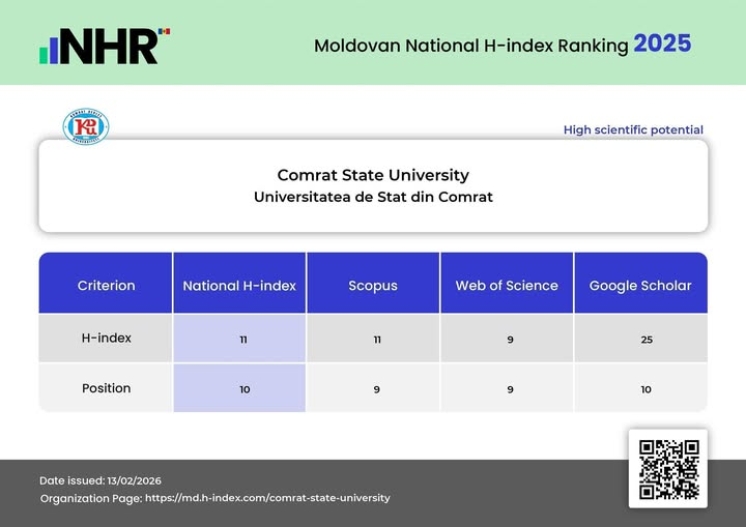 According to the Moldovan National H-index Ranking 2025, Comrat State University (CSU) demonstrates strong scientific potential and достойные показатели publication activity and citation impact in international scientometric databases among 29 research institutions of the Republic of Moldova