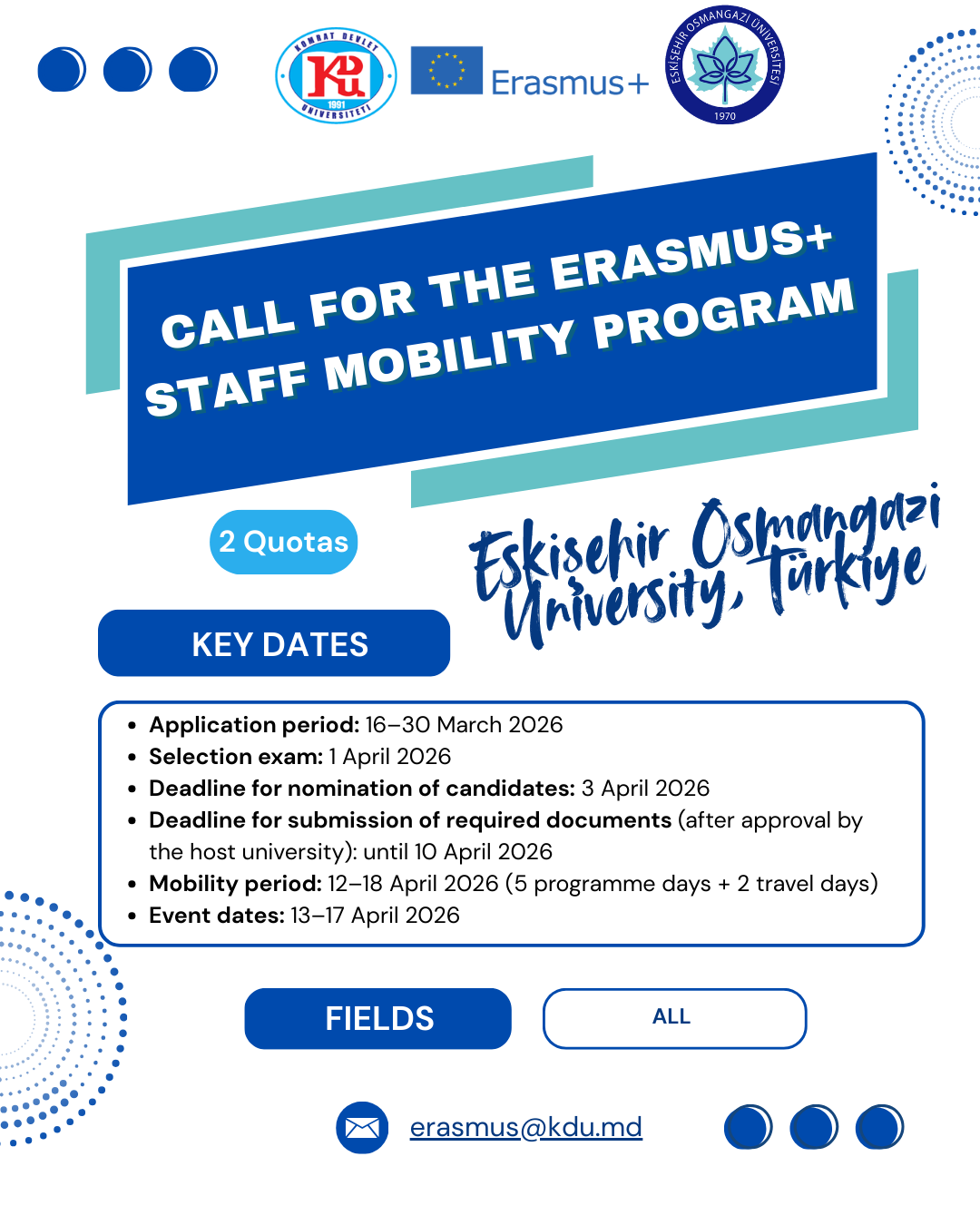 Comrat State University is pleased to announce the opening of applications for academic mobility within the 1st Study in Eskişehir International Staff Week and the 4th International Staff Training Week, organized at Eskişehir Osmangazi University (Eskişehir, Republic of Türkiye) from 13 to 17 April 2026 within the Erasmus+ Programme. This year, the event is jointly organized by the three universities of the city of Eskişehir — Eskişehir Osmangazi University, Anadolu University and Eskişehir Technical University — within the international initiative Study in Eskişehir, aimed at strengthening academic cooperation and promoting the city’s educational opportunities at the international level.