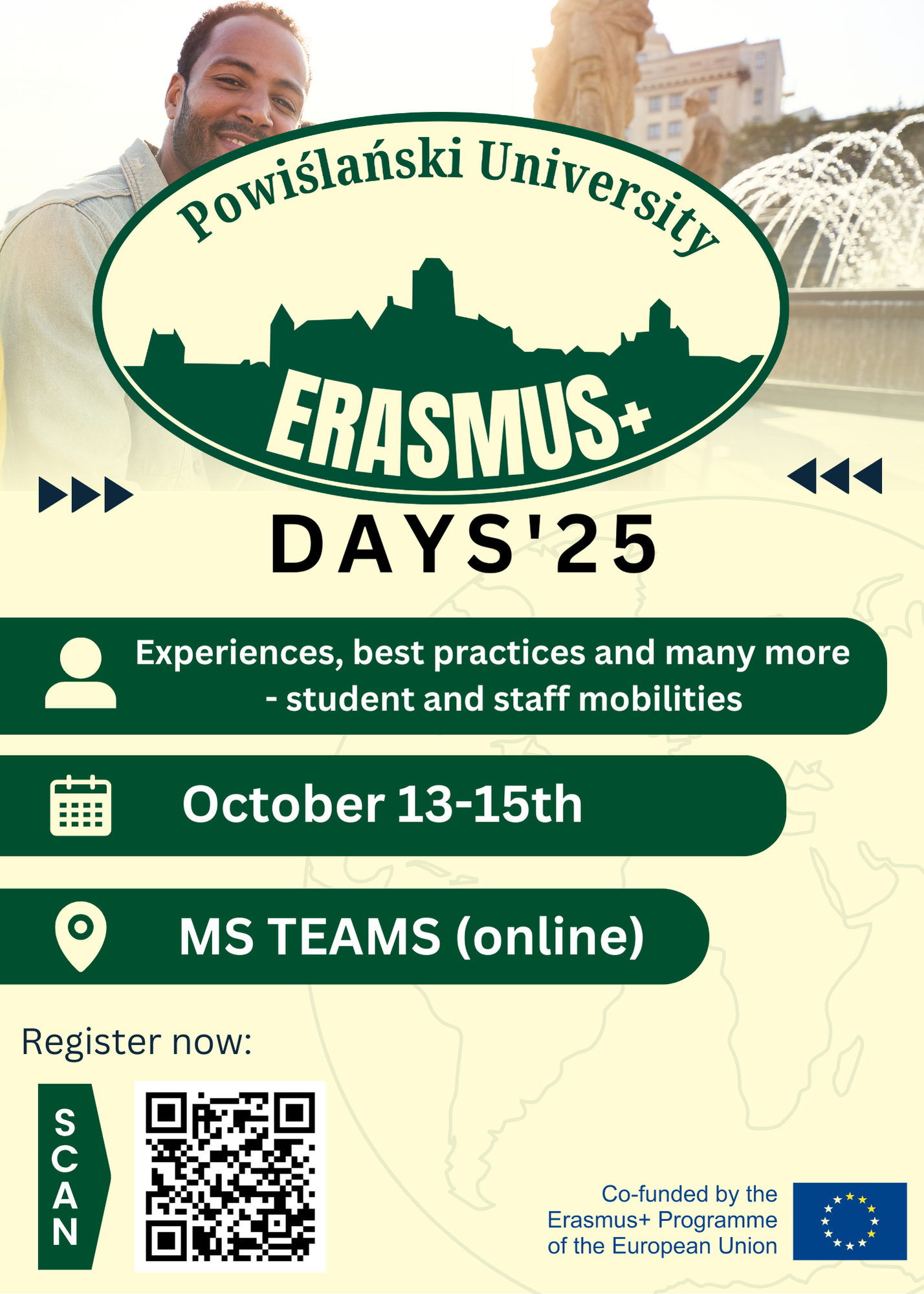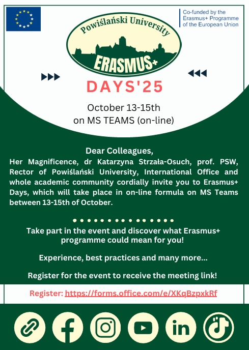 During the Erasmus+ Days'25 event, Powiślański University will present the extensive opportunities available through the Erasmus+ program. Don't miss this chance to explore scholarships, grants, and exchange programs that can enrich your educational journey and enhance your personal and professional growth.