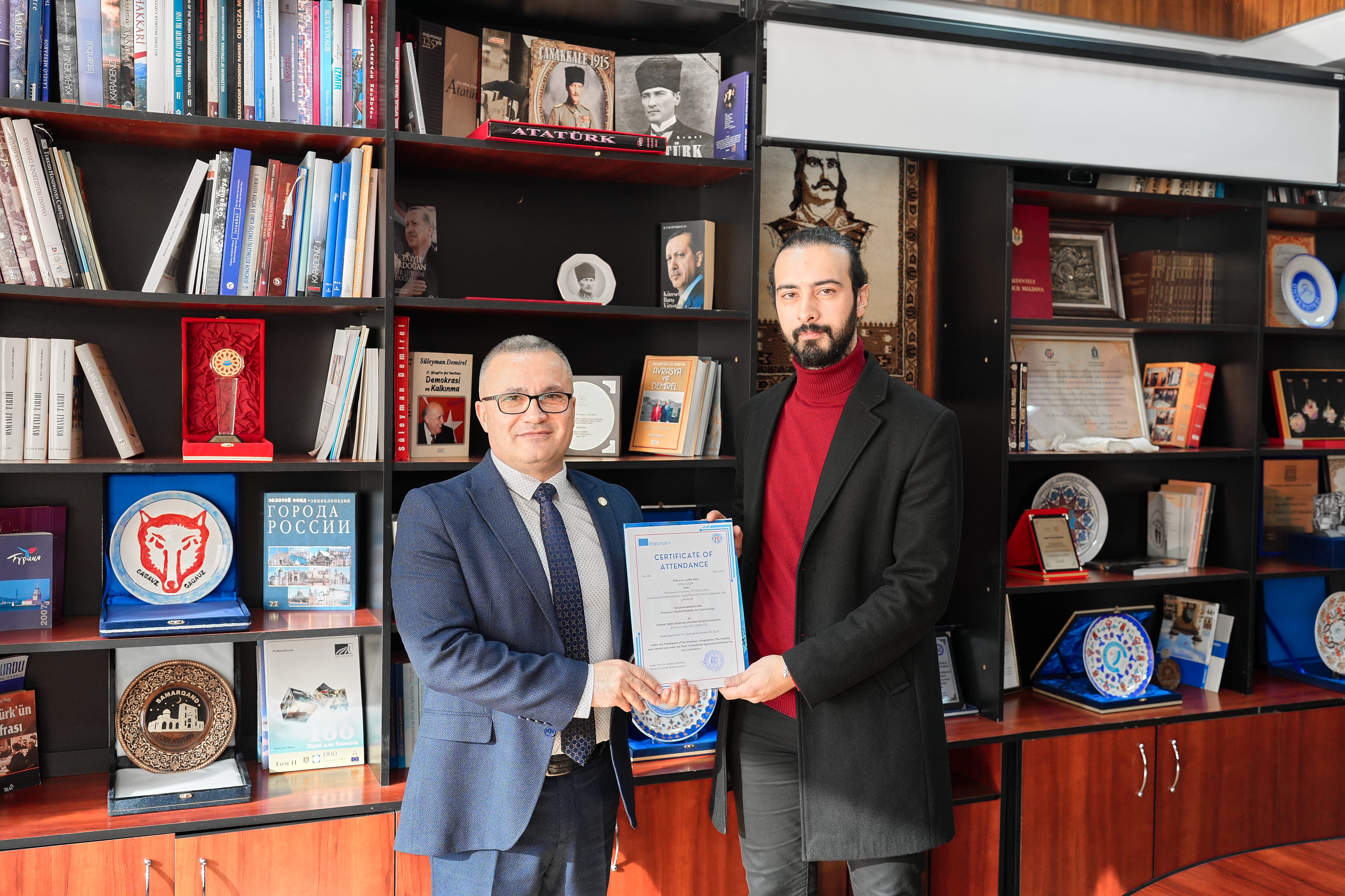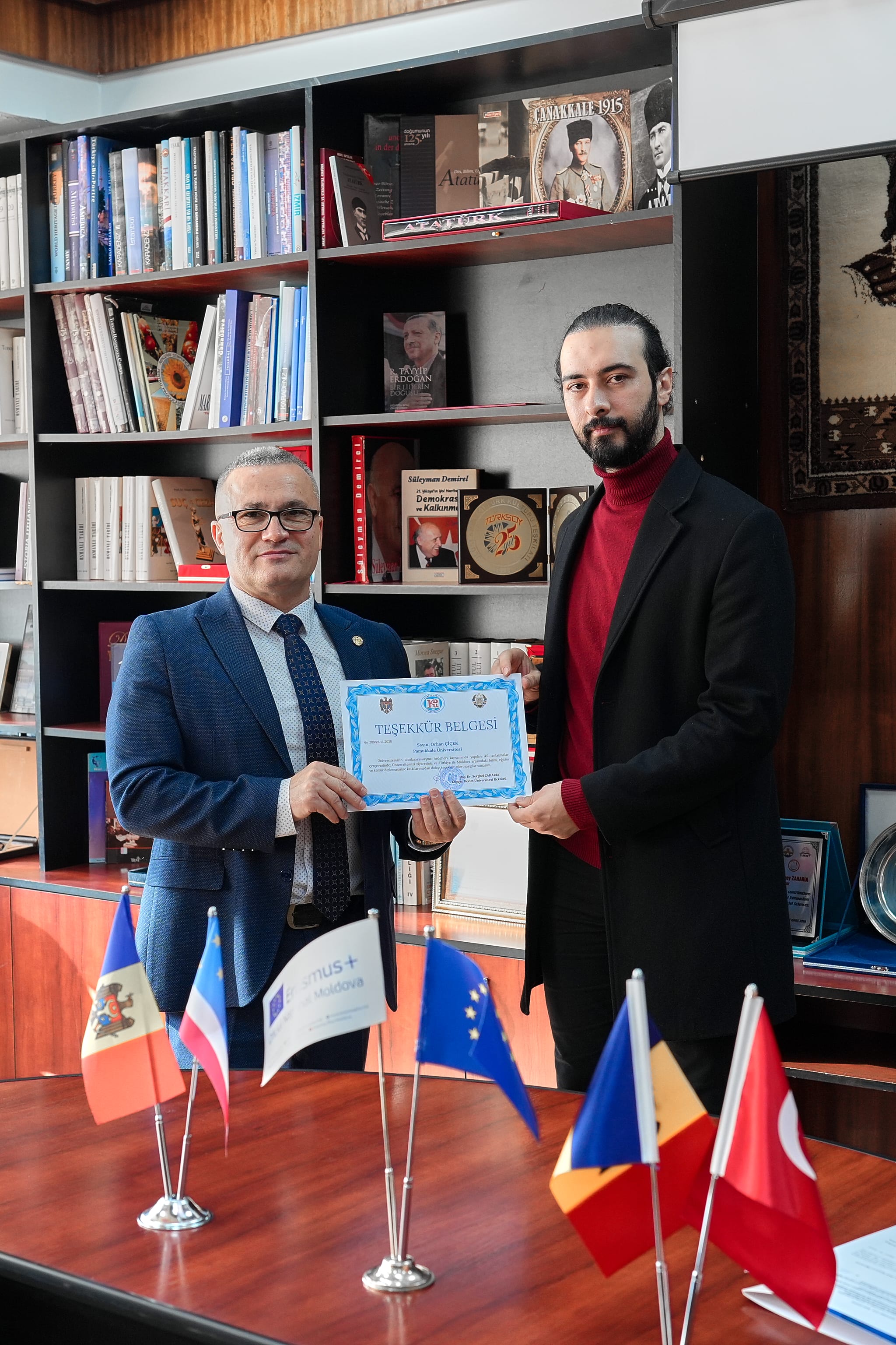 During the final meeting with the University Administration and the International Relations Department, Orhan shared his impressions of his stay in Moldova and expressed sincere gratitude to the university staff for their support, attention, and warm hospitality. He emphasized that the time spent in Comrat was an important stage in his academic and personal development. The Rector of Comrat State University presented Orhan Çiçek with a participation certificate and a letter of appreciation for his contribution to the development of scientific and educational cooperation between Türkiye and the Republic of Moldova, for fostering cultural diplomacy, and for his active involvement in bilateral projects within the university’s internationalization policy.