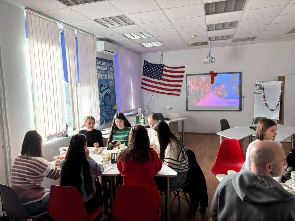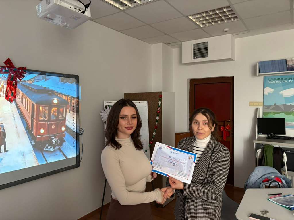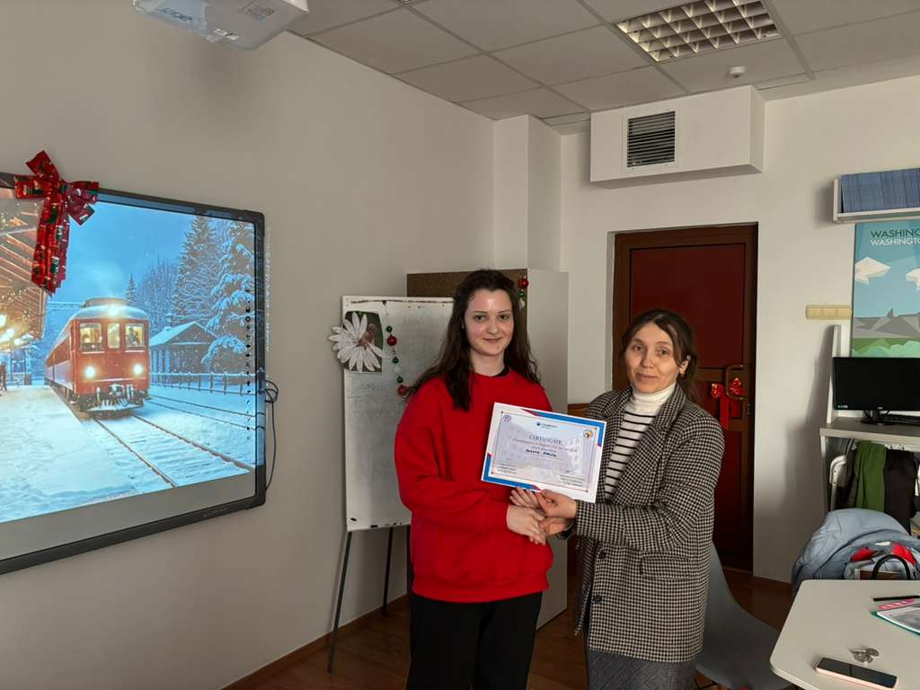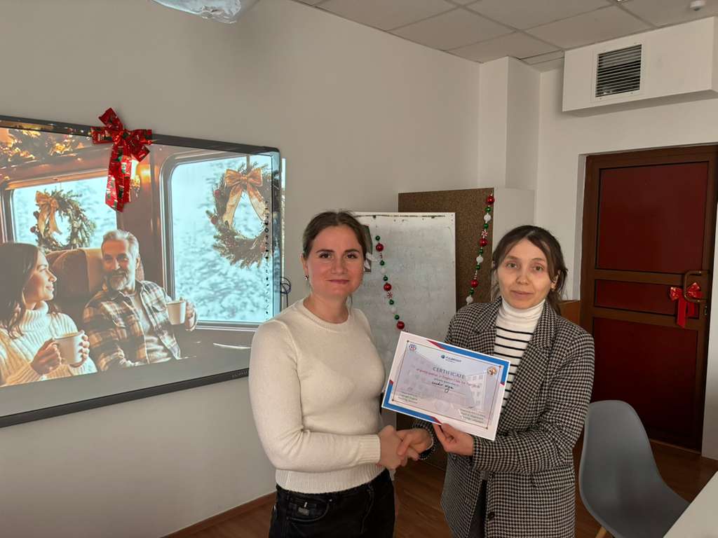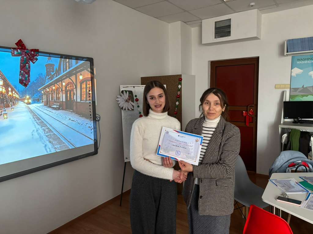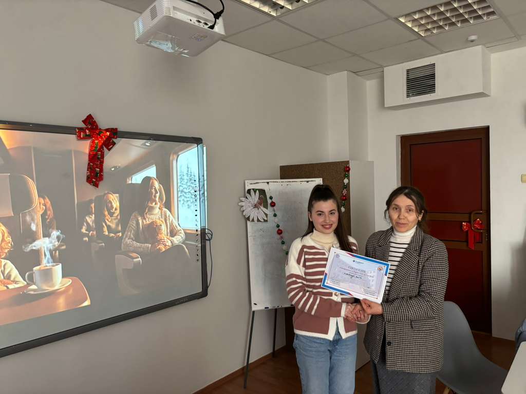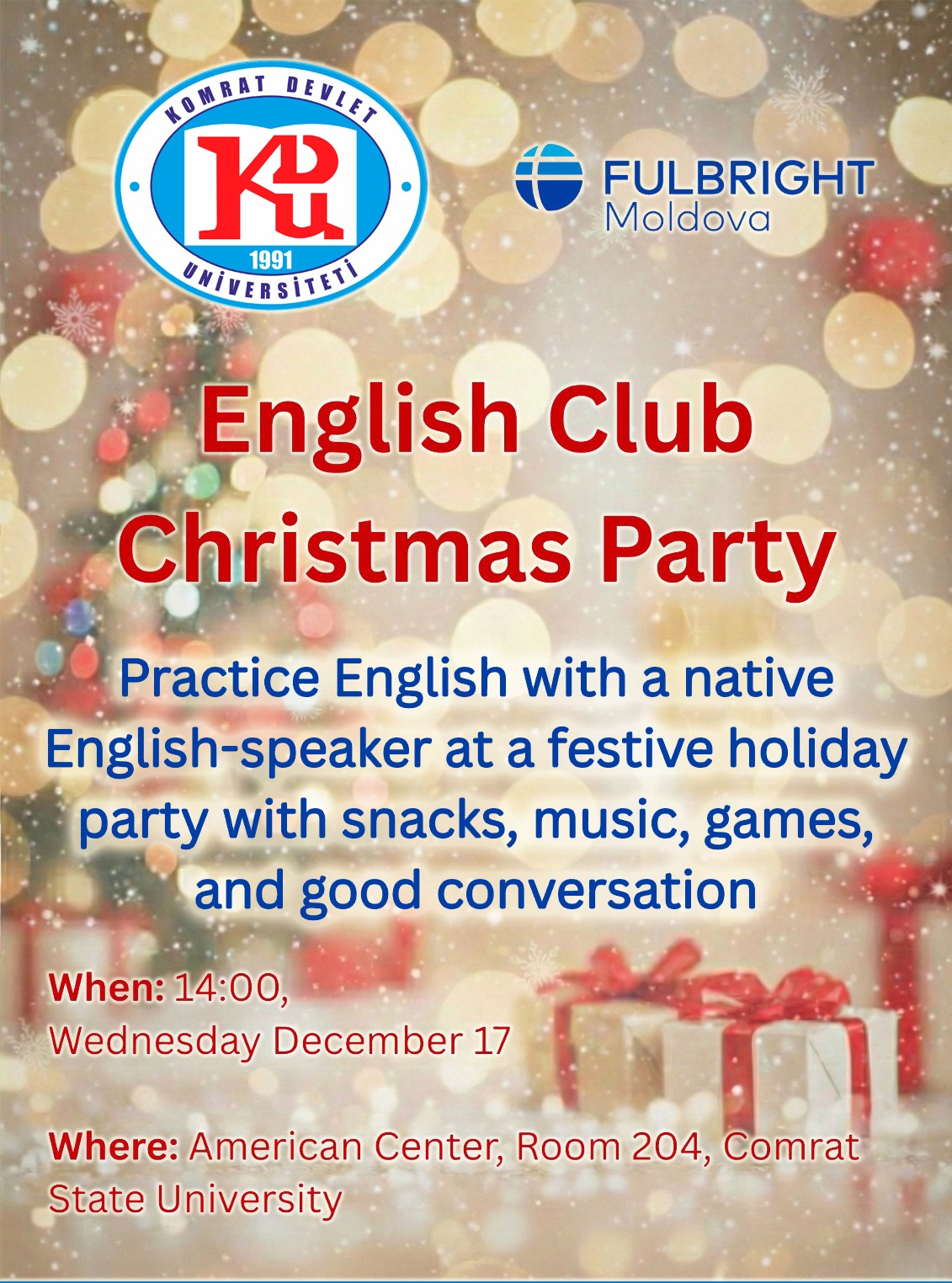 On December 17, 2025, Comrat State University hosted a festive meeting of the English Club, dedicated to the end of the academic semester and the upcoming Christmas and New Year holidays. The event took place in a warm and friendly atmosphere and featured interactive games, informal communication in English, festive treats, and the ceremonial presentation of certificates to active club participants from the Department of Foreign Languages. This meeting marked the final English Club session of 2025 and the last one this year with the participation of Maya Watson, a Fulbright Foundation lecturer. Maya Watson regularly organizes weekly English Discussion Club meetings at Comrat State University, creating a space for the development of language skills, intercultural dialogue, and academic communication. As part of this event, she also took an active role in its preparation and organization, making a significant contribution to the success of the celebration. The event brought together students from the Department of Foreign Languages (English–Russian and English–German programs), as well as students from the IT Department and the Faculty of Economics. The participation of international students from Azerbaijan and Türkiye added a special atmosphere to the celebration, highlighting the international and open character of the university community.