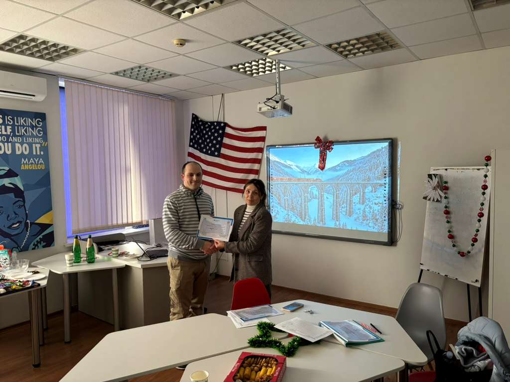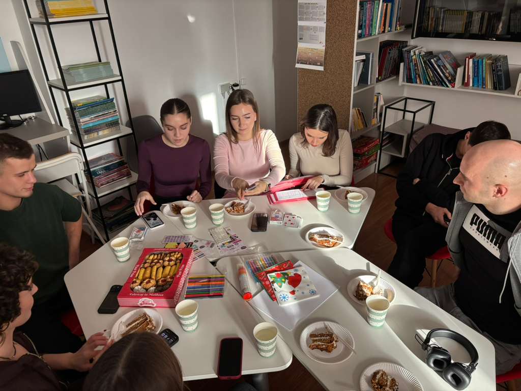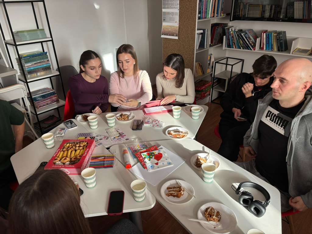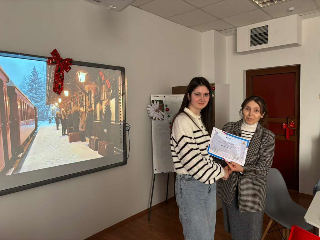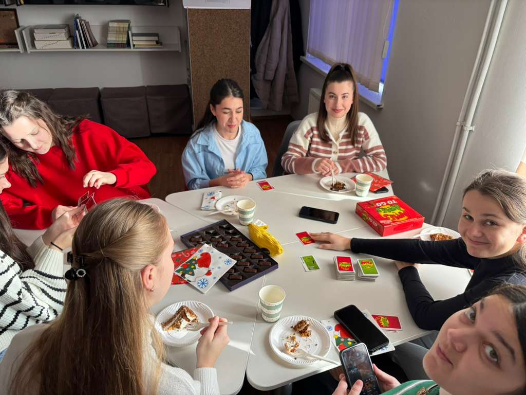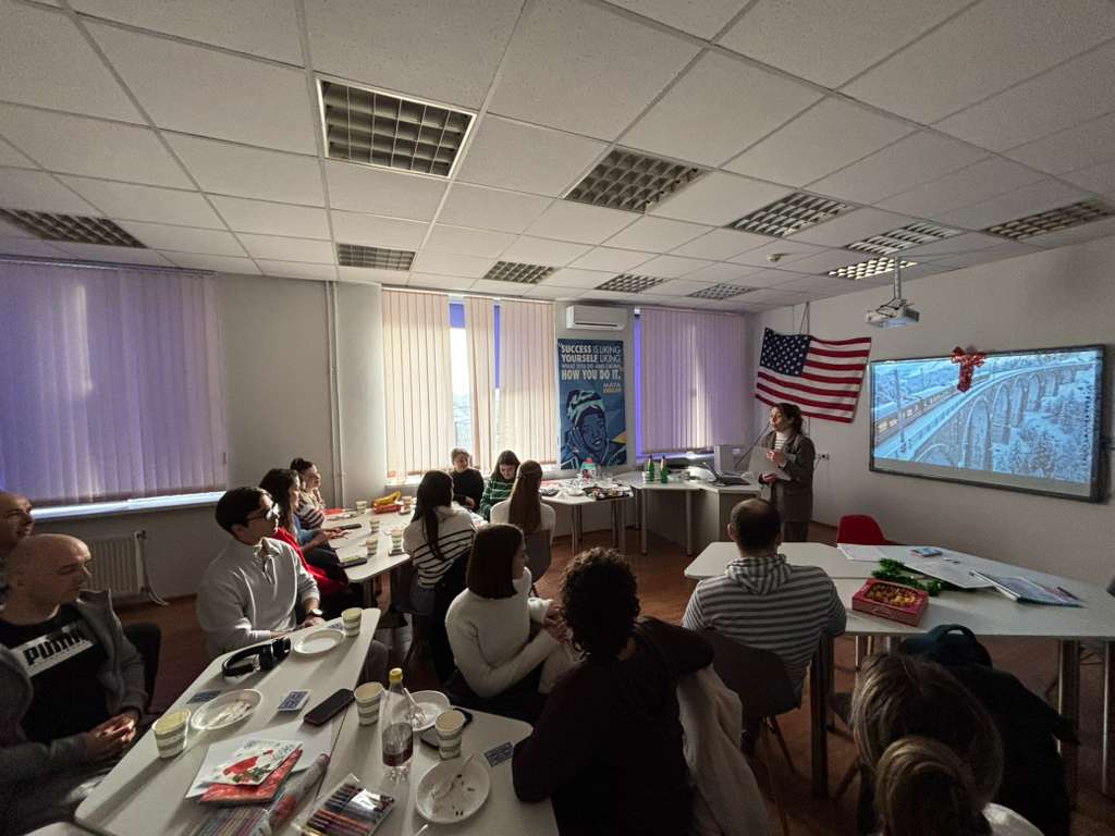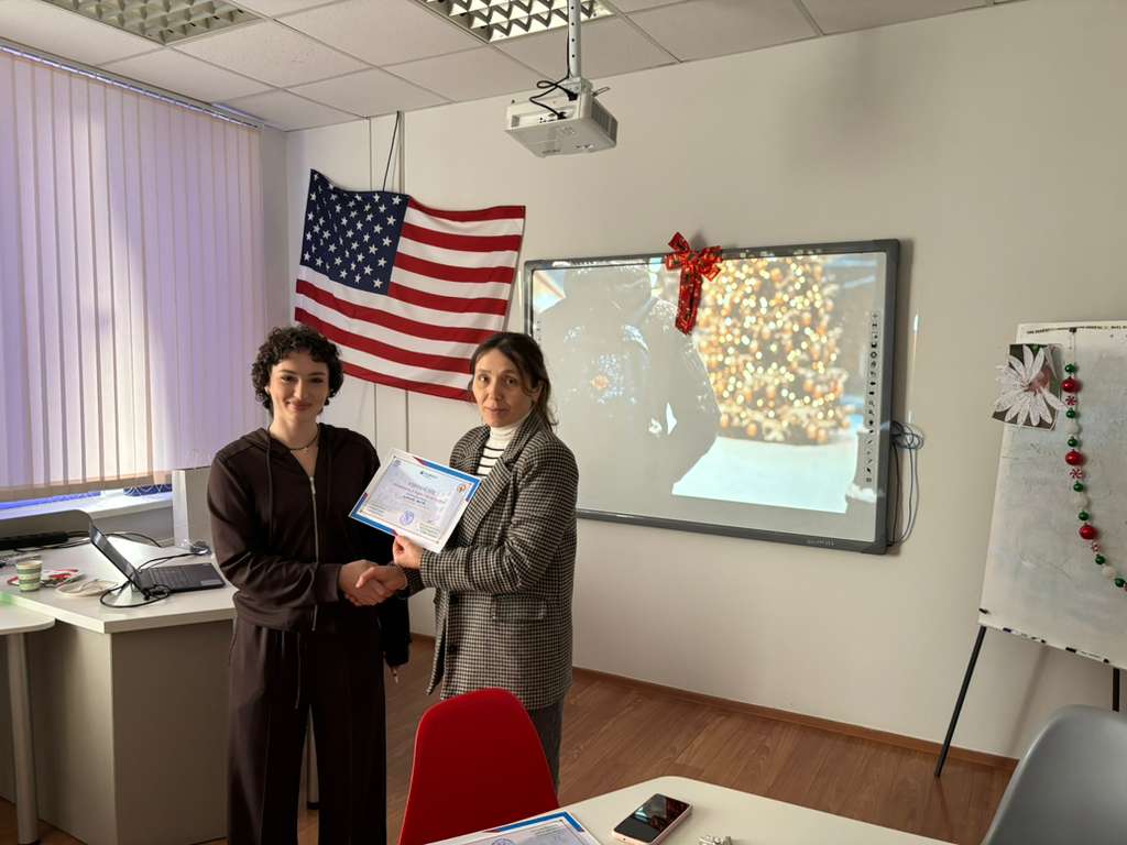 On December 17, 2025, Comrat State University hosted a festive meeting of the English Club, dedicated to the end of the academic semester and the upcoming Christmas and New Year holidays. The event took place in a warm and friendly atmosphere and featured interactive games, informal communication in English, festive treats, and the ceremonial presentation of certificates to active club participants from the Department of Foreign Languages. This meeting marked the final English Club session of 2025 and the last one this year with the participation of Maya Watson, a Fulbright Foundation lecturer. Maya Watson regularly organizes weekly English Discussion Club meetings at Comrat State University, creating a space for the development of language skills, intercultural dialogue, and academic communication. As part of this event, she also took an active role in its preparation and organization, making a significant contribution to the success of the celebration. The event brought together students from the Department of Foreign Languages (English–Russian and English–German programs), as well as students from the IT Department and the Faculty of Economics. The participation of international students from Azerbaijan and Türkiye added a special atmosphere to the celebration, highlighting the international and open character of the university community.