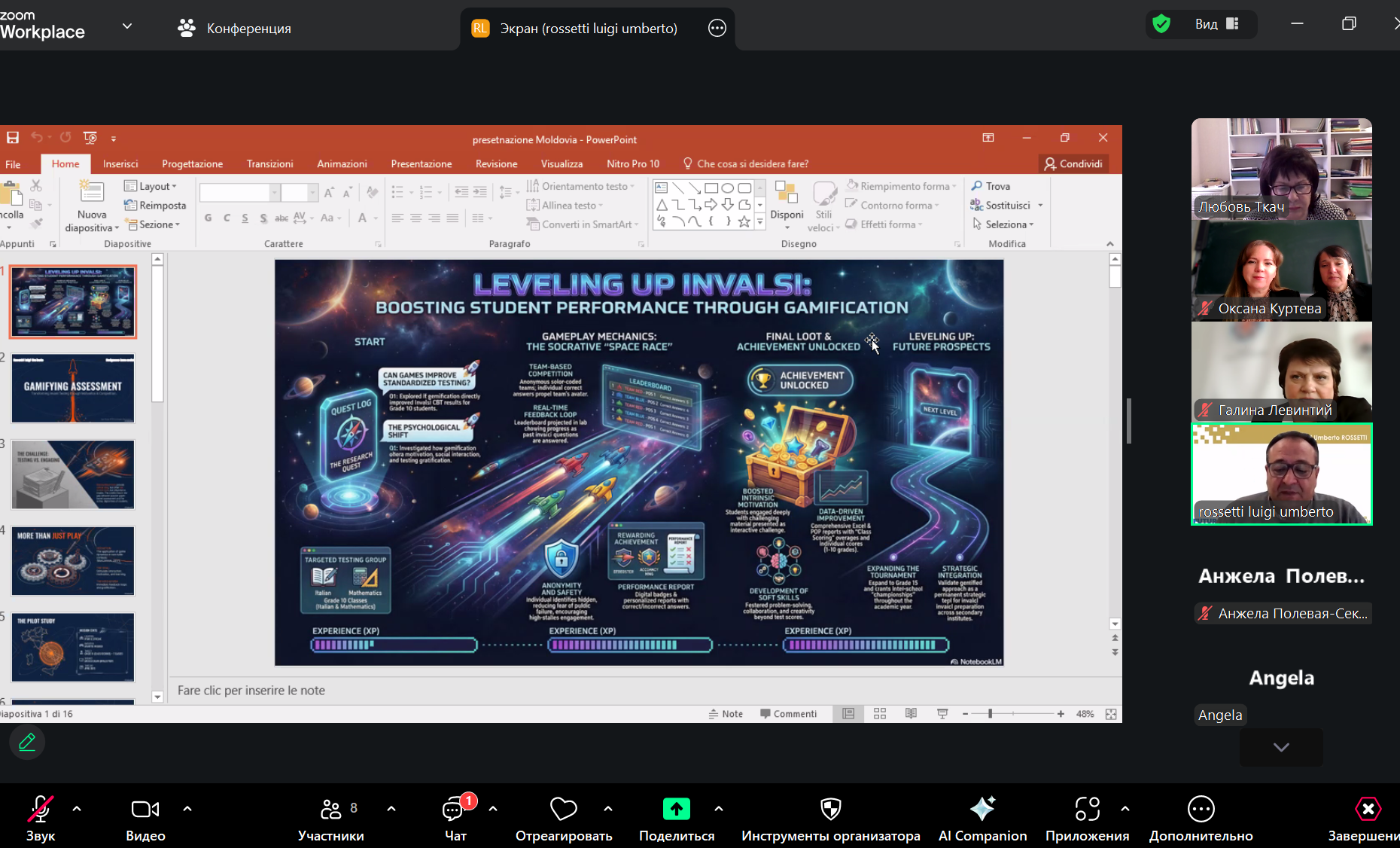 Uluslararası deneyim: Rossetti Luigi Umberto (Ph.D., Università degli Studi del Sannio, İtaliya) "Gamification as a strategic tool for improving INVALSI test performance" araştırmasını sundu, orada oyun mehanikaların üürenmäk sonuşlarını nasıl iyileştirdiini praktikada gösterdi.