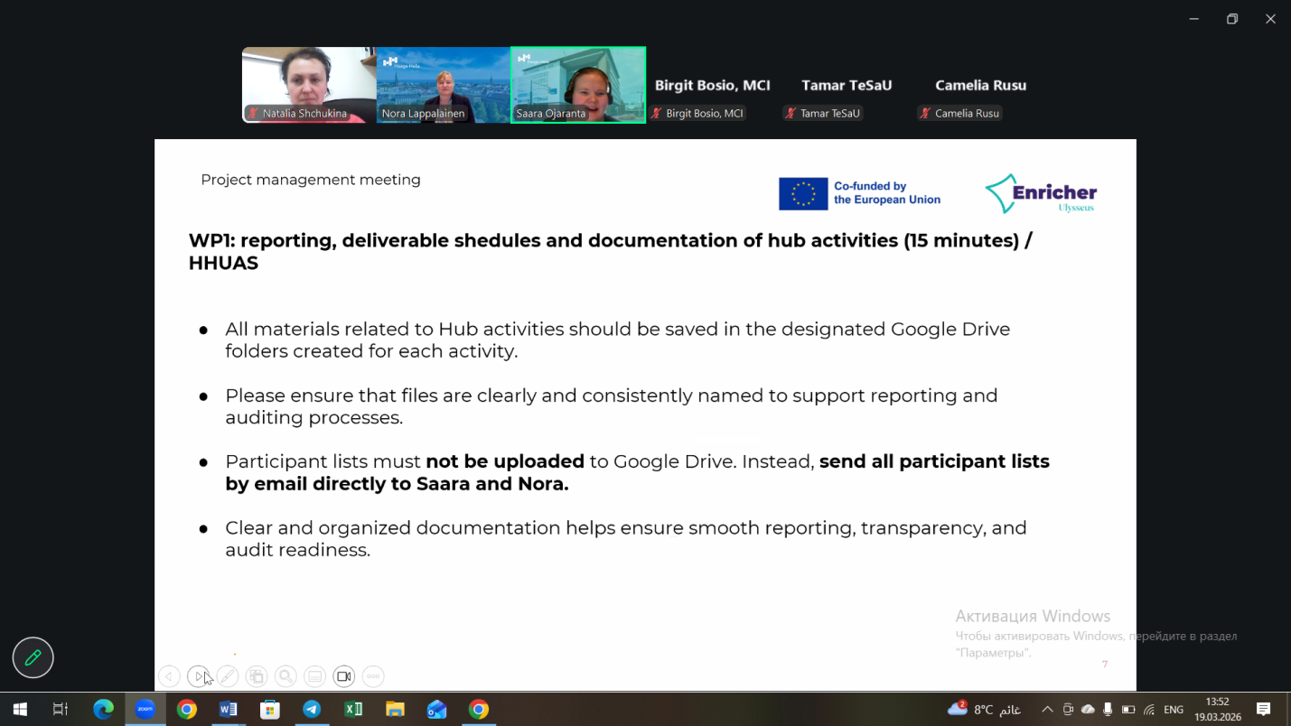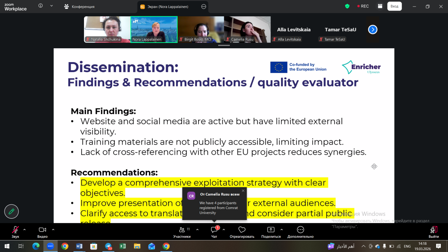 19 Mart 2026 tarihinde, ENRICHER uluslararası projesi katılımcılarının son çevrimiçi çalışma toplantısı gerçekleştirildi. Toplantı sırasında ortaklar, projenin uygulanmasına ilişkin temel konuları, mevcut görevleri ve tüm çalışma paketleri için sonraki adımları görüştüler.