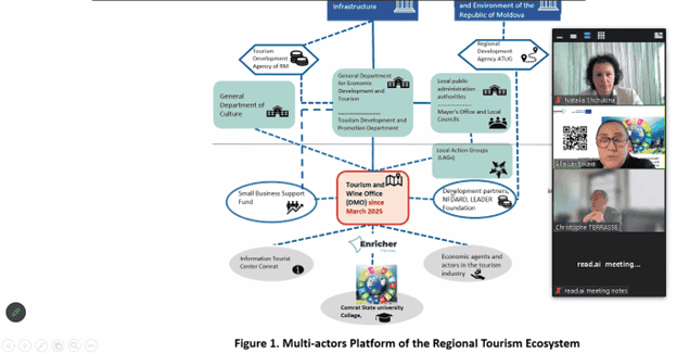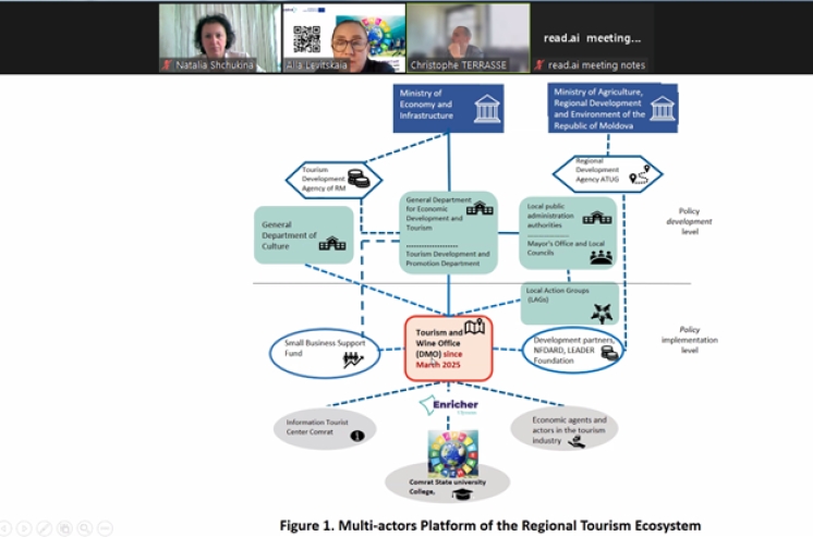 13 Mayıs 2025 tarihinde Komrat Devlet Üniversitesi’ni temsilen “ENRICHER hubs – Designing Green Tourism Concepts Through Learning” (Eğitim Yoluyla Yeşil Turizm Kavramlarının Geliştirilmesi) adlı ERASMUS-EDU-2022-CBHE-STRAND-2 projesi ekibi üyeleri – Dr. habil., Prof. Alla Levitskaia hem Dr. habil., Doç. Natalia Șciuchina – proje dış uzmanı Dr. Christophe Terrasse ile gerçekleştirdikleri çevrim içi toplantıda, projenin temel hedeflerinden biri olan “Green Tourism Hub” adlı bilimsel-uygulamalı merkezin açılışına yönelik hazırlık süreci hakkında bilgi verdiler. Prof. Alla Levitskaia, Merkezin yapısını tanıttı hem üniversite merkezinin turizm şirketleri, diğer iş yapıları hem yerel yönetimlerle yeşil turizmin yaygınlaştırılması konularında iş birliği perspektiflerini anlattı. Uzman, merkezin faaliyetlerine dâhil edilecek öğrenci kitlesiyle, Komrat Üniversitesi’nin proje ortak üniversiteleriyle oluşturulacak Merkezler üzerinden ortak girişimlerin nasıl geliştirileceği konularıyla ilgilendi. Prof. Alla Levitskaia ayrıca, Ekonomi Fakültesi öğrencileri – özellikle “Turizm; Otelcilik” programında okuyanlar – için öğretim programına entegre edilmesi planlanan kısa süreli bir dersin hazırlanması hem Merkezde görev alacak eğitmen üniversite öğretim üyelerinin yetiştirilmesi süreci hakkında bilgi verdi. Doç. Natalia Șciuchina ise, üniversitenin Yeşil Turizm Merkezi'nin yalnızca ekonomi öğrencilerini değil, aynı zamanda sürdürülebilir kalkınma hem yeşil teknolojilerle ilgilenen diğer fakültelerin öğrencilerini de faaliyetlere dâhil etmeyi planladığını belirtti. Uzman tarafından yöneltilen sorular, sürdürülebilir turizm konulu dersin hangi dilde verileceği, projenin karşılaştığı mevcut zorluklar hem projenin tamamlanmasından sonra Merkezin gelecekteki gelişme perspektiflerini de kapsıyordu. Tüm soruların yanıtlanmasının hem detaylı bilgilendirmenin ardından Dr. Christophe Terrasse proje ekibine teşekkür ederek Komrat Devlet Üniversitesi’nin yeşil turizm merkezinin açılışına yönelik yüksek hazırlık seviyesini takdir etti. Ayrıca KDU’nun web sitesini dikkatle incelediğini hem bu sayede hem Merkezin açılış süreci hem de sürdürülebilir turizm fikirlerinin öğretim sürecine entegre edilmesi açısından yürütülen çalışmaları yüksek düzeyde değerlendirdiğini ifade etti.