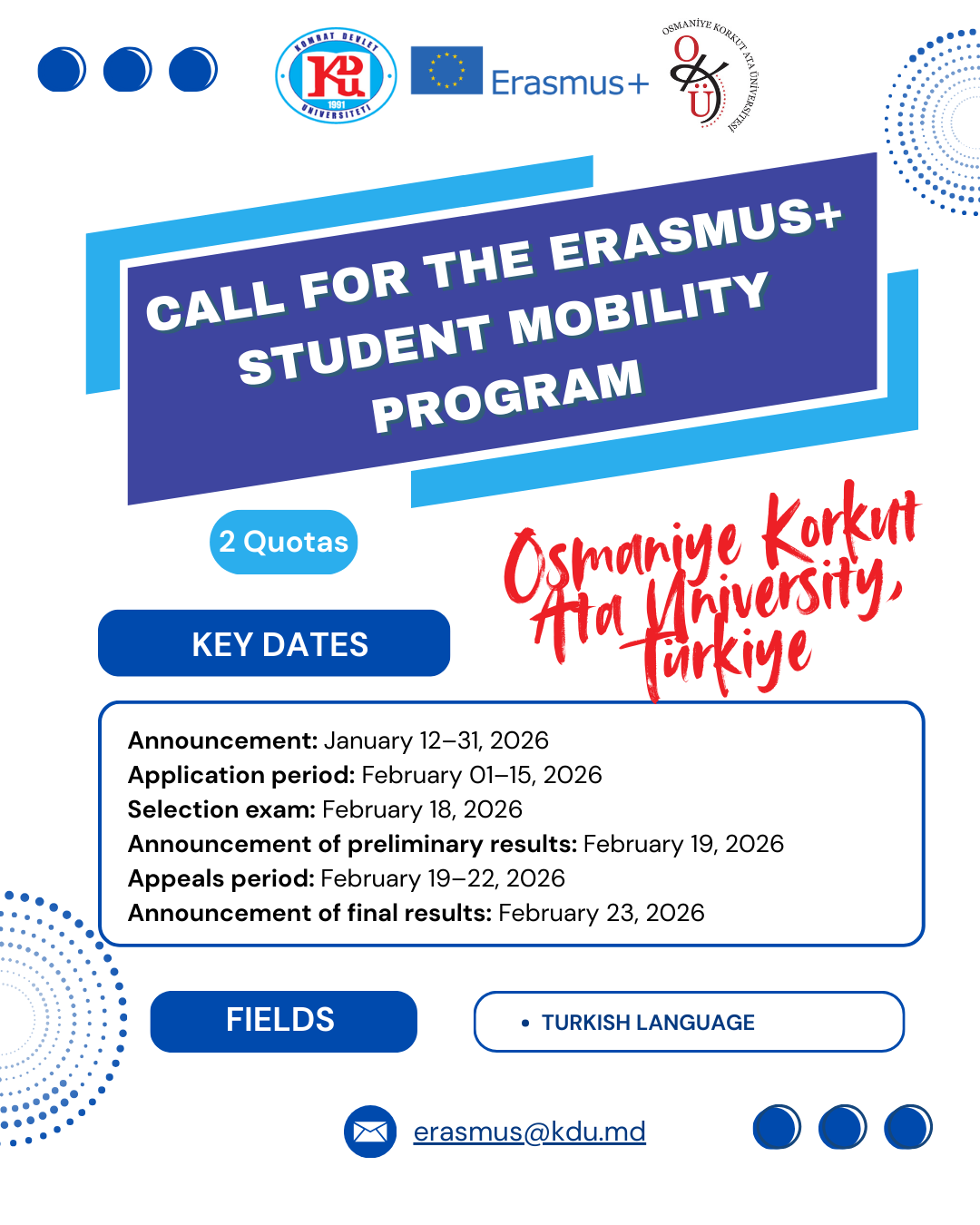 Komrat Devlet Üniversitesi, 2025–2026 akademik yılı Bahar dönemi veya 2026–2027 akademik yılının Güz dönemi için Osmaniye Korkut Ata Üniversitesi, Türkiye Erasmus+ Student Mobility for Traineeships (SMT)/Studies (SMS) programına başvuruların başladığını duyurur.