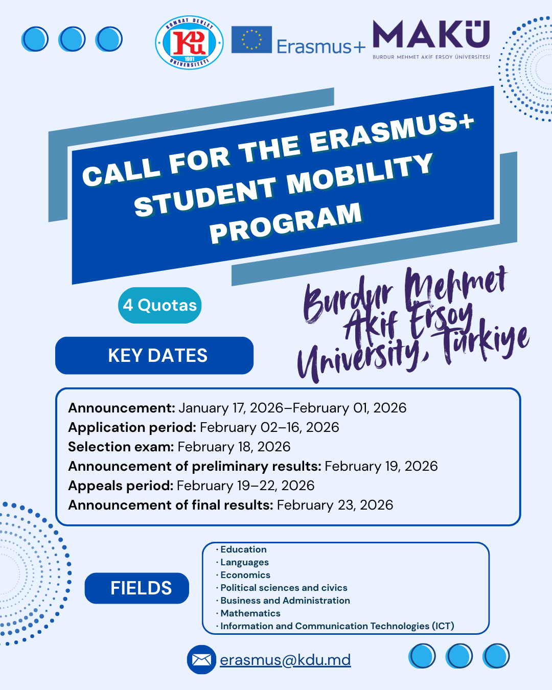 Komrat Devlet Üniversitesi, 2025–2026 akademik yılının bahar dönemi için Türkiye Burdur Mehmet Akif Ersoy Üniversitesi’nde Erasmus+ Öğrenci Staj Hareketliliği (SMT) programına katılım için başvuru çağrısını ilan etmektedir.
