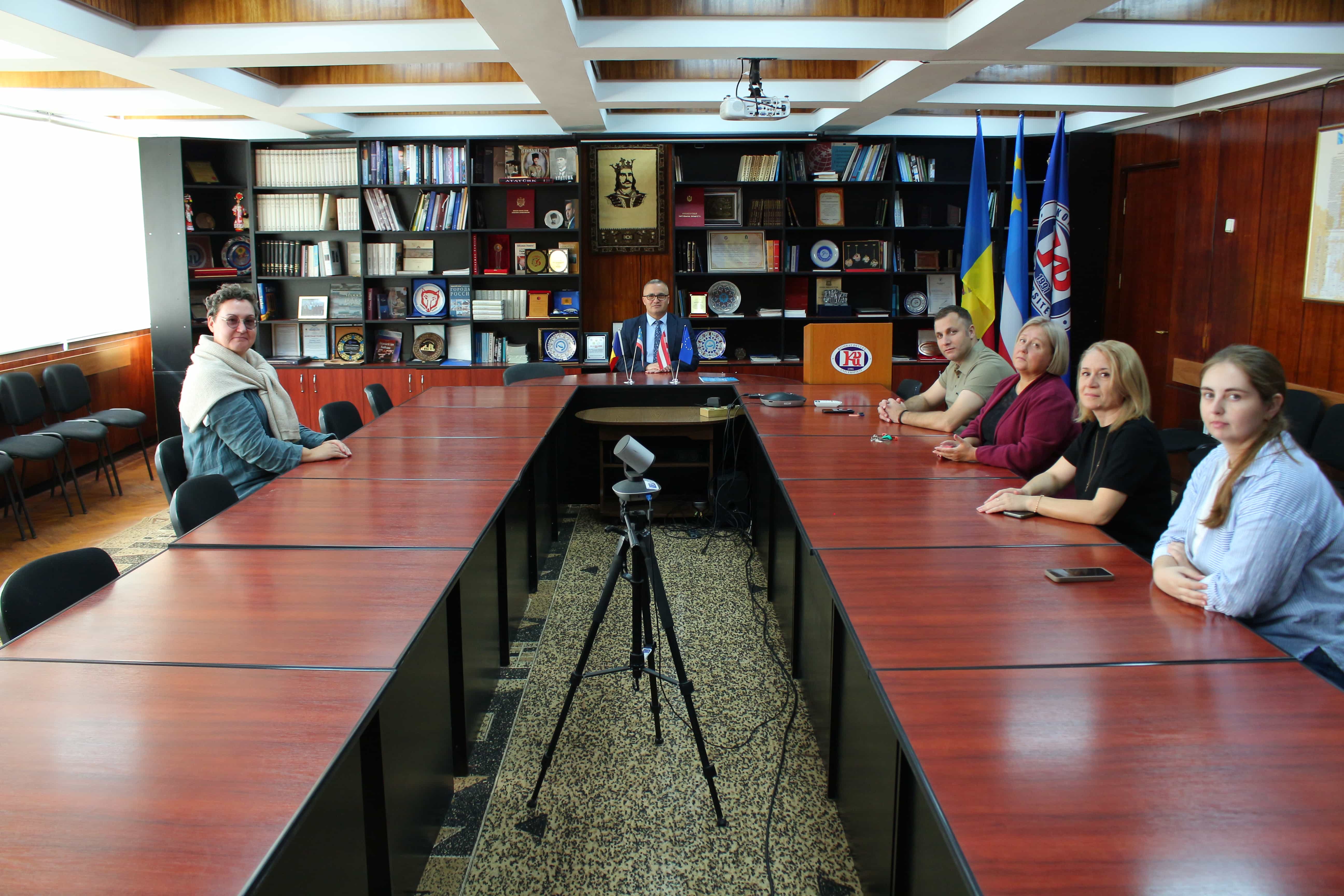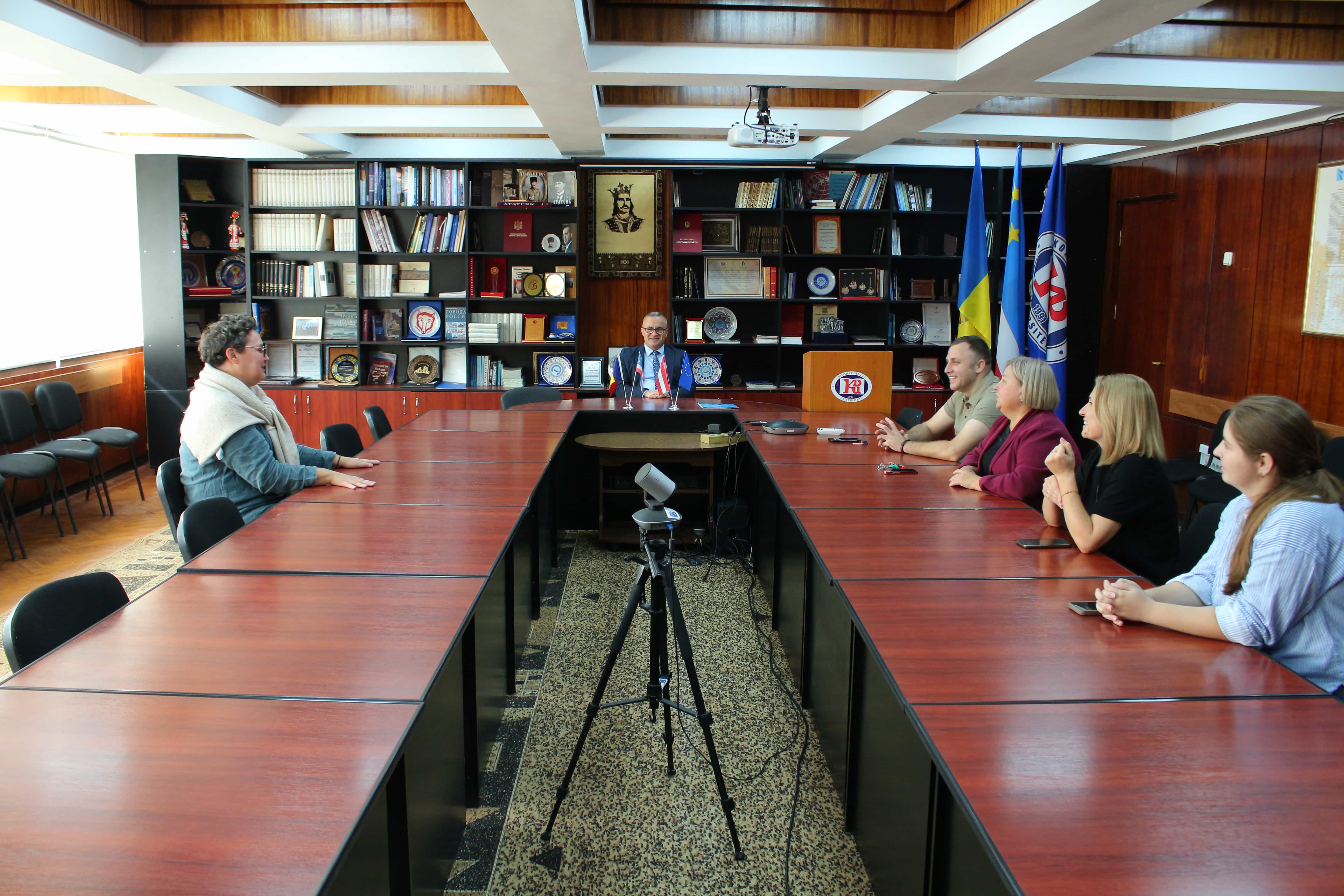 Komrat Devlet Üniversitesi’nde, KDU Rektörü Doç. Dr. Serghei Zaharia, Bilim ve Uluslararası İlişkilerden Sorumlu Rektör Yardımcısı Doç. Dr. Svetlana Ghenova ile Erasmus+ Staff Mobility for Teaching programı katılımcısı — Alberta Koleji’nden (Letonya) Inga Milēviča’nın final toplantısı gerçekleştirildi. Toplantıya ayrıca Uluslararası İlişkiler ve Proje Faaliyetleri Bölümü personeli ile Milli Kültür Fakültesi öğretim üyesi Doç. Dr. Larisa Boicova katıldı.