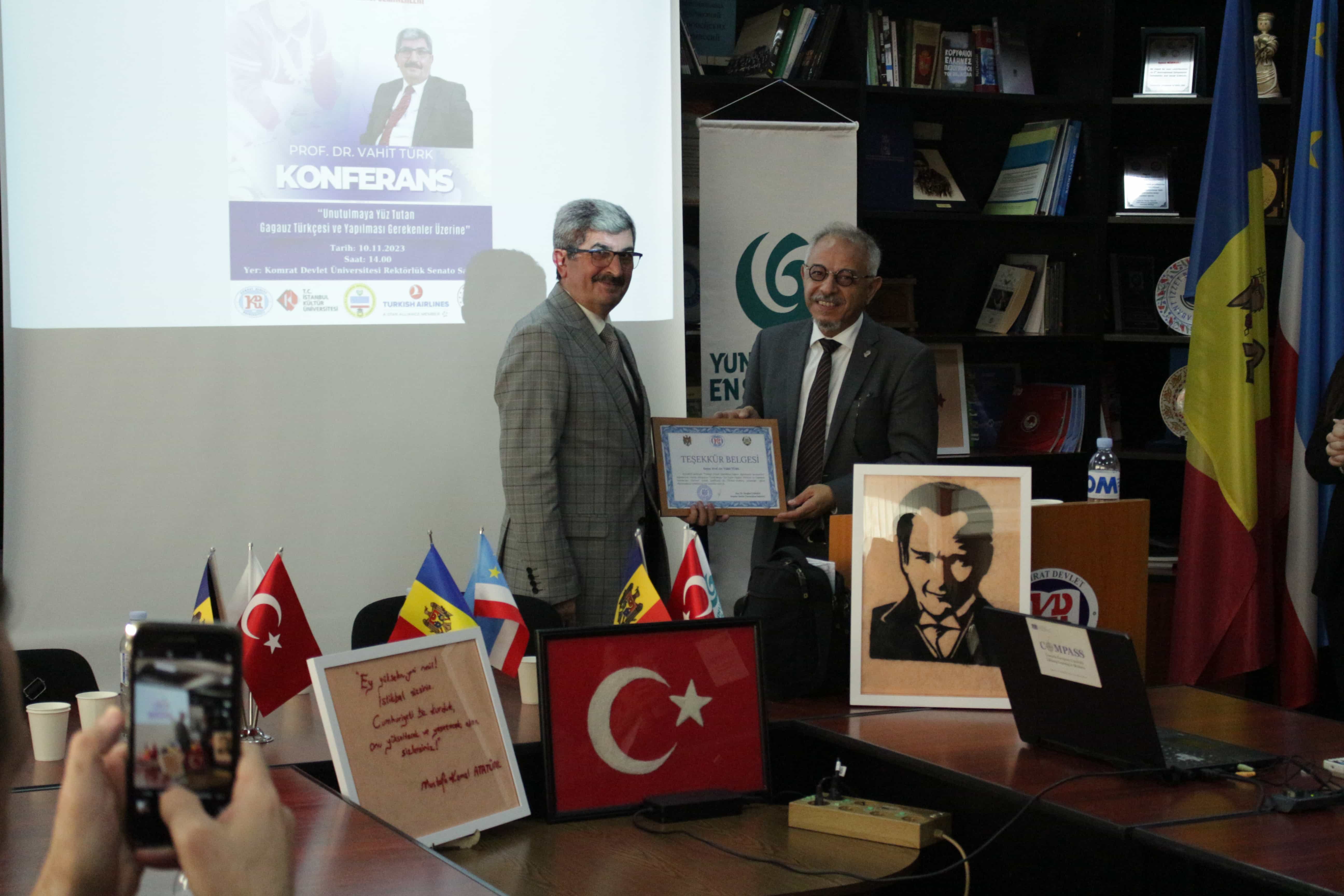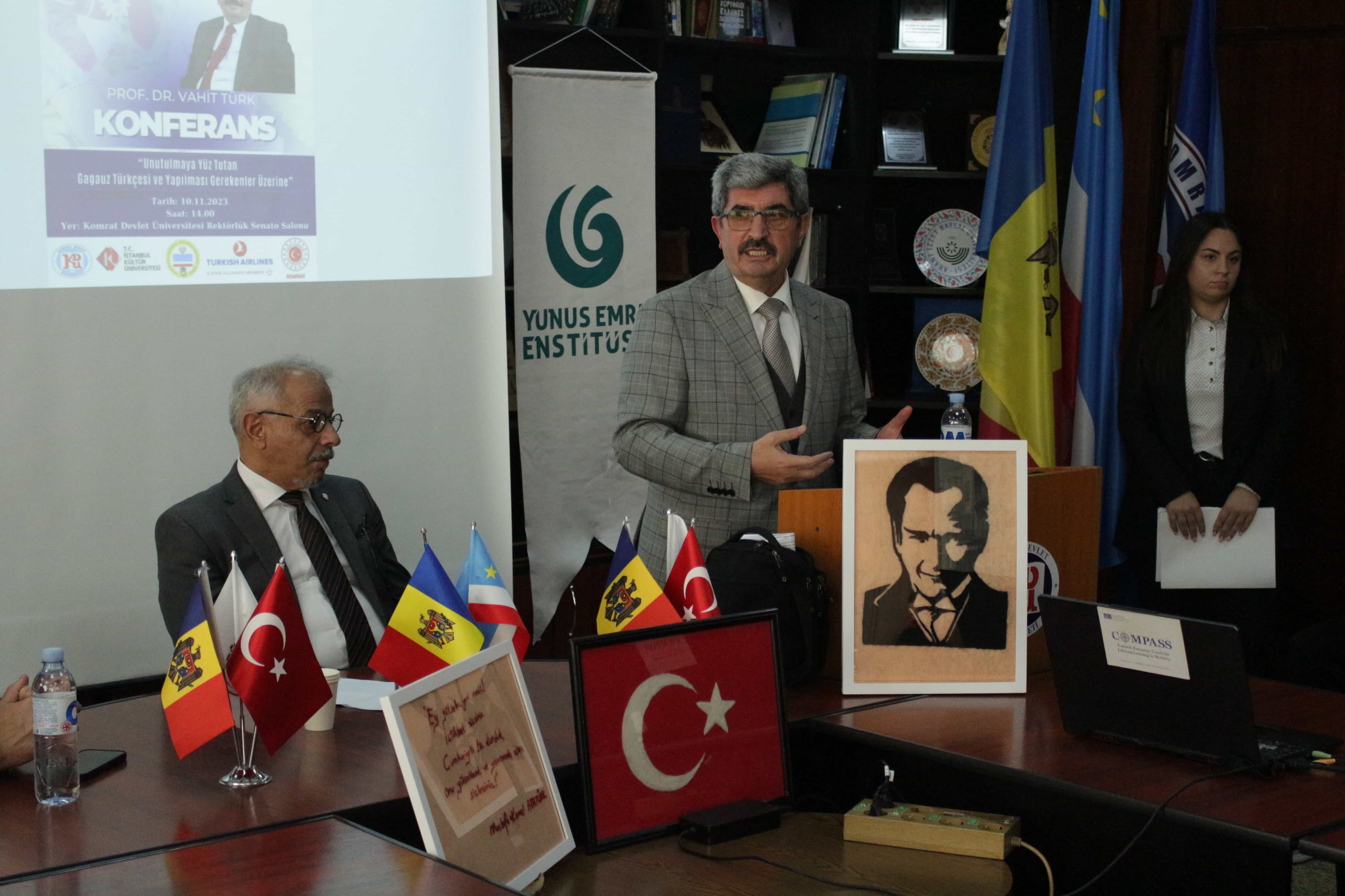 10 Kasım 2023 tarihinde Komrat Devlet Üniversitesi’nde senato salonunda T.C. Kişinev Büyükelçiliği Eğitim Müşavirliği Eğitim Diplomasisi Seminerleri kapsamında bir konferans düzenlendi. Türkiye'den gelen öğretim üyesi Prof. Dr. Vahit Türk, "Unutulmaya Yüz Tutan Gagauz Türkçesi ve Yapılması Gerekenler Üzerine" konulu bir konferans gerçekleştirdi. Türk, Gagauz dilinin önemini ve nesilden nesile korunması üzerine bilgi verdi.