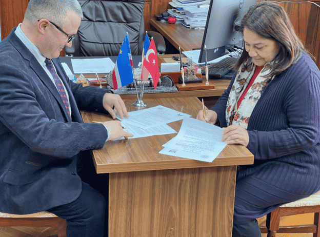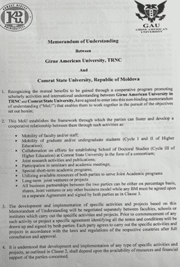 24 Nisan 2024 eğitim sektörü için önemli bir andı: Komrat Devlet Üniversitesi (KDU) ve Girne Amerikan Üniversitesi (GAÜ) bir Mutabakat Zaptı imzaladıklarını duyurdu. Bu Mutabakat Zaptı, dünya çapında eğitim ve bilimi ilerletmeyi amaçlayan iki kurum arasında derin bir işbirliği ve ortaklığın kapısını açıyor (uluslararasılaşma politikası çerçevesinde). Bu anlaşmanın önemli bir yönü de Girne Amerikan Üniversitesi ile Komrat Devlet Üniversitesi arasında ortak bir doktora okulu açılması planıdır. Bu adım, gelecekteki doktora öğrencilerinin her iki üniversite tarafından sunulan doktora programları çerçevesinde çift diploma alabilmeleri anlamına gelmektedir. Bu yaklaşım sadece yükseköğretime erişimi arttırmakla kalmıyor, aynı zamanda uluslararası akademik entegrasyon ve bilgi paylaşımına yönelik küresel arzuyu da destekliyor. Mutabakat Zaptı ayrıca her iki üniversitenin fakülteleri arasında eğitim değişimlerinin, ortak araştırma projelerinin ve deneyim ve uygulamaların paylaşımının geliştirilmesini de öngörmektedir. Bu da entelektüel potansiyelin ve kültürel anlayışın geliştirilmesi için elverişli bir ortam yaratıyor. KDU Rektörü Serhgei ZAHARIA, Doktor, Doçent bu işbirliğinin sadece kurumlar arasındaki bağları güçlendirmekle kalmayacağına, aynı zamanda öğrenciler, öğretmenler ve araştırmacılar için yeni fırsatlar yaratacağına olan inancını dile getirdi. Bu hamle, çeşitliliği ve küresel eğitimi desteklemeyi, uluslararası işbirliğini ve anlayışı teşvik etmeyi amaçlamaktadır.