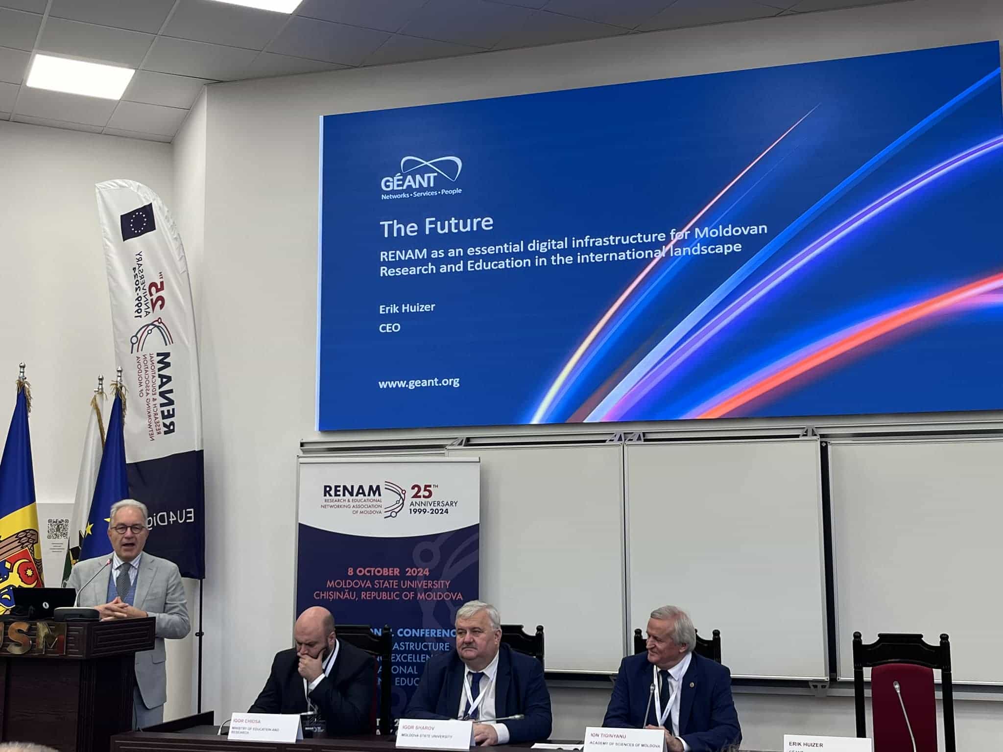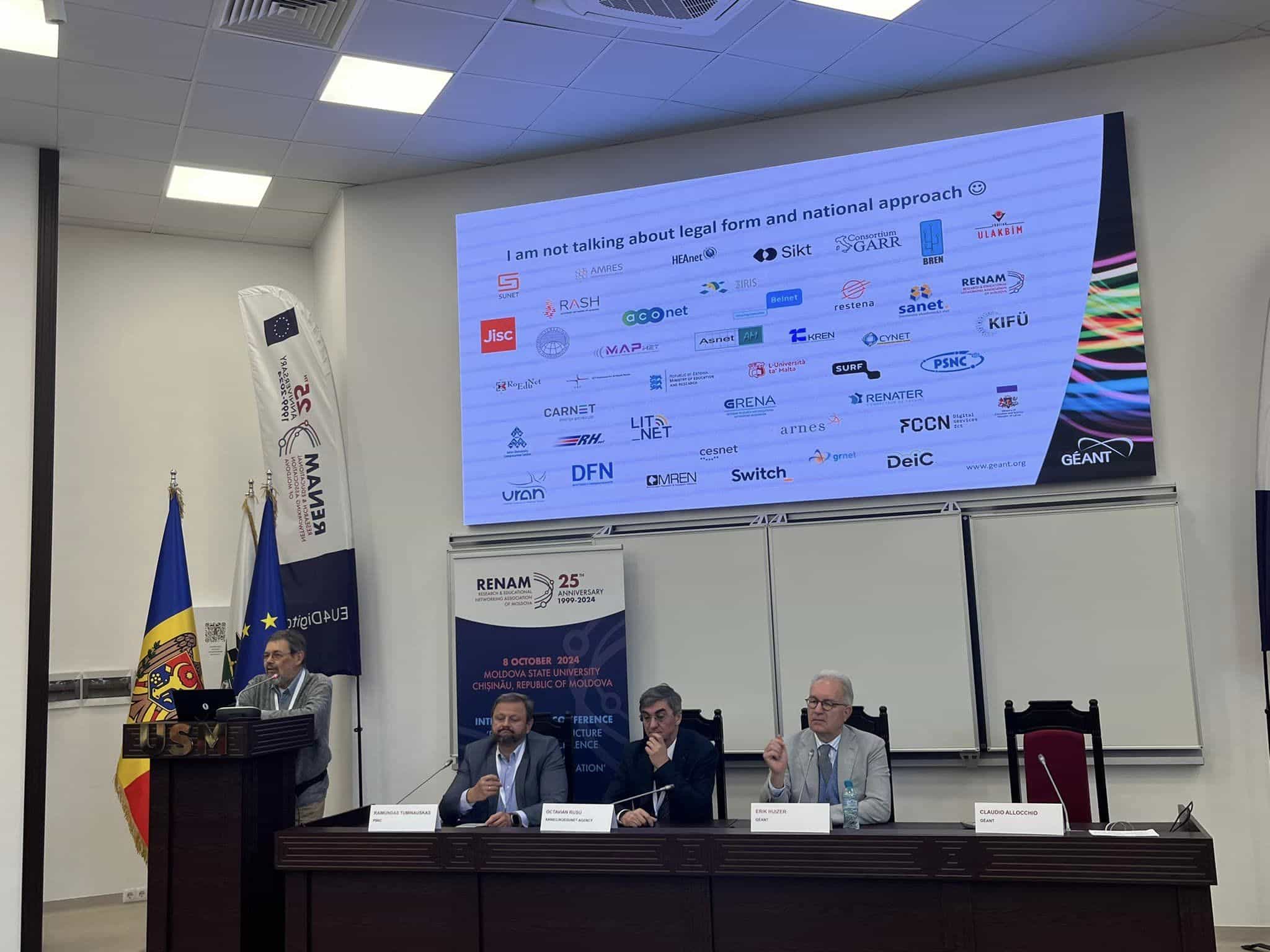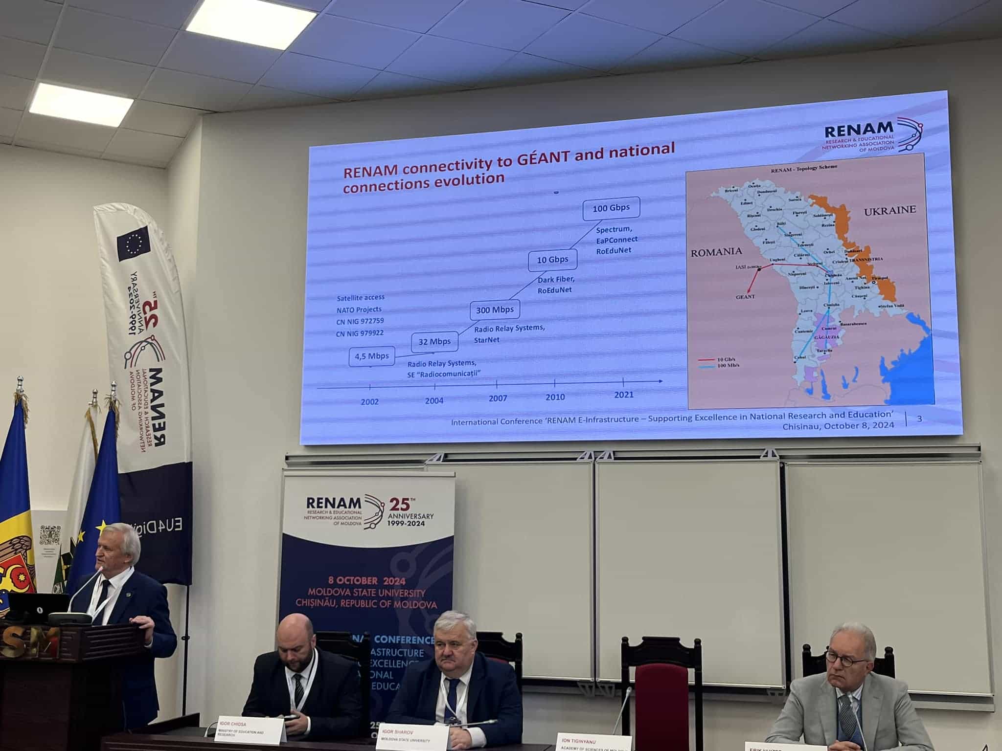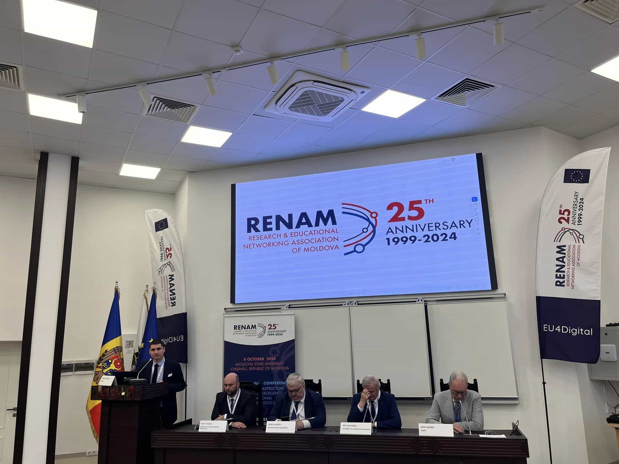 8 Ekim 2024 tarihinde, Ekonomi Bölümü Profesörü, Ekonomi Bilimleri Doktoru Alla Levitskaya ve Bilgi Teknolojileri, Matematik ve Fizik Bölümü Üniversite Konferansı Doktoru Tatyana Velikova, RENAM Derneği, Moldova Devlet Üniversitesi ve Avrupa genelindeki akademik ağ GÉANT tarafından Moldova Eğitim ve Araştırma Bakanlığı, Moldova Bilimler Akademisi’nin desteğiyle ve AB tarafından finanse edilen “EU4Digital: Araştırma ve Eğitim Topluluklarını Birleştirme (EaPConnect)” projesi kapsamında düzenlenen, RENAM Ulusal Araştırma ve Eğitim Ağı’nın 25. yıldönümüne adanmış “RENAM Elektronik Altyapısı - Ulusal Araştırma ve Eğitimde Mükemmelliği Destekleme” Uluslararası Konferansı’na katıldılar. Konferans, Moldova Devlet Üniversitesi’nde gerçekleşti. Konferansın yıldönümü olması nedeniyle, davetli konuşmacılar RENAM’ın kuruluşu, ağın gelişimi, ortaklar ve gelecekteki planlar hakkında konuştular. RENAM altyapısının eğitim ve bilimi desteklemesi, GEANT omurga ağı, GEANT hizmetleri, açık eğitim kaynakları ve AI aracılığıyla eğitimin dönüşümü ile ilgili konular ele alındı. Konferans katılımcıları, ulusal ve uluslararası uzmanlarla iletişim kurma fırsatı buldular. Konferansın tam programı şu bağlantıda mevcuttur: https://events.geant.org/event/1641 .