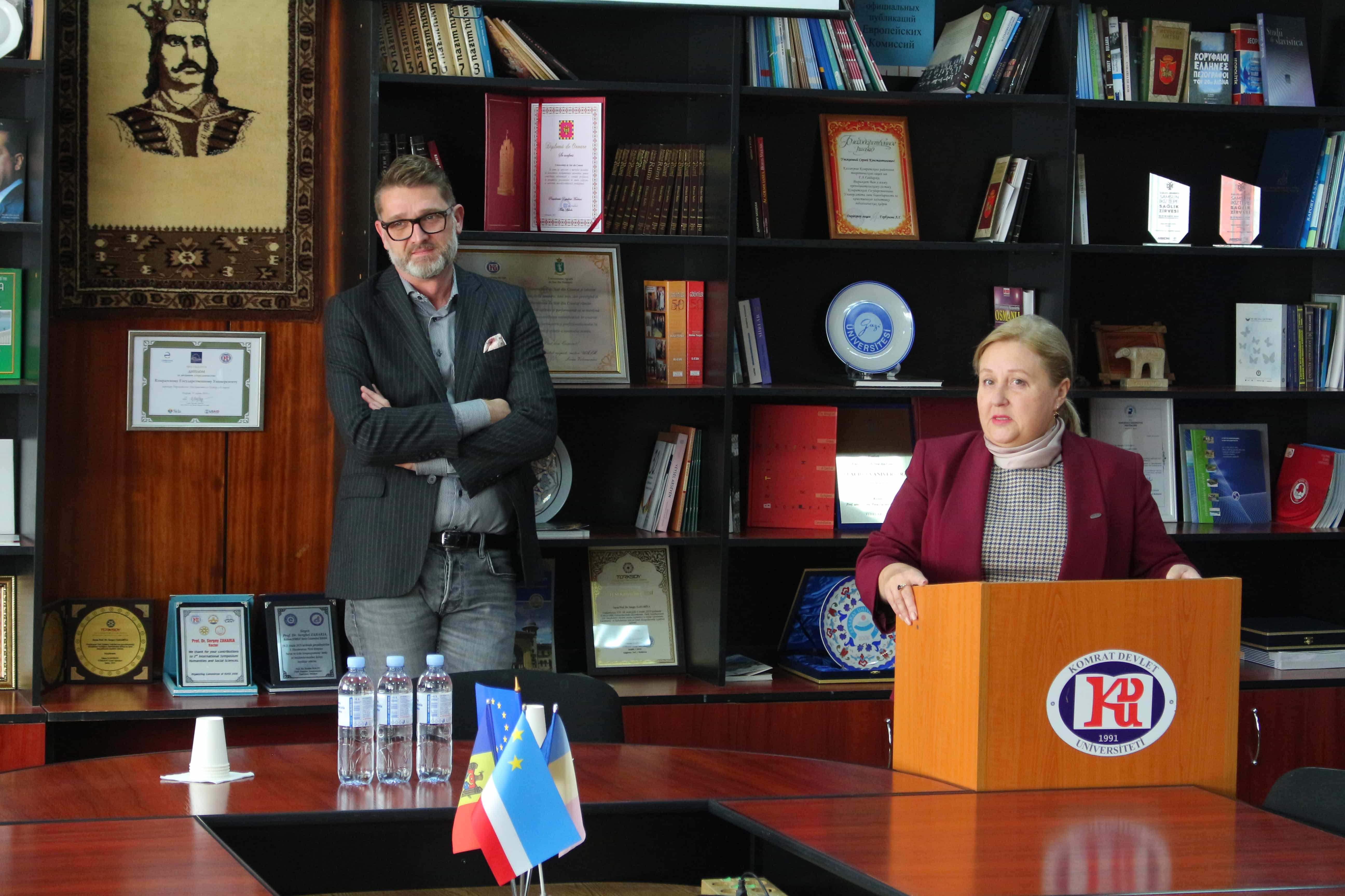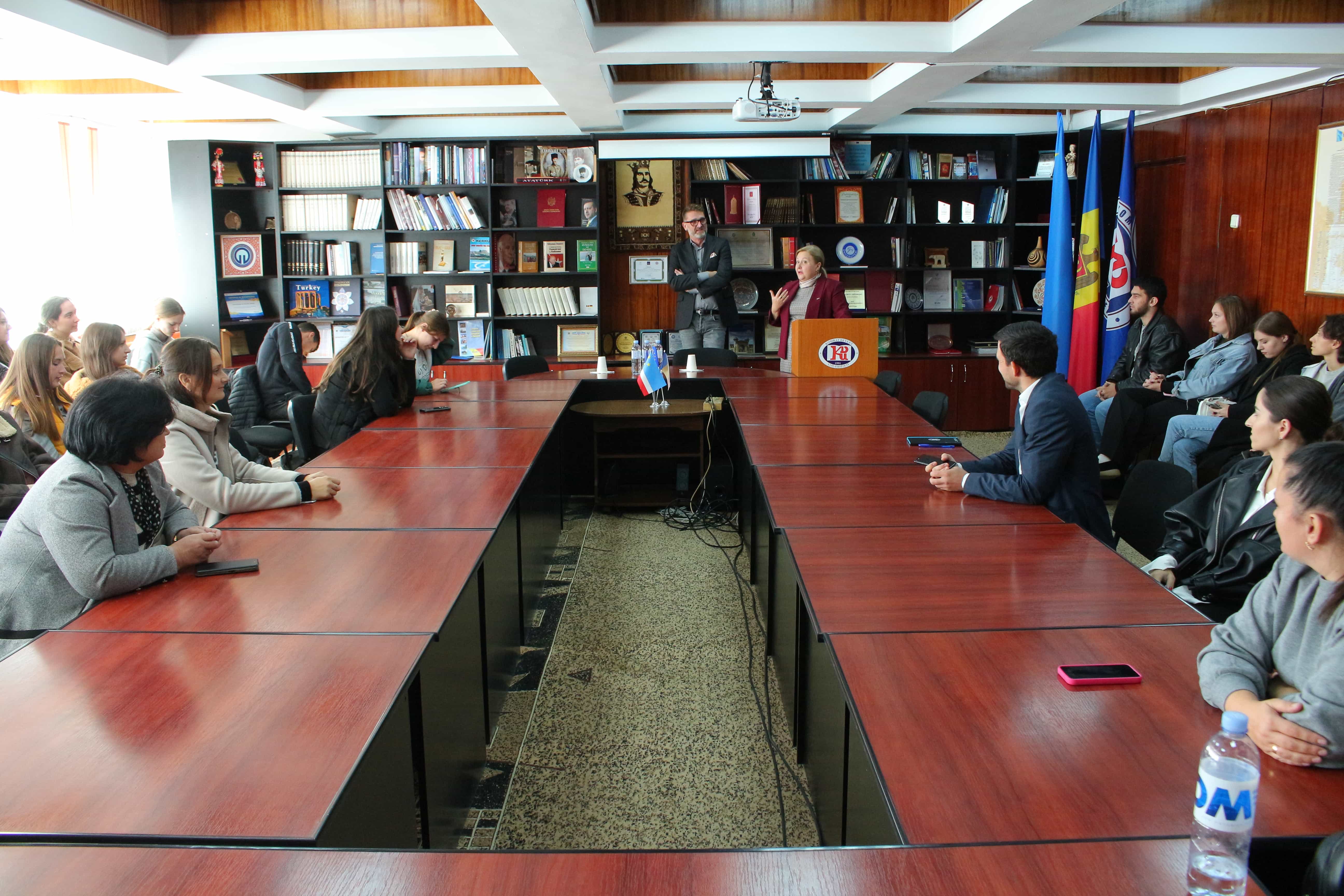 18 Ekim 2024 tarihinde Komrat Devlet Üniversitesi'nde Romanya'nın Moldova Cumhuriyeti Büyükelçisi Sayın Cristian-Leon Țurcanu ile öğrenciler hem lisans öğrencilerinden oluşan bir toplantı düzenlendi. Bu etkinlik, Moldova Cumhuriyeti'nin Avrupa'daki geleceğinin hem Avrupa Birliği'nin (AB) sunduğu fırsatların yanı sıra Romanya'nın entegrasyon süreçlerinde aktif bir katılımcı olarak rolünün tartışıldığı önemli bir platform haline geldi. Öğrenciler, Moldova Cumhuriyeti ile Avrupa ülkeleri arasında, özellikle de Avrupa Birliği üyesi Romanya ile işbirliği konusuna ilgi gösterdi. Toplantıda AB ülkelerinde eğitim, çalışma hem yaşamayla ilgili güncel konuların yanı sıra AB'nin resmi dili olan Rumence dilini öğrenmenin önemli yönü de gündeme getirildi. Toplantı katılımcıları Avrupa meseleleri konusunda derin bir farkındalık hem ilgi gösterdiler. Sayın Büyükelçi öğrencilerin yüksek düzeydeki hazırlıklarına dikkat çekti hem iletişimden duyduğu memnuniyeti dile getirdi. Öğrencilerin yönelttiği sorular yalnızca AB'deki eğitim hem mesleki beklentilerle ilgili değildi, aynı zamanda küreselleşme bağlamında küçük halkların (Gagavuz halkı dahil) kültürel hem dilsel geleneklerinin korunmasıyla da ilgiliydi. Büyükelçi, Avrupa entegrasyonunun bir kimlik kaybı olmadığını, aksine kişinin geleneklerini hem değerlerini istikrarlı hem müreffeh bir ortamda savunma fırsatı olduğunu vurguladı. Ayrıca kariyer gelişimine ilişkin kişisel deneyimlerini hem Avrupa fırsatlarının profesyonel yaşamında oynadığı rolü de paylaştı. Toplantının önemli bir kısmı KDU ile Romanya üniversiteleri arasında gelecekteki işbirliği projelerinin tartışılmasıydı. Bay Cristian-Leon Țurcanu, Romence dilini iyi bilmenin AB'de daha fazla eğitim hem mesleki fırsatlara erişim sağladığını hem bunun Moldova Cumhuriyeti'ndeki genç profesyoneller için başarılı bir gelecek inşa etmede önemli bir rol oynadığını belirtti. Moldova'nın Avrupa'daki geleceği konusu KDU öğrenci dinleyicilerinden canlı bir tepki uyandırdı. Öğrenciler Avrupa Birliği'nin avantajları hem entegrasyon yolunda halen var olan kaygılar konusunda görüşlerini paylaştılar.