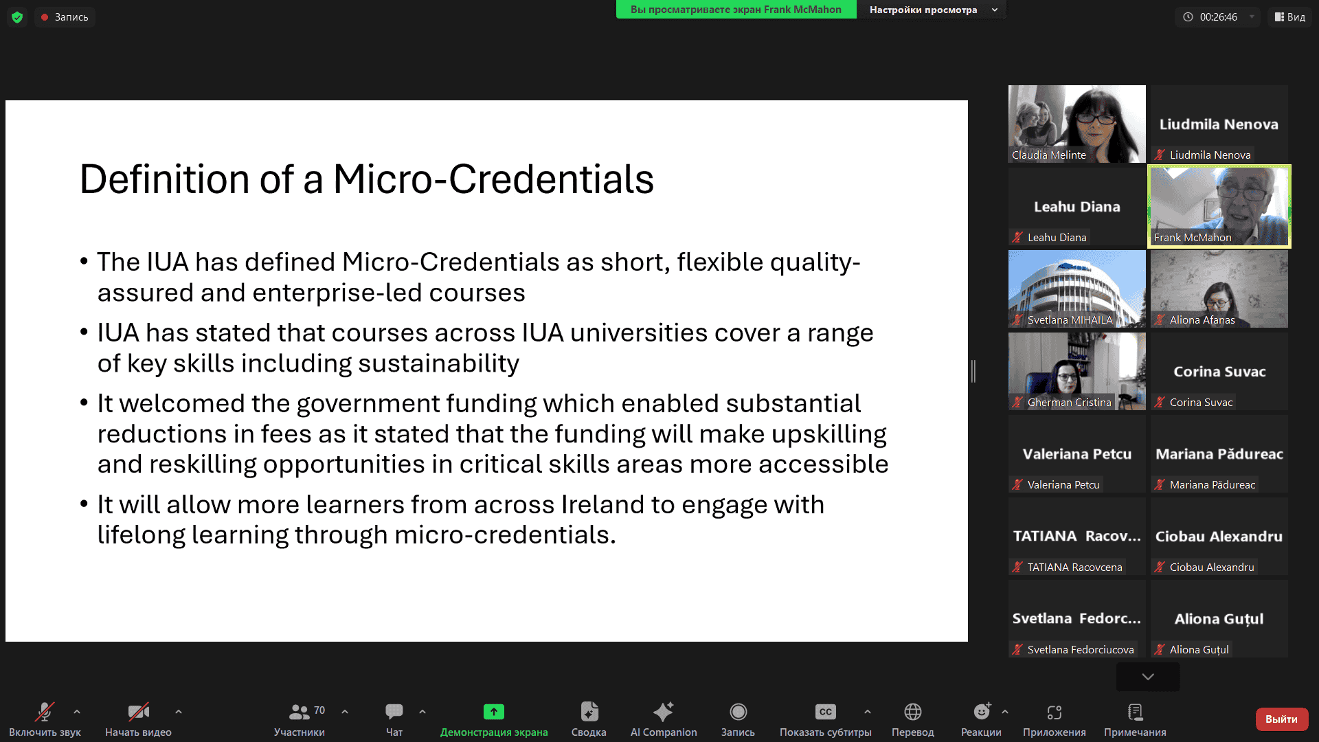 19 ralık 2024 tarihinde, Komrat Devlet Üniversitesi öğretim üyeleri hem Uluslararası İlişkiler ve Proje Faaliyetleri Bölüm, Moldovya Cumhuriyeti’nde Mikro-sertifikalar Aracılığıyla Eğitimin Önemini Artırma (Enhancing the Relevance of Education through Micro-credentials in the Republic of Moldova) başlıklı çevrimiçi seminere katıldı. Etkinlik, Moldova’daki Erasmus+ Ulusal Ofisi tarafından Moldova Cumhuriyeti Eğitim hem Araştırma Bakanlığı iş birliğiyle hem AB Delegasyonu’nun desteğiyle düzenlendi. Seminer, Avrupa Birliği’nin Erasmus+ programı çerçevesinde yükseköğretim reformu uzmanlarının çalışmaları kapsamında, SPHERE konsorsiyumu desteğiyle gerçekleştirildi. Seminerin amacı, Moldova’daki yükseköğretim kurumlarında eğitimin niteliğini hem önemini artırmak için mikro-sertifikaların uygulanma fırsatlarını tartışmaktı. Etkinliğin temel konuşmacısı, İrlanda Dublin Teknoloji Enstitüsü’nün eski Akademik İşler Direktörü olan Prof. Frank McMahon oldu. Konuşmasında, mikro-sertifikaların sürekli öğrenme hem iş gücü piyasasında rekabetçiliği artırmadaki Avrupa yaklaşımını ele aldı. Moldova üniversitelerinde mikro-sertifikaların uygulanması: yükseköğretim ile iş gücü piyasasının ihtiyaçları arasındaki bağlantıyı güçlendirebilir; tarım, biyofarmasötikler hem bilgi teknolojileri gibi temel ekonomik sektörlerin sürdürülebilir kalkınmasını destekleyecek kursların geliştirilmesine katkıda bulunabilir; Erasmus+ gibi uluslararası programlar sayesinde eğitim maliyetlerini düşürebilir. Komrat Devlet Üniversitesi’nin bu tür girişimlere katılımı, üniversitenin eğitimin modernizasyonuna yönelik uluslararası süreçlerin bir parçası olma arzusunu yansıtmaktadır. AB’li meslektaşlar hem Prof. McMahon gibi uzmanlarla yürütülen tartışmalar, üniversitenin şunları yapmasına yardımcı olmaktadır: öğrencileri modern iş gücü piyasasının zorluklarına hazırlamak; temel konular üzerine kısa hem uzmanlaşmış kurslar geliştirmek; modern öğrenme yaklaşımlarıyla sürekli mesleki gelişimi teşvik etmek.