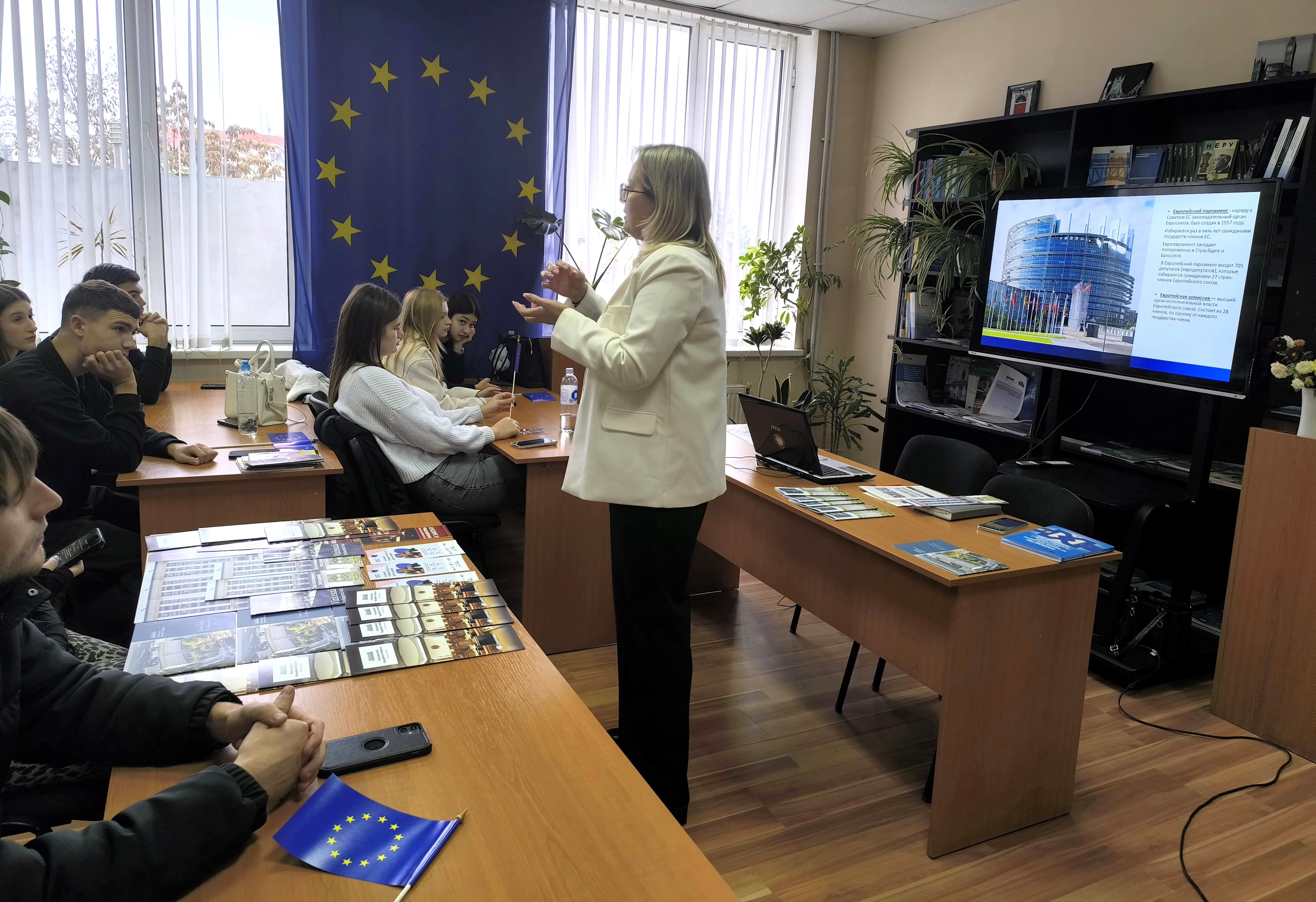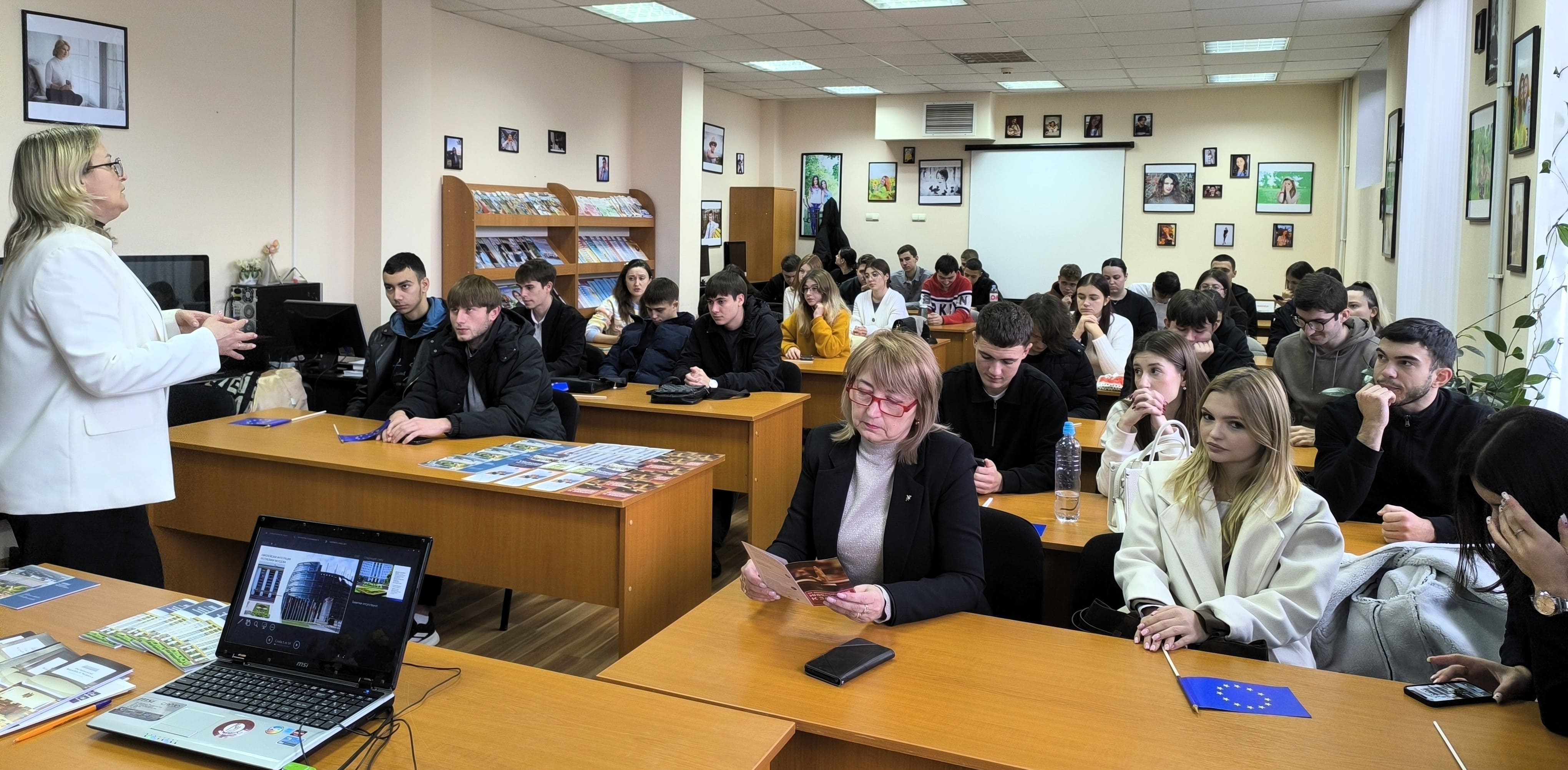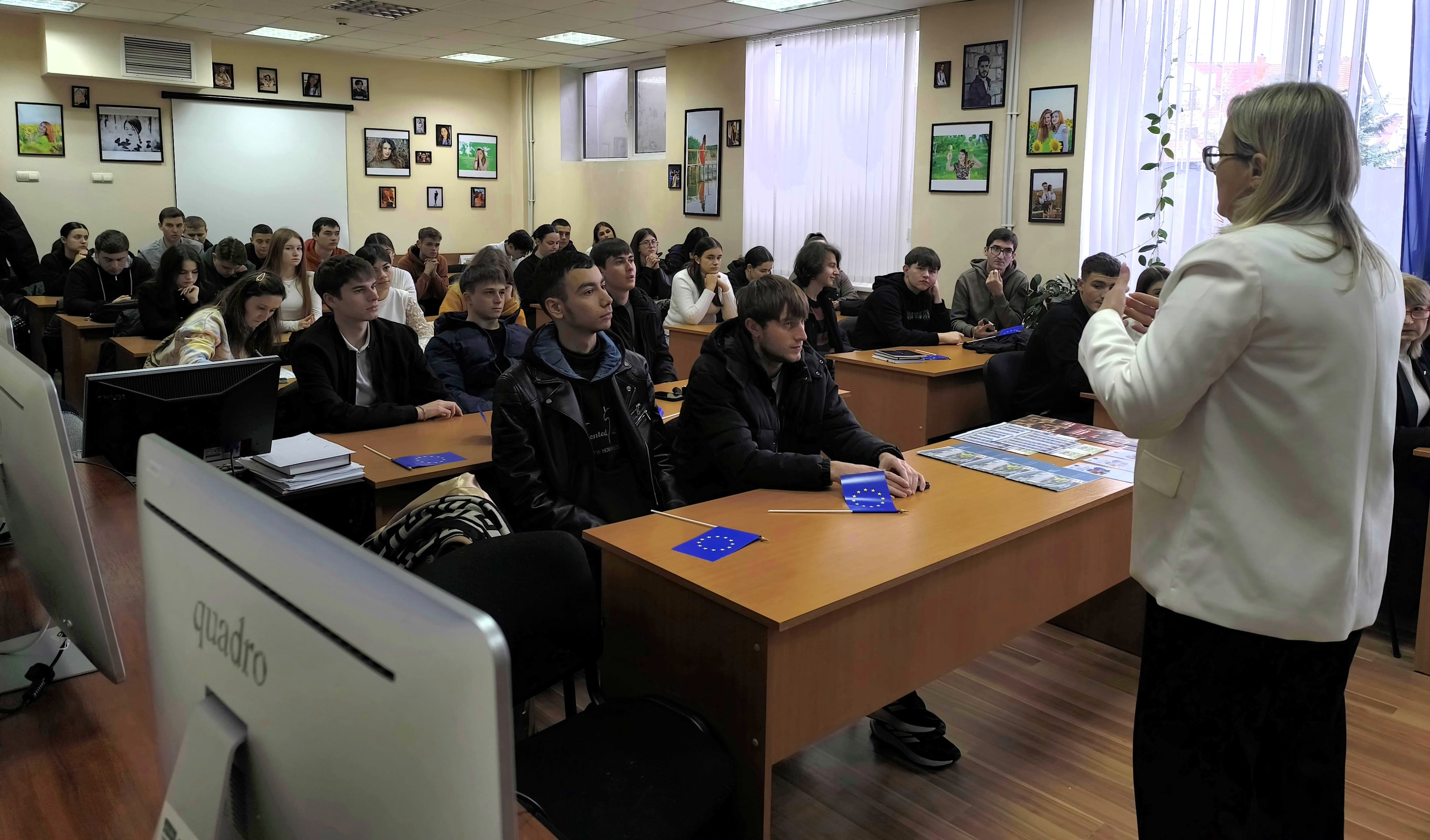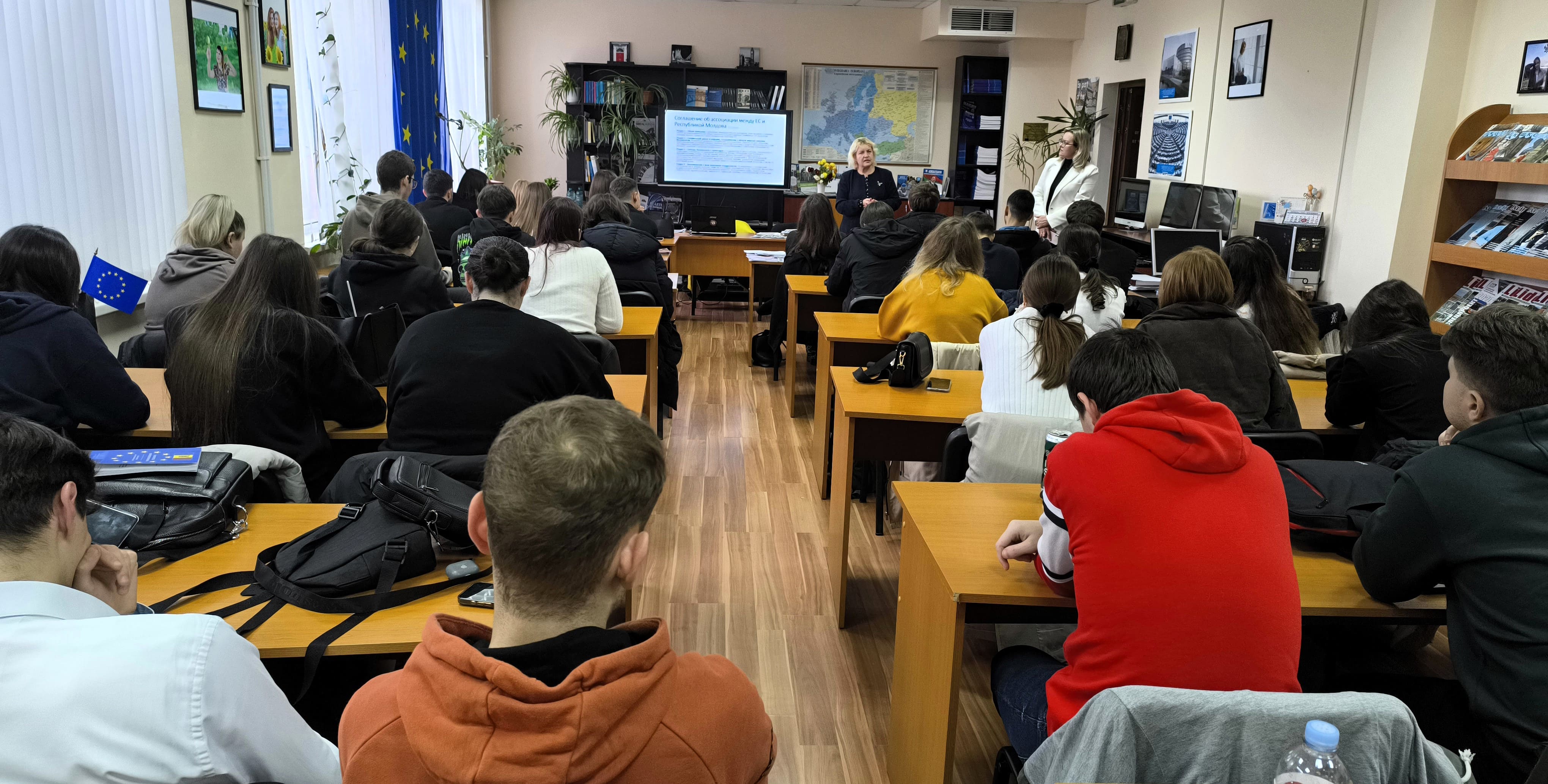 TIBP başdanışmanı Svetlana REGUȘ “Moldova Cumhuriyeti’nin Avrupa Entegrasyonu” başlıklı sunumuyla katılımcıları bilgilendirdi. Konuşmasından öğrenciler, Avrupa Parlamentosu ve Avrupa Mahkemesi’nin tarihi, AB–RM Ortaklık Anlaşmasının imzalanması, Moldova’nın AB adaylık statüsünü alması, ülkemizin yerine getirmesi gereken koşullar ve reformlar hakkında ilginç bilgiler edindi.