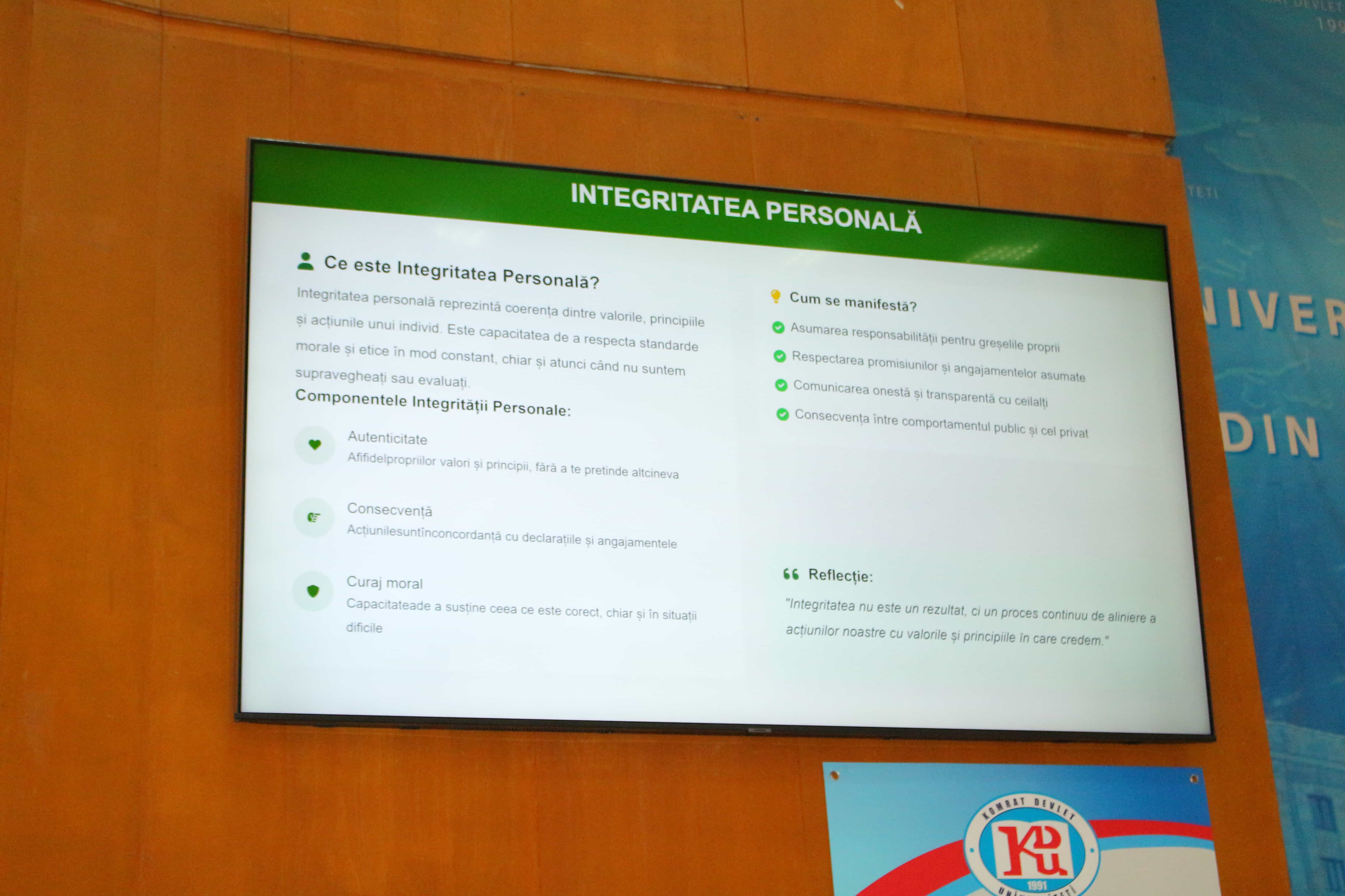 1 Aralık 2025 tarihinde, Moldova Cumhuriyeti Eğitim ve Araştırma Bakanlığı’nın desteğiyle Komrat Devlet Üniversitesi, eğitim sürecinin modernizasyonu ve akademik ortamda dürüstlük kültürünün güçlendirilmesi için temel nitelik taşıyan “Etik ve Akademik Dürüstlük” adlı üniversite dersini resmî olarak başlattı. Bu ders, Moldova Cumhuriyeti’ndeki tüm yükseköğretim kurumlarının öğrencilerine yönelik olup, etik yeterliliklerin, sorumlu davranışın ve öğrenim ile mesleki faaliyetlerde ahlaki risk durumlarını tespit etme becerisinin geliştirilmesini amaçlamaktadır. Bu dersin ilk katılımcıları, eğitime aktif bir şekilde dahil olan ve dürüstlük, adalet ve akademik sorumluluk değerlerine ilgi gösteren Ekonomi Fakültesi öğrencileri oldu. Dersler, Komrat Devlet Üniversitesi Hukuk Fakültesi Özel Hukuk Anabilim Dalı’nda üniversite okutmanı ve hukuk doktoru Anna Sakara ile Komrat Devlet Üniversitesi hukuk uzmanı Evghenii Hadji tarafından verildi. Onların rehberliğinde öğrenciler akademik etik ilkeleri konusunda bilgilerini derinleştirdi, pratik durumları tartıştı ve akademik dürüstlük ihlallerinin hukuki yönlerini analiz etti. Bu dersin başlatılması, Komrat Devlet Üniversitesi’nin öğrenciler ve öğretim üyeleri arasında etik, akademik dürüstlük ve sorumluluğu teşvik etme konusunda sağlam bir kararlılık üstlendiğini ve dürüstlük ile üniversite kurallarına saygının temel değerler olarak benimsendiği bir akademik topluluk oluşturmayı hedeflediğini göstermektedir. Üniversite, etikle ilgili eğitim girişimlerini geliştirmeye, akademik dürüstlük ihlallerinin önlenmesine yönelik faaliyetleri desteklemeye ve modern toplumun zorluklarıyla başa çıkabilecek dürüst ve sorumlu profesyoneller yetiştirmeye devam edecektir