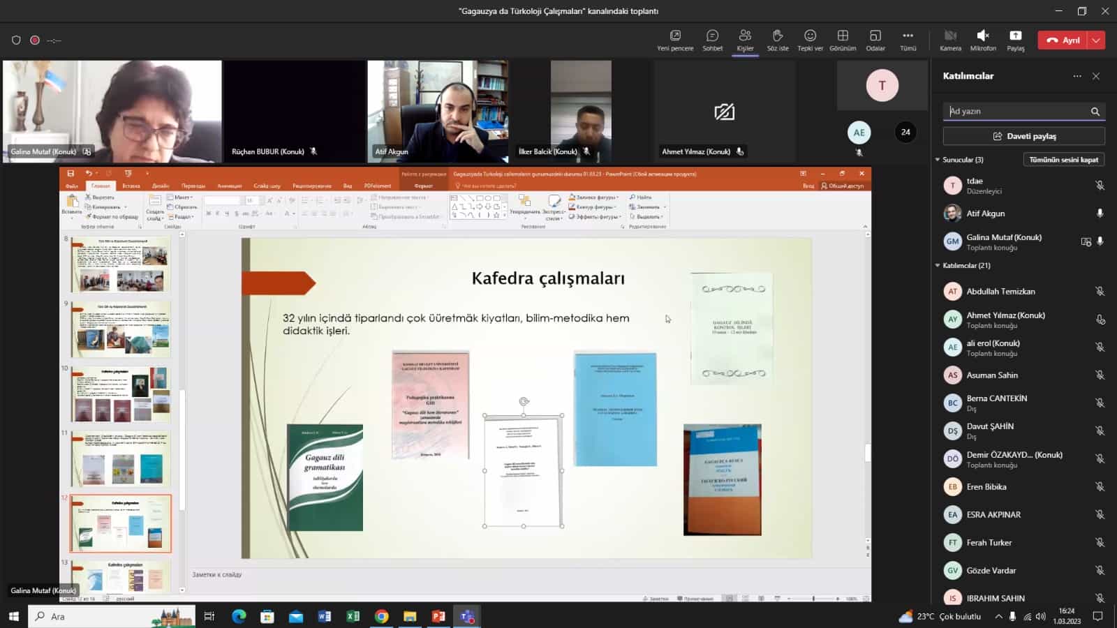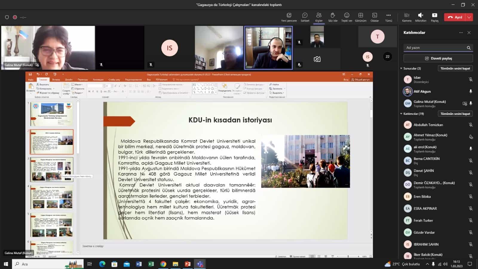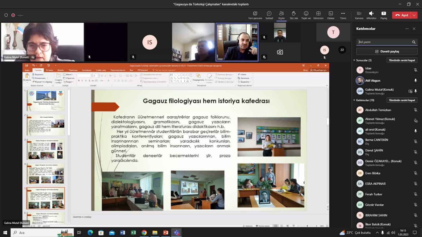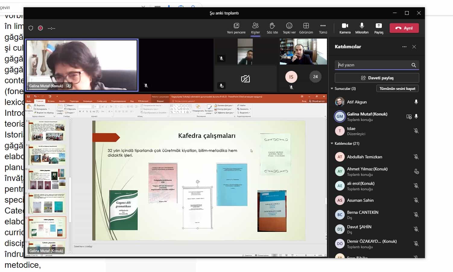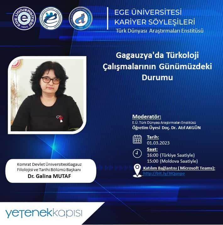 Mardın 1-dä 2023-cü yılda Ege Üniversitesi Türk Dünyası Araştırmalı Enstitüsündä (Türkiye) Gagauz filologiyası hem istoriya kafedrasının başı, doktor, üüretmen Mutaf G.N. "Gagauzya Yeri'nde Türkoloji Çalışmalarının Günümüzdeki Durumu" temaya bir söyleşileri geçirdi.