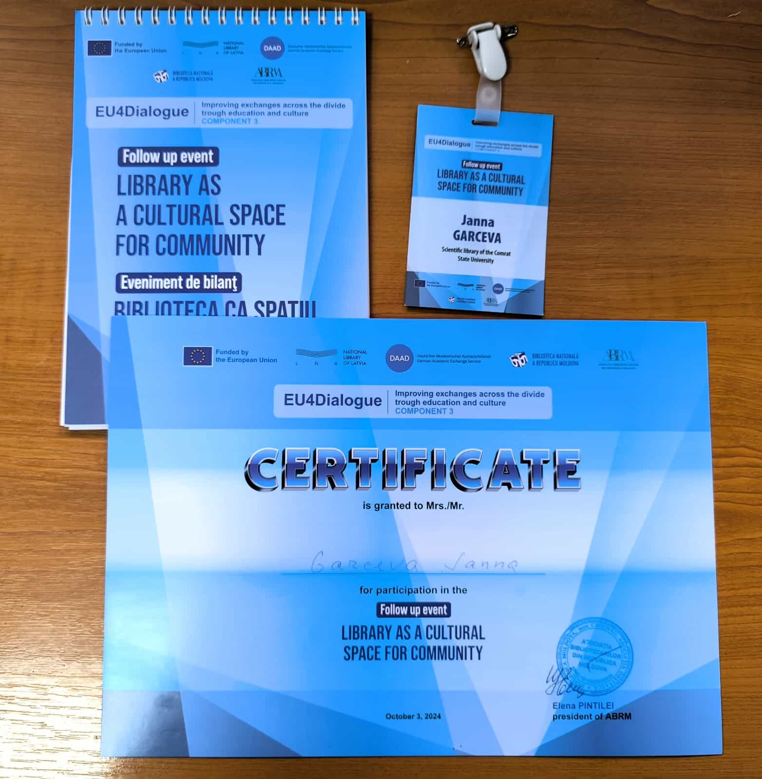 Moldova Cumhuriyeti Kütüphaneciler Derneği, Moldova Cumhuriyeti Milli Kütüphanesi ortaklığında, “EU4Dialogue: Projesi” çerçevesinde 3 Ekim 2024 tarihinde “Kamusal Kültür Alanı Olarak Kütüphane” başlıklı bir final etkinliği düzenledi: Deneyimi eğitim hem kültür yoluyla genişletmek.” 20-30 Ağustos 2023 tarihleri arasında Riga hem Cesis'te (Letonya) gerçekleştirilen Yaz Okulu sonuçları incelendi. Etkinlik, Letonya'dan uzmanların katılımıyla doğası gereği ulusötesi nitelikteydi hem kütüphane topluluğu için kütüphane alanının organizasyonu, kütüphaneciler hem kullanıcılar için beceri eğitimi gibi önemli konularda en iyi uygulamaların hem yenilikçi fikirlerin paylaşılması için bir platform sağladı. topluluklar, kütüphanelerde çevre projeleri, sürdürülebilirlik merkezlerinin organizasyonu vb. Sunumlar Letonya'nın Moldova Cumhuriyeti Büyükelçisi Sayın Edgars Bondars, Moldova Cumhuriyeti Milli Kütüphanesi Müdürü Bayan Elena Pinteley, uzmanları tarafından yapıldı. Letonya Milli Kütüphanesi, Moldova Cumhuriyeti, Azerbaycan hem Gürcistan'dan Yaz Okulu katılımcıları. Konuşmacılar, etkileşimin hem kültürel alışverişin temel faaliyetler hem güçlü yönler haline geldiği canlı hem dinamik bir ortam olarak kütüphanenin rolünü vurguladılar. “Komrat Devlet Üniversitesi Bilim Kütüphanesi hukuki araştırma projesine katılıyor” raporu KDU bilim kütüphanesi başkanı Zhanna Garcheva tarafından hazırlandı. Proje, Letonya Milli Kütüphanesi tarafından Avrupa Birliği'nin mali desteği hem DAAD (Alman Akademik Değişim Servisi) ile Moldova Cumhuriyeti Milli Kütüphanesi ortaklığında beş yıldır uygulanıyor.