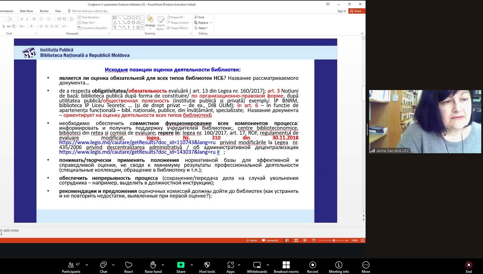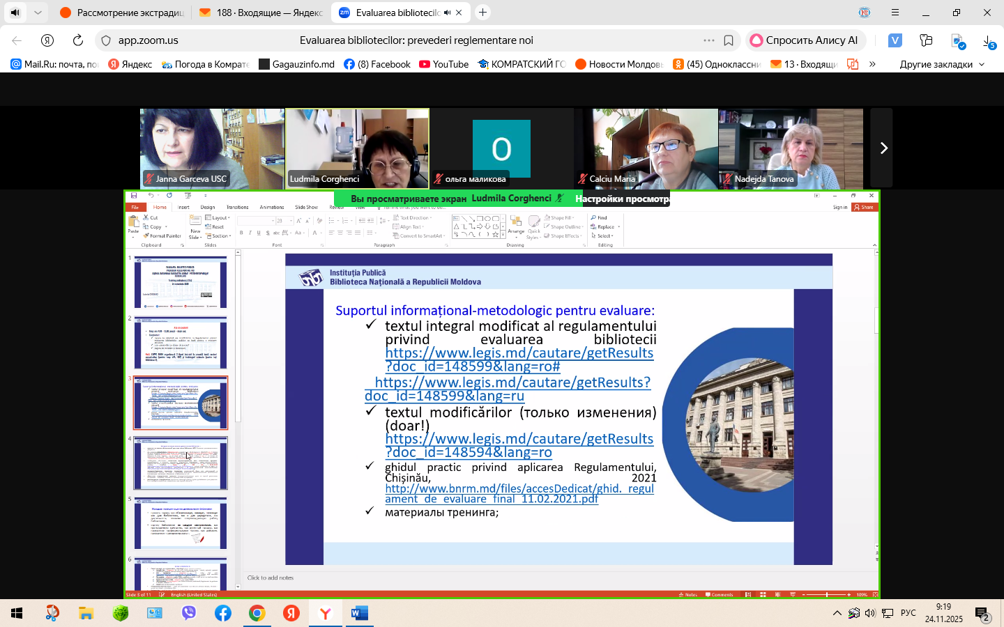 Bilimsel Kütüphane Müdürü Janna Garceva, 24 Kasım 2025’te Gagauzya, Taraklia ve Bessarabca’daki tüm kütüphaneler için düzenlenen “Halk Kütüphanelerinin Değerlendirilmesi: Yeni Düzenleyici Değişiklikler” adlı mesleki eğitime katıldı. Organizatörler: Ulusal Sürekli Mesleki Eğitim Merkezi (BNRM) ve Gagauzya P. Draganov Merkezi Kütüphanesi Eğitmenler: Tatiana Coseri ve Ludmila Corghenci Yönetmeliklere göre, Moldova Cumhuriyeti’ndeki tüm kütüphaneler faaliyetlerini her beş yılda bir değerlendirir. Kütüphane faaliyetlerinin değerlendirilmesi, sunulan hizmetlerin kalitesini ve kullanıcı ihtiyaçlarına uyumunu sağlaması açısından önemlidir. Bu değerlendirme, koleksiyon oluşturma, bütçe dağıtımı ve kurumun modernizasyonu ile ilgili kararlar için nesnel bir temel sağlar, aynı zamanda şeffaflığı artırır ve kurucuların sorumluluğunu güçlendirir.