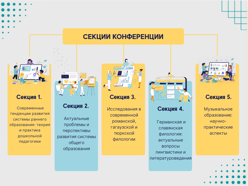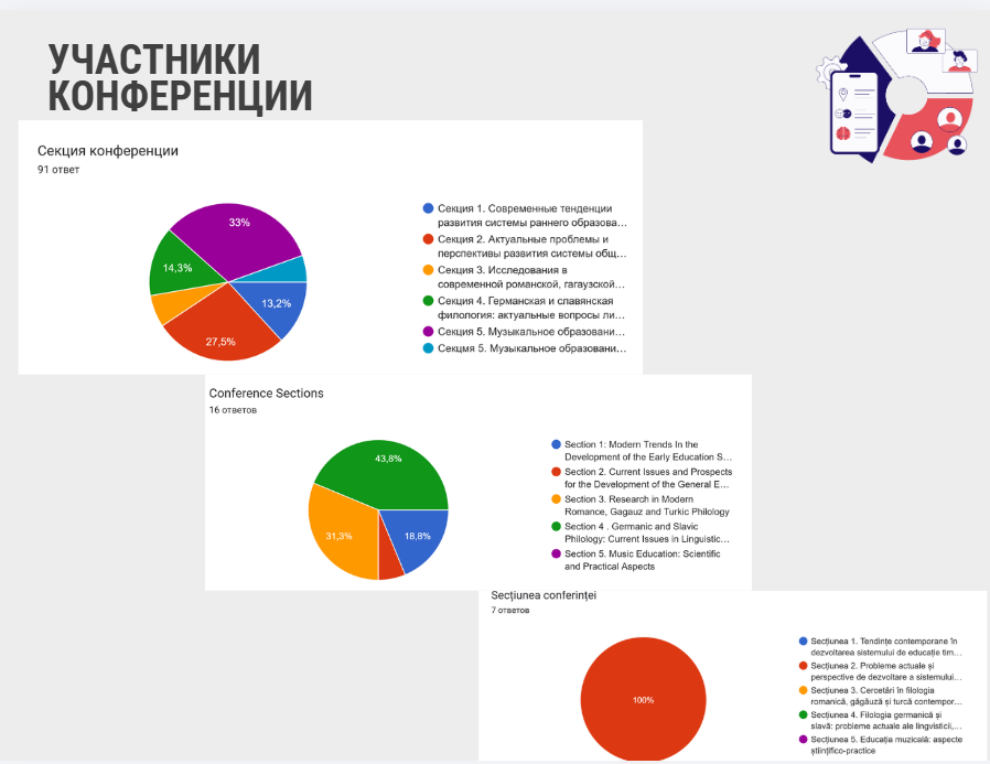 Activitatea conferinței s-a desfășurat în cadrul a cinci secțiuni, dedicate problemelor actuale ale educației timpurii, educației generale, filologiei romanice, găgăuze și turcice contemporane, filologiei germanice și slave, precum și educației muzicale. Această diversitate tematică le-a oferit participanților posibilitatea de a prezenta rezultate ale cercetărilor în domeniul pedagogiei, filologiei, transformării digitale a educației, practicilor incluzive, comunicării interculturale și formării muzical-pedagogice.