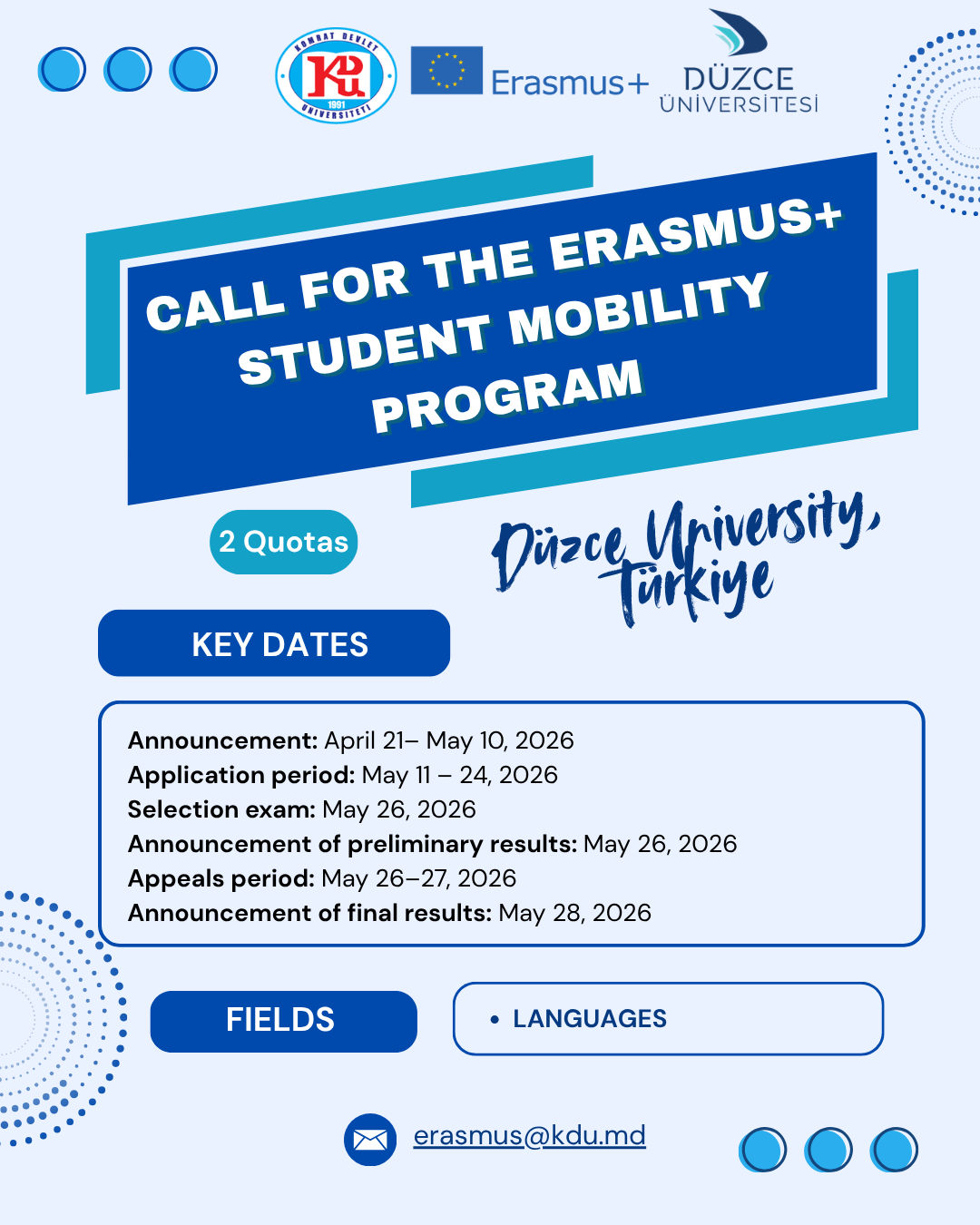 Universitatea de Stat din Comrat anunță cu plăcere lansarea apelului pentru depunerea candidaturilor la programul de mobilitate pentru stagii ale studenților la Universitatea Düzce (Türkiye), pentru anii academici 2025–2026 / 2026–2027, în cadrul programului Erasmus+ KA171 (număr proiect: 2025-1-TR01-KA171-HED-000344772).