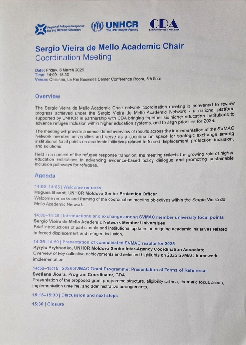 La data de 6 martie 2026, la Chișinău a avut loc o întâlnire de coordonare în cadrul inițiativei Sergio Vieira de Mello Academic Chair Network (SVMAC) și CDA. Evenimentul a reunit reprezentanți ai universităților care implementează proiecte în cadrul rețelei, precum și organizații partenere. În cadrul întâlnirii a fost prezentată o sinteză generală a rezultatelor implementării inițiativei SVMAC la nivel național. Reprezentanții universităților participante au prezentat rezultatele proiectelor finalizate în octombrie 2025, inclusiv inițiative educaționale, de cercetare și de informare, axate pe problematica deplasării forțate, protecția drepturilor refugiaților și integrarea lor socială. Dr. habil., conferențiar universitar al Catedrei de Drept Privat a Universității de Stat din Comrat, Natalia Șciuchina, a prezentat experiența pozitivă de implementare a unui proiect realizat cu sprijinul Sergio Vieira de Mello Academic Chair (SVMAC) și administrat de Centrul de Drept al Avocaților (CDA) în perioada mai–noiembrie 2025, în parteneriat cu Universitatea de Stat din Comrat, Universitatea de Stat din Cahul și centrele comunitare din Comrat și Cahul. Conducătorul proiectului a fost dr. habil., prof. univ. A. Levitskaia; expert – dr. habil., prof. univ. Natalia Șciuchina; precum și colegii din universitatea parteneră – dr. în economie, conf. univ. L. Roșca-Sadurska; Kaleji-Pogirk V., Kebak A. și Kirila A., reprezentanți ai centrelor comunitare. În cadrul proiectului a fost elaborat un raport analitic privind atitudinea studenților față de refugiați și apatrizi, nivelul de informare asupra problemelor deplasării forțate, experiența interacțiunii interculturale, precum și identificarea factorilor și barierelor care influențează procesele de integrare socială și educațională. Studiul a cuprins studenți ai Universității de Stat din Comrat și ai Universității de Stat din Cahul, incluzând atât studenți locali (187 persoane), cât și studenți cu statut de refugiat sau aflați sub protecție temporară (23 persoane). Această abordare a permis analizarea atât a percepțiilor studenților locali, cât și a experiențelor directe, nevoilor și dificultăților studenților străini în procesul de studiu și integrare în mediul academic. Raportul prezentat oferă o analiză generalizată a datelor colectate și permite identificarea barierelor existente și a direcțiilor posibile de dezvoltare a inițiativelor educaționale și de integrare în mediul universitar. O atenție deosebită a fost acordată rolului instituțiilor de învățământ superior în promovarea accesului incluziv la educația superioară pentru refugiați, dezvoltării cercetării academice în domeniul deplasării forțate, precum și consolidării cooperării între universități, organizații internaționale și alte părți interesate. Întâlnirea a constituit, de asemenea, o platformă de schimb strategic de opinii între coordonatorii instituționali ai universităților privind dezvoltarea ulterioară a inițiativelor academice legate de protecția, incluziunea și identificarea soluțiilor durabile pentru refugiați. Participanții și-au prezentat viziunea asupra continuării activităților rețelei în 2026 și au discutat direcțiile posibile de cercetare în domeniul refugiaților și al deplasării forțate în Republica Moldova. De asemenea, în cadrul întâlnirii, coordonatoarea de programe CDA, Svetlana Jioara, a prezentat informații despre programul planificat de granturi în cadrul rețelei Sergio Vieira de Mello Academic Chair Network, inclusiv structura programului, criteriile de participare și selecție, precum și principalele domenii tematice vizate.