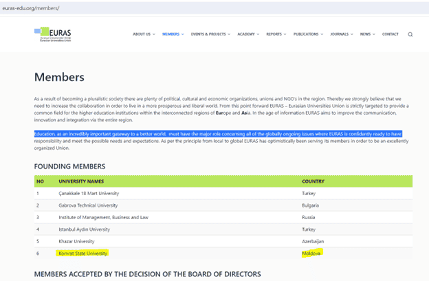 La 22 mai 2024, Universitatea de Stat din Comrat (USC) a participat la reuniunea online a membrilor Consiliului Executiv al Asociației Eurasiatice a Universităților (EURAS). La eveniment au participat reprezentanți ai diferitelor universități partenere, care au discutat probleme importante și priorități pentru perioada următoare. Reuniunea a fost deschisă de președintele EURAS și EURIE, Dr. Mustafa Aydın, profesor asociat, care a prezentat principalele direcții și priorități de cooperare între universitățile membre ale asociației pentru perioada 2024-2028. Printre obiectivele cheie, s-au numărat: