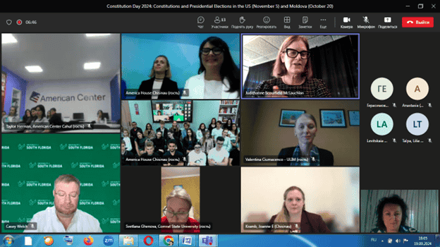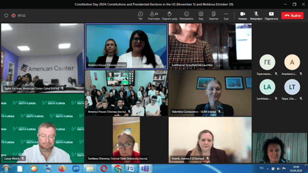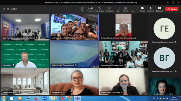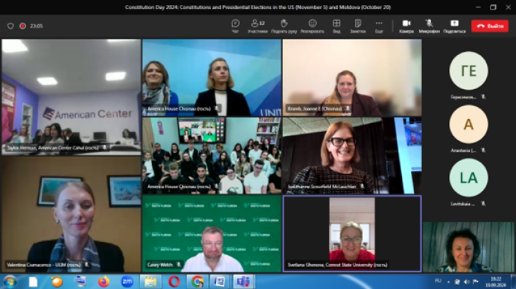 Pe data de 19 septembrie 2024, studenți și cadrele didactice ai Universității de Stat din Comrat au participat la un telepod între Statele Unite ale Americii (SUA) și Republica Moldova pe tema „Alegerile constituționale din Statele Unite ale Americii din 5 noiembrie 2024 și alegerile prezidențiale din Republica Moldova din 20 octombrie 2024”. În cadrul telepodului au fost prezentate principalele acte legislative ale SUA și Republicii Moldova, structura acestora, procedura de modificare și specificitățile aplicării. S-au discutat întrebări legate de alegerile viitoare, limita de vârstă pentru președinte și alte teme actuale. Participanții la telepod au fost Universitatea din Florida de Sud (USF), reprezentantul Ambasadei Chișinăului – atașatul educațional al Ambasadei SUA, Joanna E. KRAMB, Universitatea de Stat din Comrat (USC), Universitatea de Stat din Moldova (MSU), Universitatea Independentă Internațională a Moldovei (ULIM) și Centrul Cultural American (America House) din Chișinău. Întâlnirea a fost deschisă de profesorul Universitatea din Florida de Sud (USF), prof. Judithanne MCLAUCHLAN, care a prezentat programul evenimentului și participanții din partea americană. Din partea Universității de Stat din Comrat, prorectorul pentru activitatea științifică și relații internaționale, dr., conf. univ. Svetlana GHENOVA, a prezentat participanții și a exprimat disponibilitatea de a continua colaborarea cu Universitatea din Florida de Sud în diverse domenii. După cuvântul de salut, prof. Lia BUTUCEL (Universitatea de Stat din Moldova) a vorbit despre Constituția Republicii Moldova, iar Constituția Americană a fost prezentată de prof. Judithanne MCLAUCHLAN (USF St Petersburg, fost Fulbrighter în Moldova, la ULIM) și vice-cancelarul Casey WELCH (USF Sarasota-Manatee). Administrația Universității de Stat din Comrat mulțumește Universitatea din Florida de Sud (USF) și Centrului Cultural American (America House) din Chișinău pentru organizarea telepodului între Statele Unite ale Americii și Republica Moldova și speră la o colaborare viitoare în activitatea educațională și de cercetare.