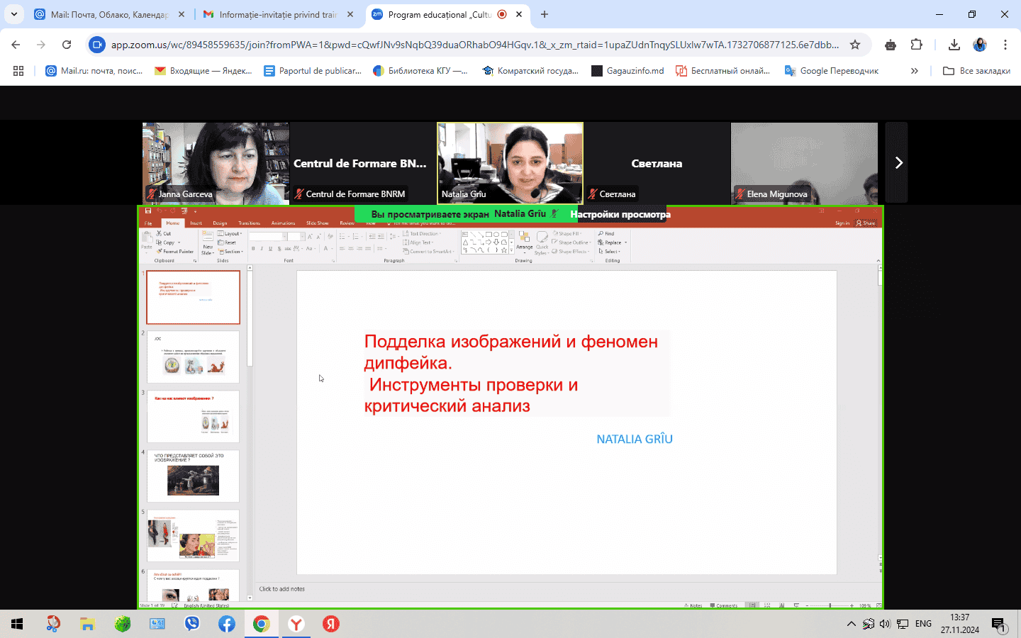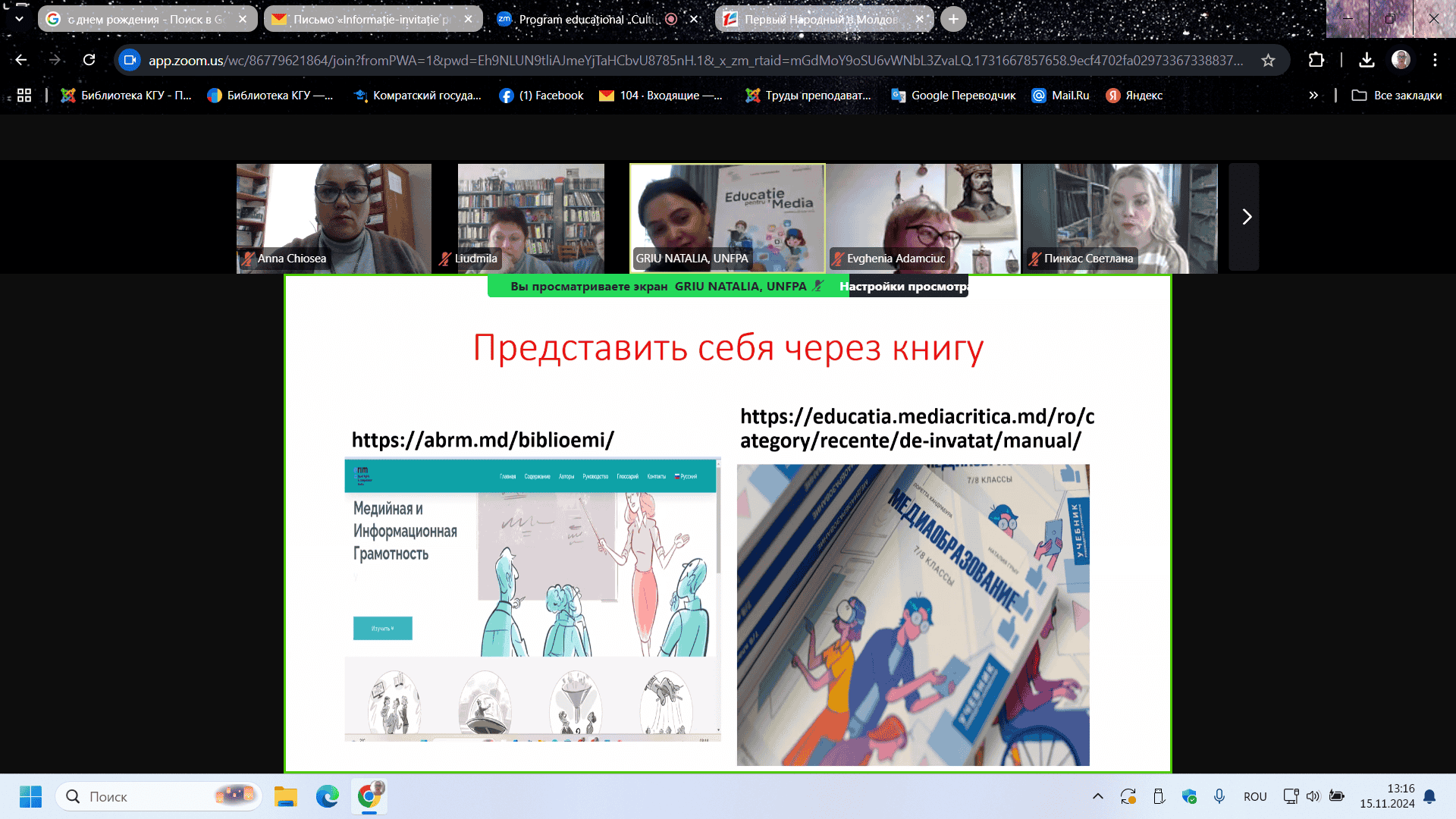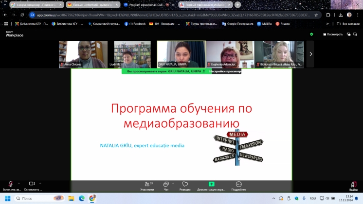 Instruirea profesională online, desfășurată pe parcursul a trei sesiuni în zilele de 15, 22 și 27 noiembrie 2024, a fost susținută de expertul în educație Natalia Grîu. În cadrul instruirii, participanții au explorat concepte precum „Educație Media,” „Competența Media” și „Funcțiile Media.” Aceștia au aprofundat cunoștințele despre funcțiile și tipurile de mass-media, rolul acestora și conceptul de „consum media responsabil.” De asemenea, programul a abordat rolul mass-media în formarea opiniei publice și promovarea educației media în comunități. Bibliotecarii și-au îmbunătățit înțelegerea importanței educației media în societatea modernă și și-au exprimat disponibilitatea de a dezvolta și susține inițiative de alfabetizare media în rândul utilizatorilor bibliotecii. Participanții au învățat să analizeze și să evalueze știrile din perspective diferite pentru a înțelege mai bine cum se formează informațiile și impactul acestora asupra societății. Au identificat caracteristicile mesajului informativ, structura acestuia, diferențele dintre fapte și opinii, metodele de verificare a surselor și au analizat limbajul și tonul știrilor. Un subiect deosebit de actual a fost „Falsificarea imaginilor și fenomenul deepfake-urilor: Instituții de verificare și analiză critică.” Participanții au considerat util și interesant să afle cum să deosebească o fotografie autentică de una falsificată cu ajutorul inteligenței artificiale, precum și ce instrumente pot fi utilizate pentru verificarea falsurilor. Toate sesiunile s-au încheiat cu exerciții practice pentru consolidarea cunoștințelor dobândite. La instruirea online au participat bibliotecari din toate tipurile de biblioteci din Republica Moldova, evidențiind importanța programului în promovarea alfabetizării media. Biblioteca Științifică a Universității de Stat din Comrat mulțumește organizatorilor și expertului Natalia Griu pentru oportunitatea de a participa la această instruire valoroasă și semnificativă.