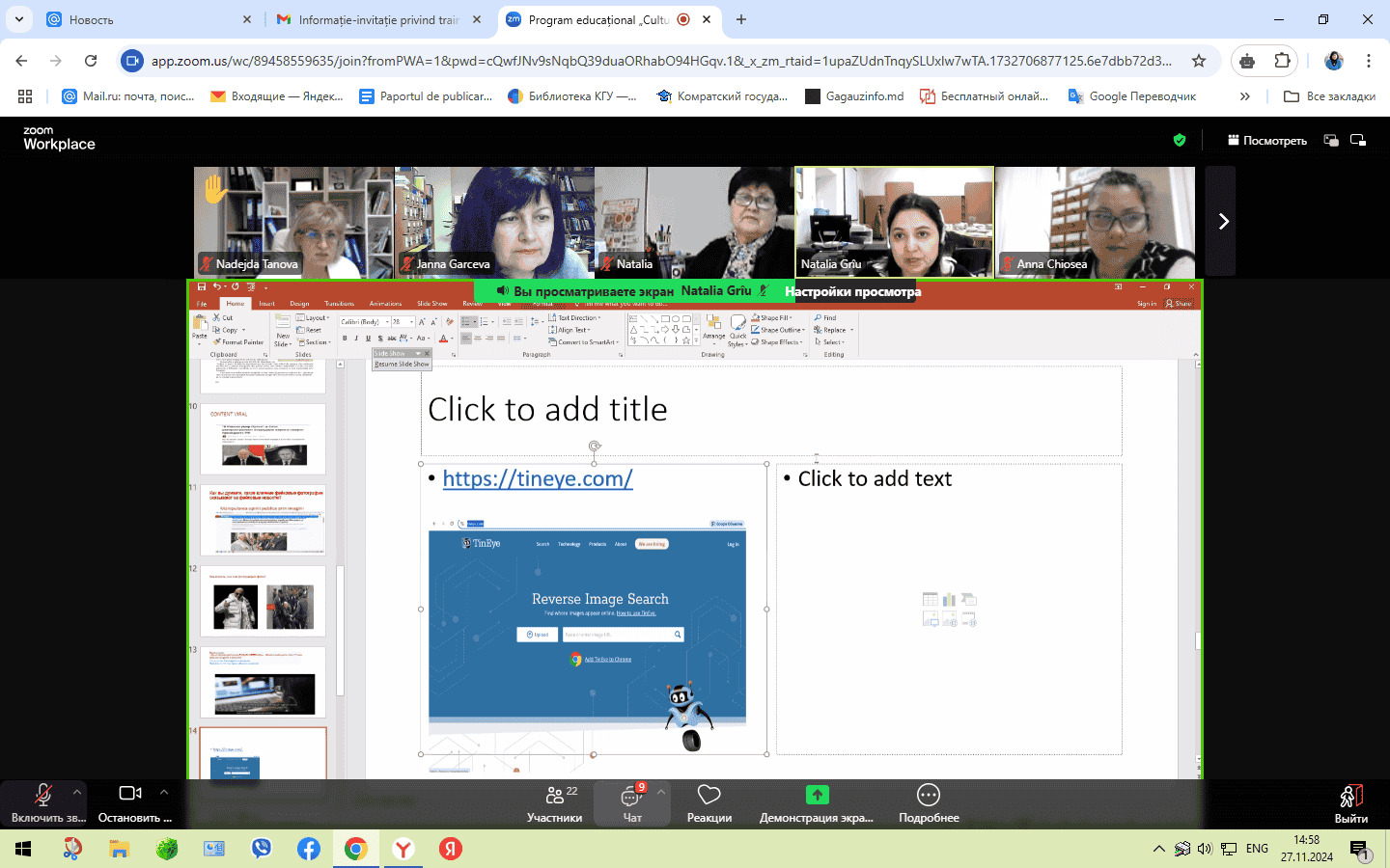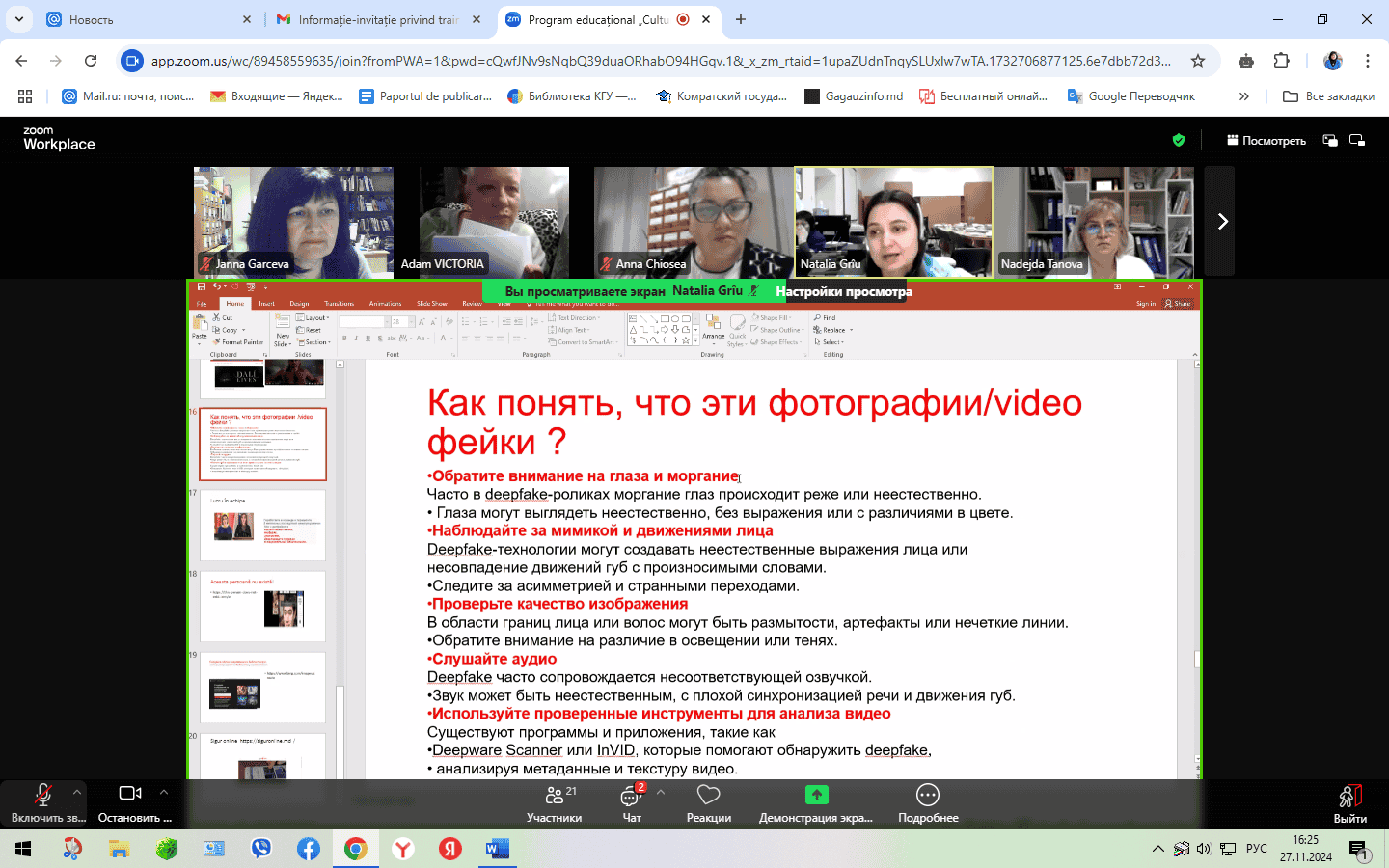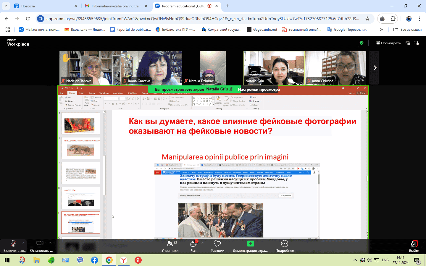 Instruirea profesională online, desfășurată pe parcursul a trei sesiuni în zilele de 15, 22 și 27 noiembrie 2024, a fost susținută de expertul în educație Natalia Grîu. În cadrul instruirii, participanții au explorat concepte precum „Educație Media,” „Competența Media” și „Funcțiile Media.” Aceștia au aprofundat cunoștințele despre funcțiile și tipurile de mass-media, rolul acestora și conceptul de „consum media responsabil.” De asemenea, programul a abordat rolul mass-media în formarea opiniei publice și promovarea educației media în comunități. Bibliotecarii și-au îmbunătățit înțelegerea importanței educației media în societatea modernă și și-au exprimat disponibilitatea de a dezvolta și susține inițiative de alfabetizare media în rândul utilizatorilor bibliotecii. Participanții au învățat să analizeze și să evalueze știrile din perspective diferite pentru a înțelege mai bine cum se formează informațiile și impactul acestora asupra societății. Au identificat caracteristicile mesajului informativ, structura acestuia, diferențele dintre fapte și opinii, metodele de verificare a surselor și au analizat limbajul și tonul știrilor. Un subiect deosebit de actual a fost „Falsificarea imaginilor și fenomenul deepfake-urilor: Instituții de verificare și analiză critică.” Participanții au considerat util și interesant să afle cum să deosebească o fotografie autentică de una falsificată cu ajutorul inteligenței artificiale, precum și ce instrumente pot fi utilizate pentru verificarea falsurilor. Toate sesiunile s-au încheiat cu exerciții practice pentru consolidarea cunoștințelor dobândite. La instruirea online au participat bibliotecari din toate tipurile de biblioteci din Republica Moldova, evidențiind importanța programului în promovarea alfabetizării media. Biblioteca Științifică a Universității de Stat din Comrat mulțumește organizatorilor și expertului Natalia Griu pentru oportunitatea de a participa la această instruire valoroasă și semnificativă.