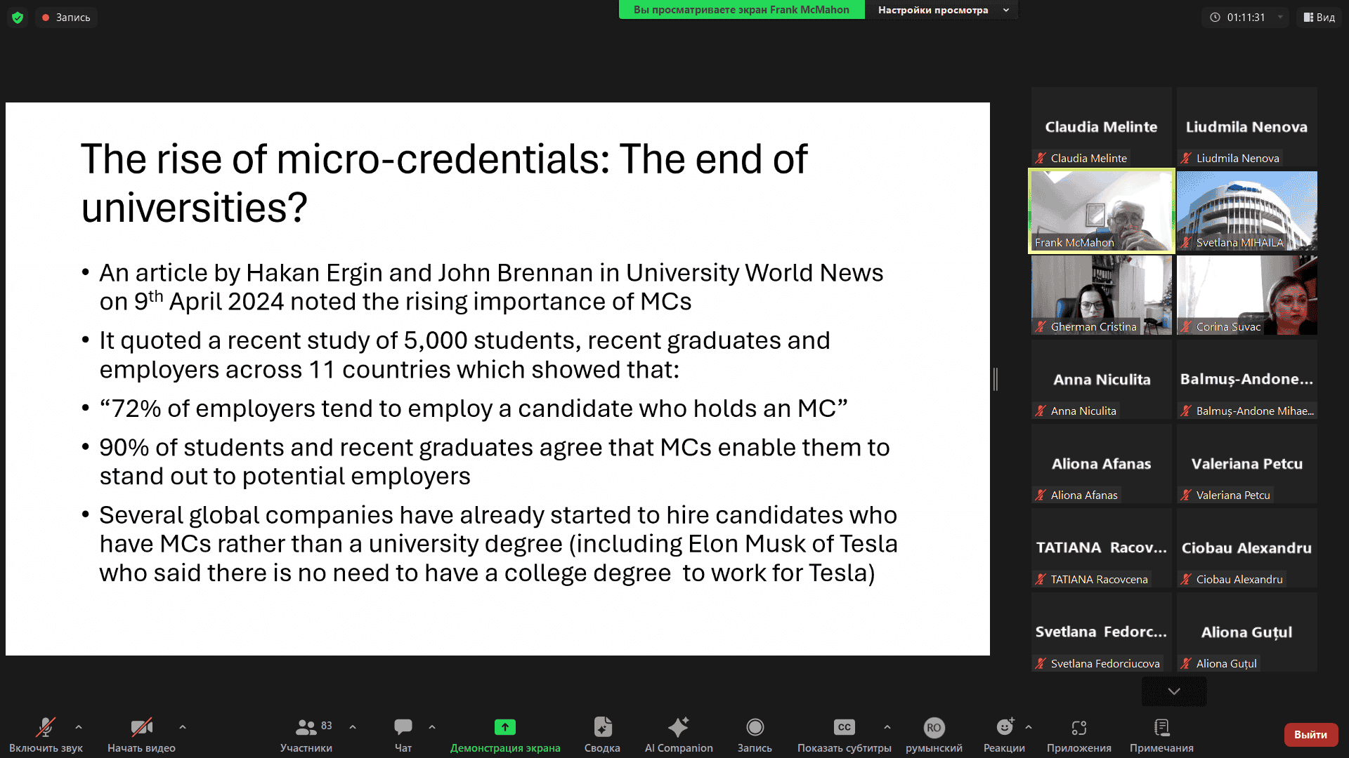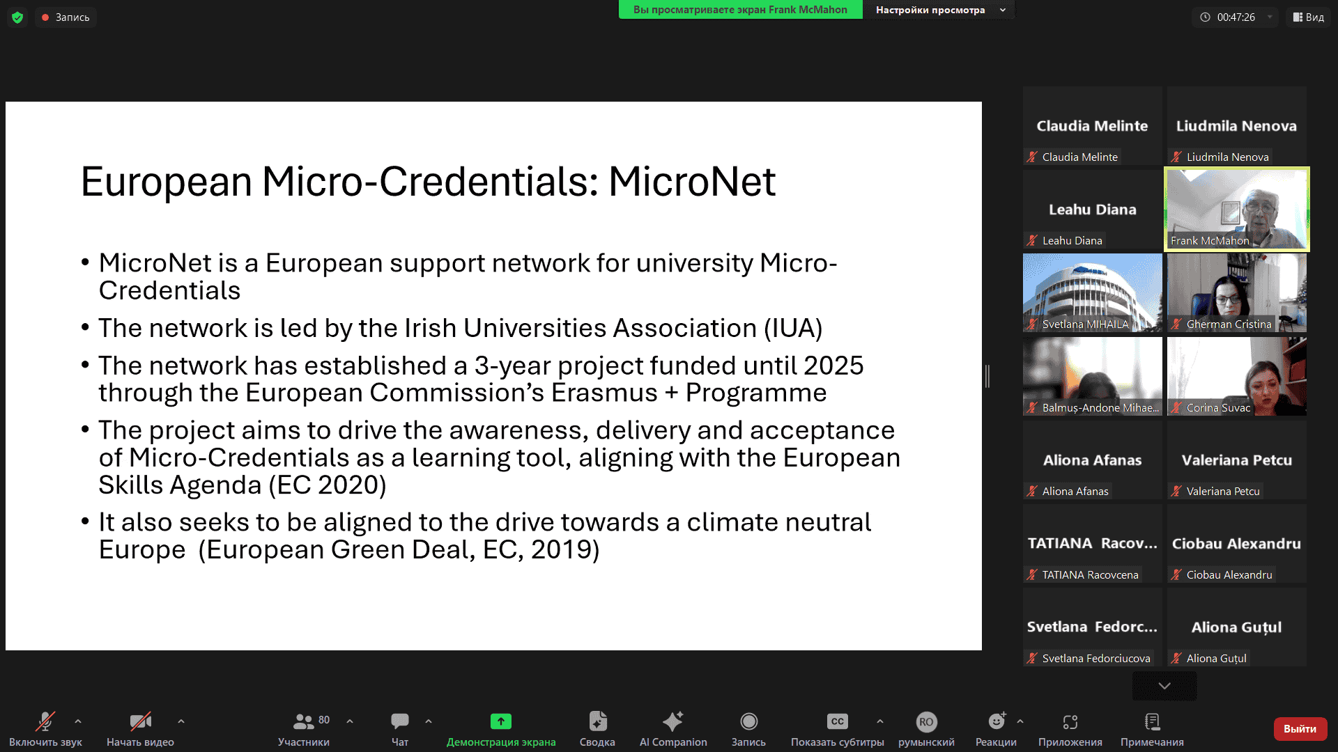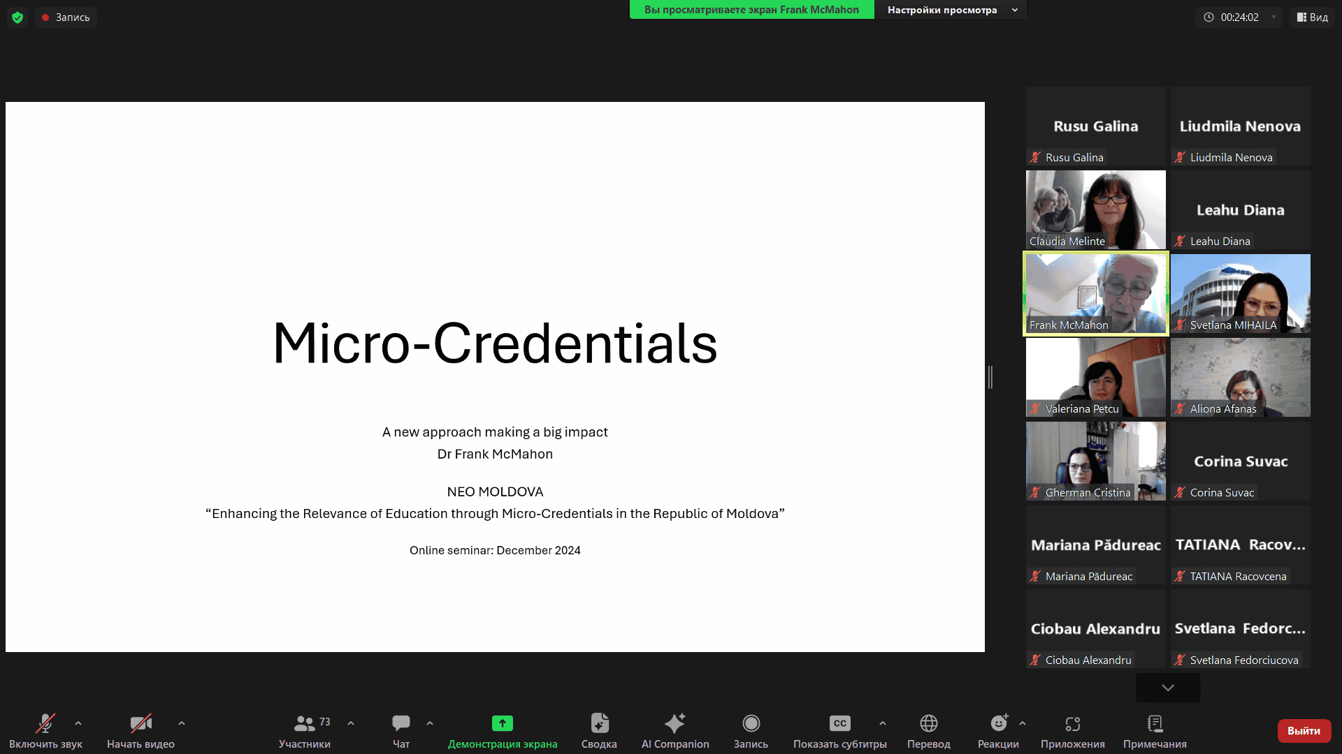 Scopul seminarului a fost de a discuta oportunitățile de implementare a micro-credencialelor pentru a crește relevanța și calitatea educației în instituțiile de învățământ superior din Republica Moldova. Expertul principal al evenimentului a fost profesorul Frank McMahon, fost director de afaceri academice al Institutului Tehnologic din Dublin (Irlanda). În prezentarea sa, acesta a evidențiat abordarea europeană privind micro-credencialele ca instrument de învățare continuă și creștere a competitivității pe piața muncii. Implementarea micro-credencialelor în universitățile din Moldova poate: întări legătura dintre învățământul superior și cerințele pieței muncii; contribui la elaborarea unor cursuri care să sprijine dezvoltarea durabilă a sectoarelor economice cheie, precum agricultura, biofarmaceutica și IT; reduce costurile educației datorită sprijinului oferit de programe internaționale, cum ar fi Erasmus+. Participarea US Comrat la astfel de inițiative reflectă dorința universității de a face parte din procesele internaționale de modernizare a educației. Discuțiile cu colegi și experți UE, precum profesorul McMahon, ajută universitatea să: pregătească studenții pentru provocările pieței muncii; dezvolte cursuri scurte specializate pe subiecte esențiale; încurajeze dezvoltarea profesională continuă prin metode moderne de învățare.
