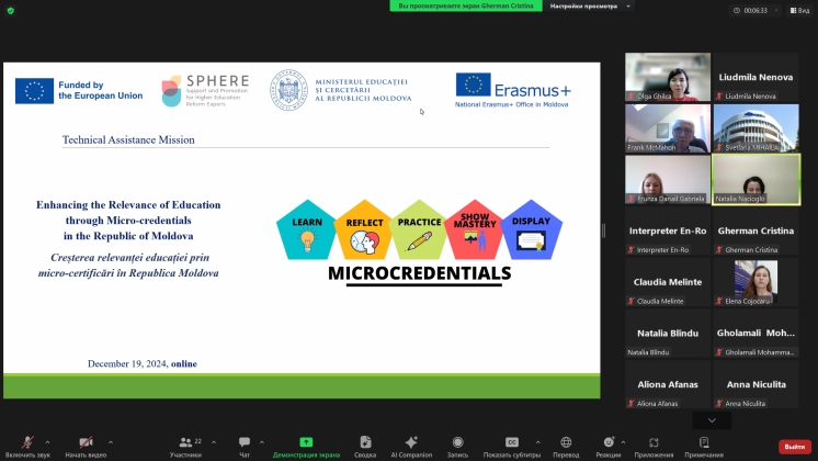 La 19 decembrie 2024, cadrele didactice și reprezentanții Departamentului pentru Relații Internaționale și Activitate Proiectuală din cadrul Universității de Stat din Comrat au participat la seminarul online „Enhancing the Relevance of Education through Micro-credentials in the Republic of Moldova / Creșterea relevanței educației prin micro-certificări în Republica Moldova”, organizat de Biroul Național Erasmus+ în Moldova împreună cu Ministerul Educației și Cercetării al Republicii Moldova, cu sprijinul Delegației UE în Moldova.