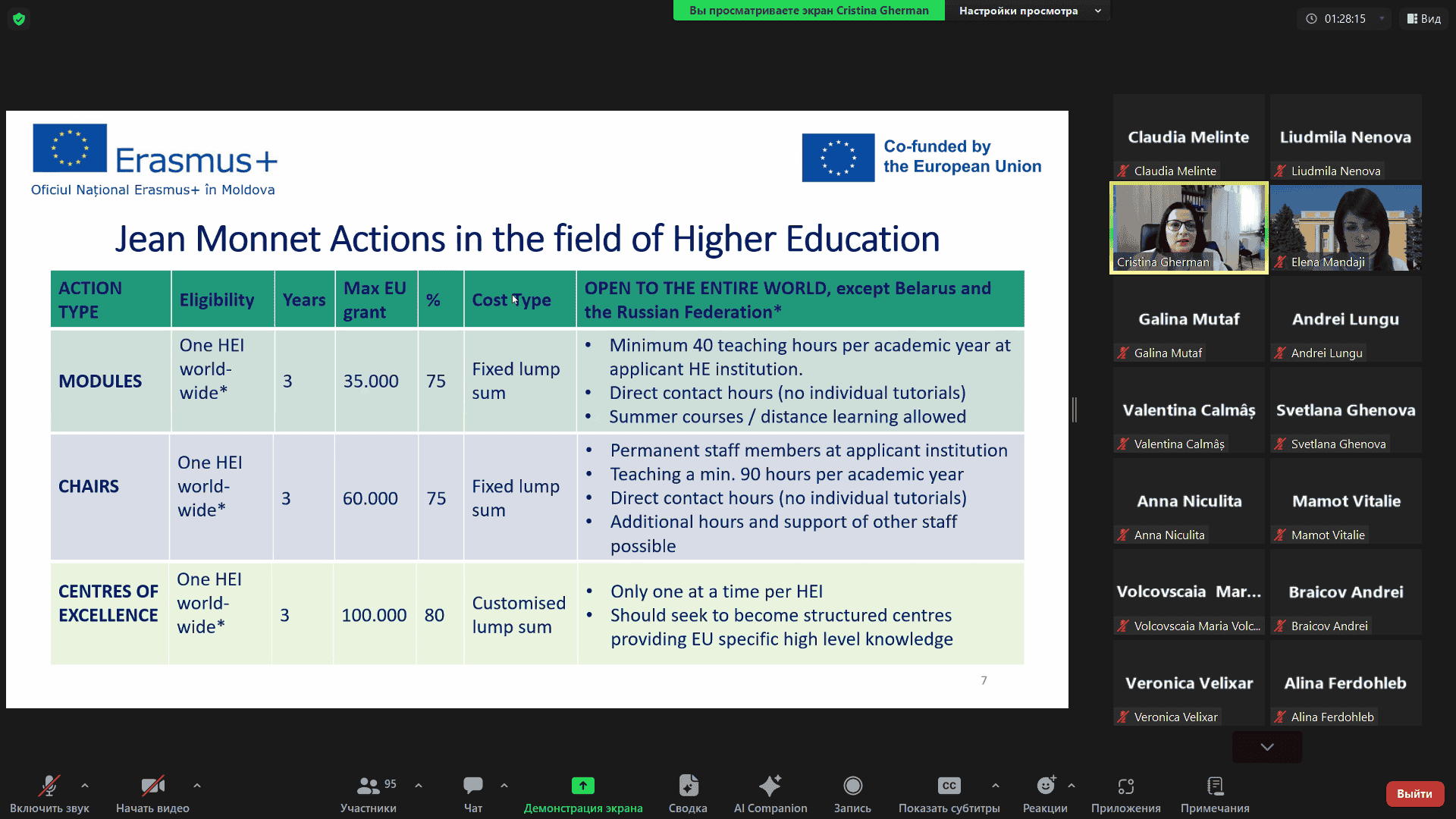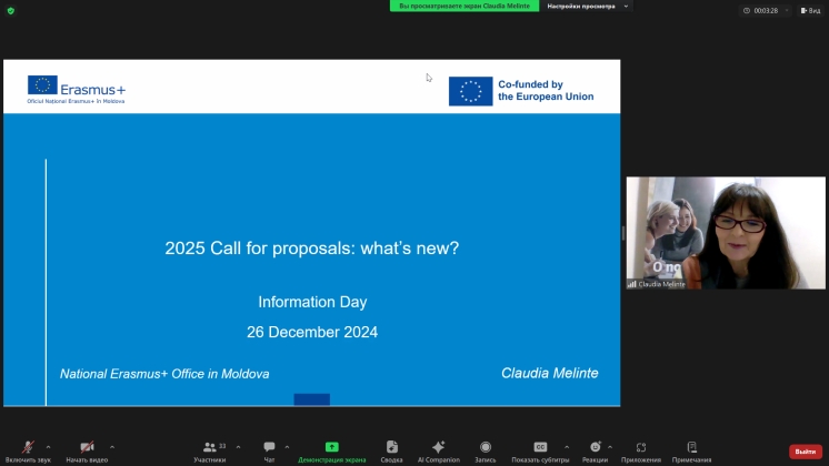 Pe 26 decembrie 2024, profesorii și personalul Departamentului de Relații Internaționale și Activități de Proiecte din cadrul Universității de Stat din Comrat (USC) au participat la seminarul online „Erasmus+ Programme Information Seminar: 2025 Call for Proposals & Information Sessions for Higher Education Staff”. Seminarul, organizat de Oficiul Național Erasmus+ în Moldova, cu sprijinul Delegației Uniunii Europene în Republica Moldova și al Ministerului Educației și Cercetării, a oferit participanților de la USC informații valoroase despre noutățile cheie în cadrul aplicațiilor pentru proiectele Erasmus+ din 2025.