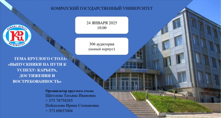 La Universitatea de Stat din Comrat, în cadrul Catedrei de Cultură și Arte, va avea loc o masă rotundă regională. Tema mesei rotunde: „Absolvenții pe calea succesului: carieră, realizări și cerere.”