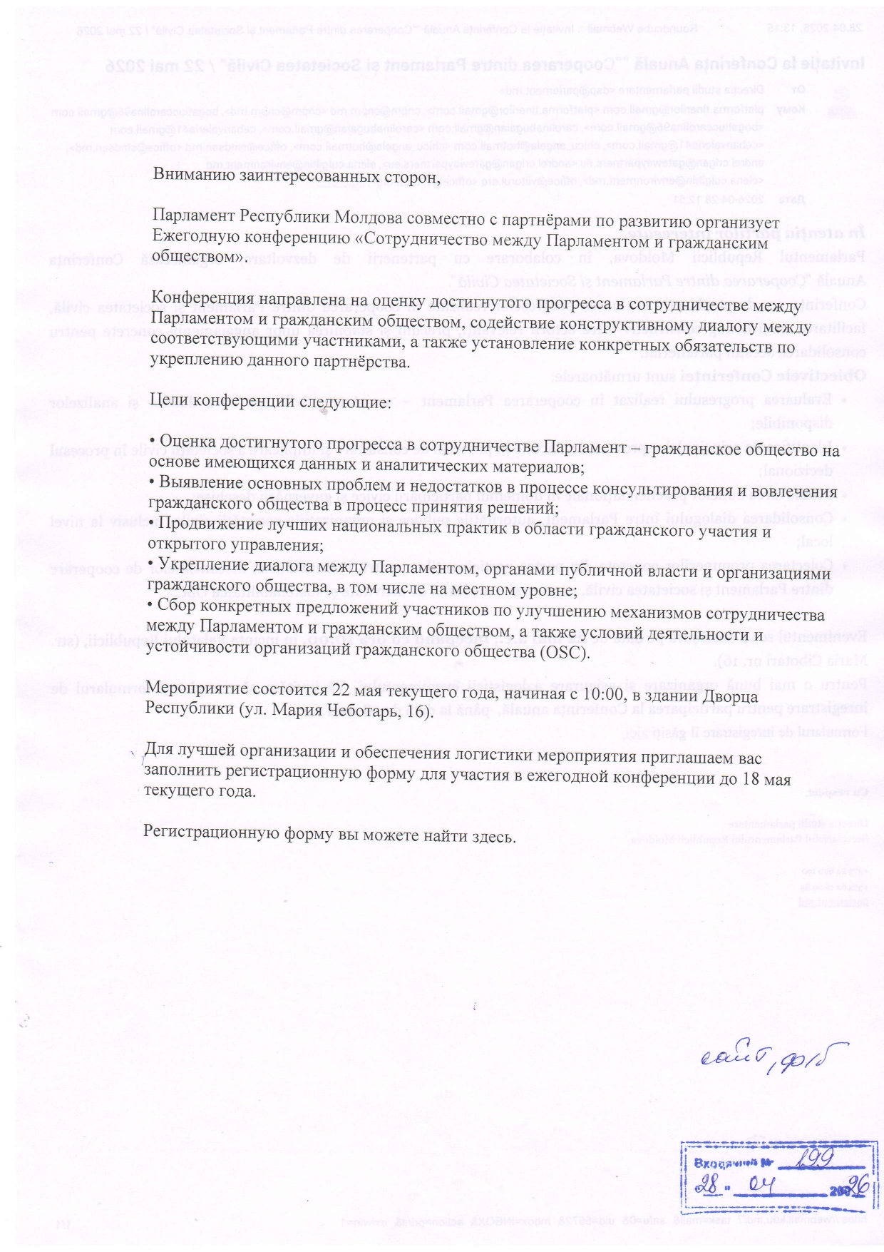 Парламент Республики Молдова совместно с партнёрами по развитию организует ежегодную конференцию «Сотрудничество между Парламентом и гражданским обществом».