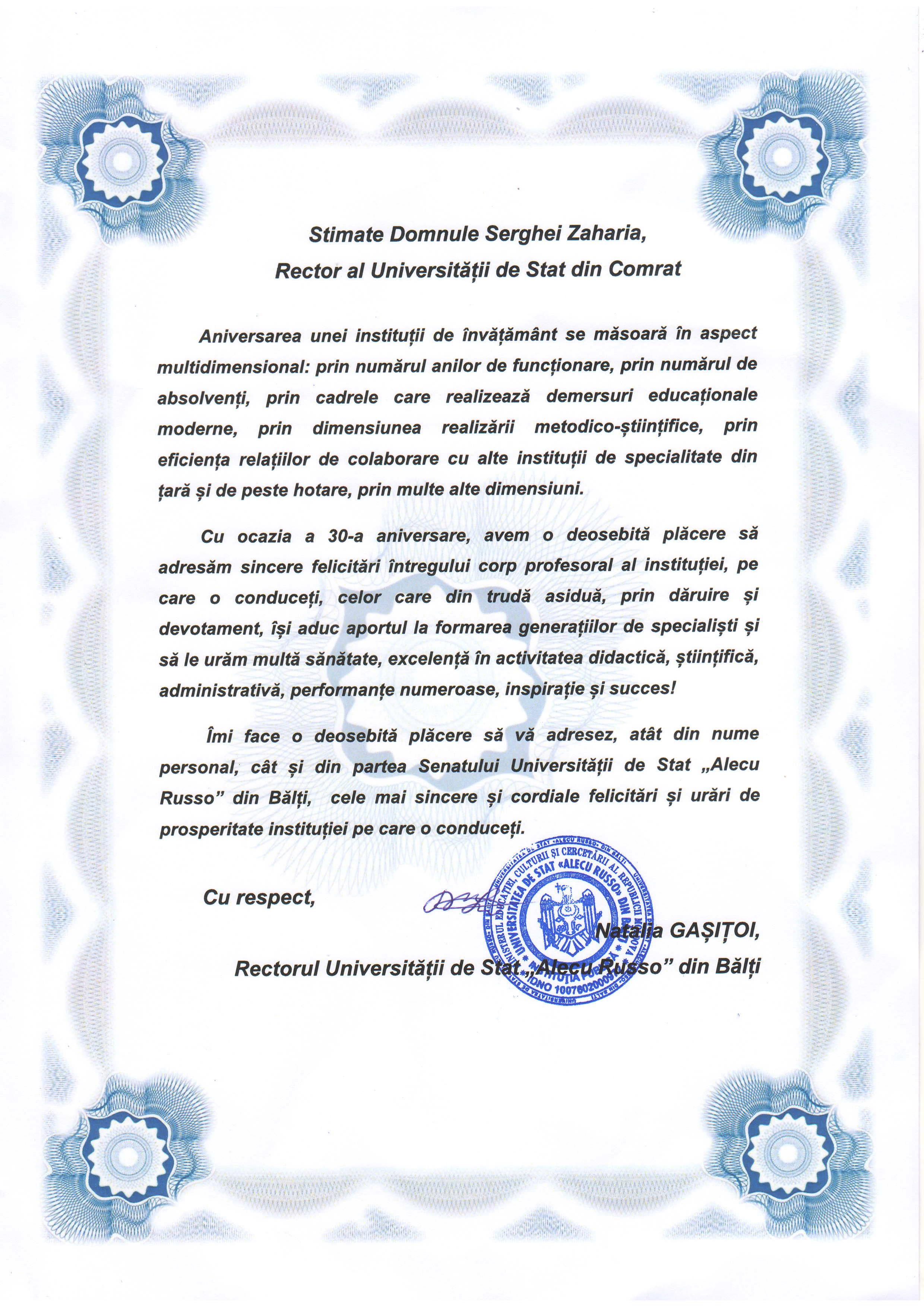 Поздравление ректора Бельцкого государственного университета им. "Alecu Russo" с 30 – летием образования Комратского Госуниверситета