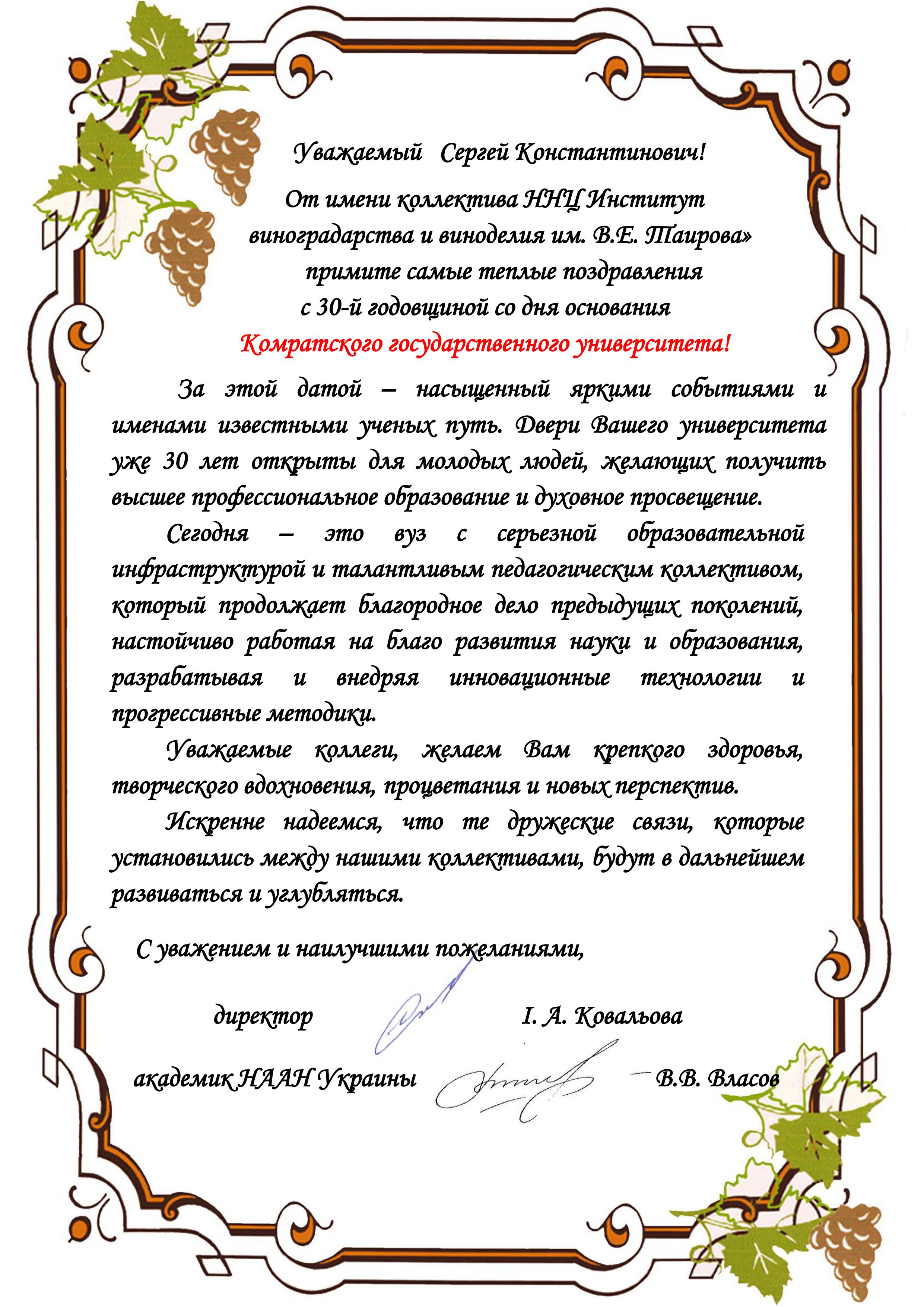 Поздравление от имени коллектива ННЦ Институт виноградарства и виноделия им. В.Е. Таирова» с 30-й годовщиной со дня основания Комратского государственного университета!
