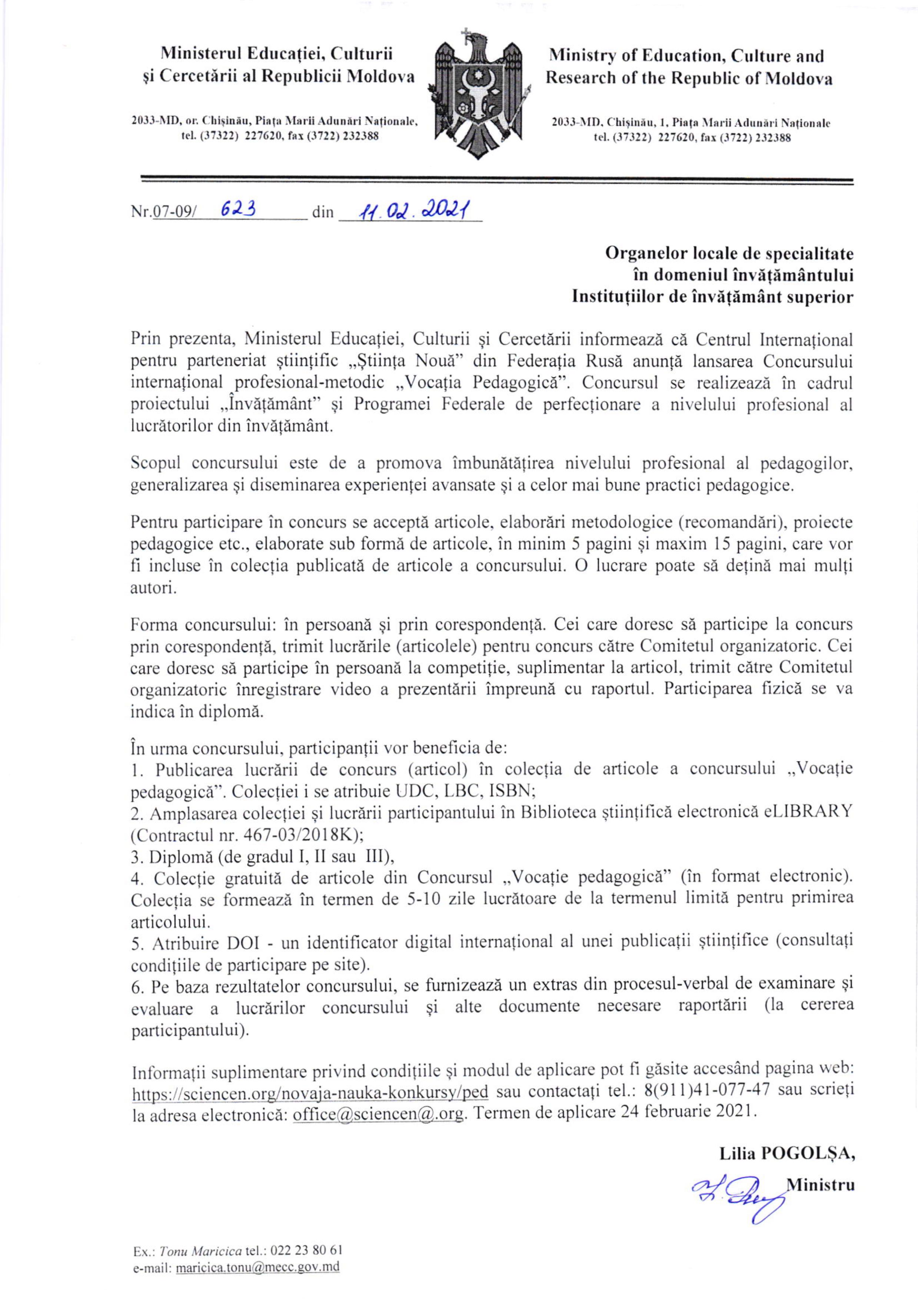 Министерство образования, культуры и исследований сообщает, что Международный центр научного партнерства «Новая наука» Российской Федерации объявляет о начале Международного профессионально-методического конкурса «Педагогическое призвание». Конкурс проводится в рамках проекта «învăţământ» и Федеральной программы повышения профессионального уровня работников образования.
