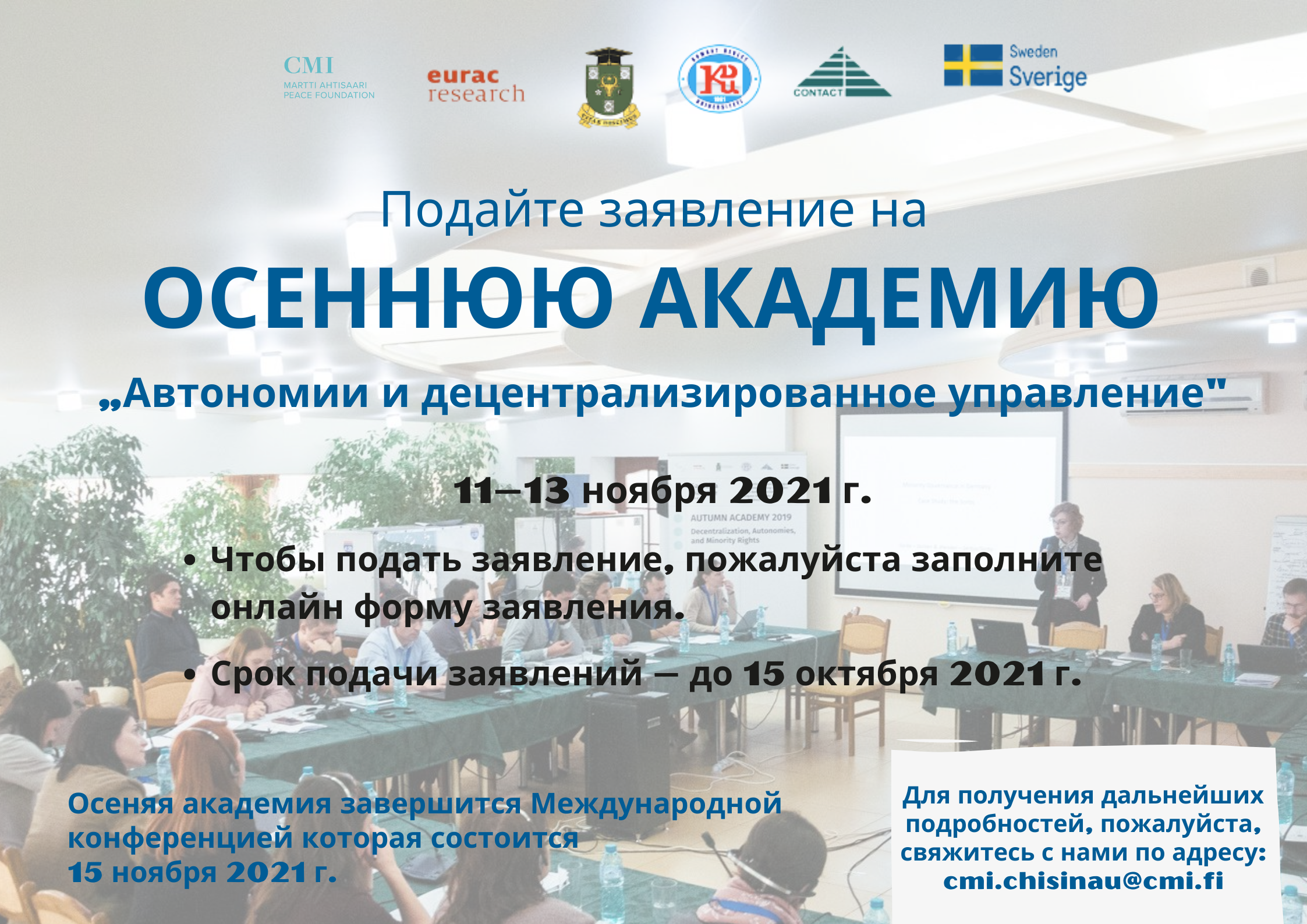 Осенняя академия 2021 «Автономии и децентрализованное управление» — это трехдневная образовательная программа, проводить которую будут эксперты из исследовательского института «Eurac», Молдавского государственного университета и Комратского государственного университета.