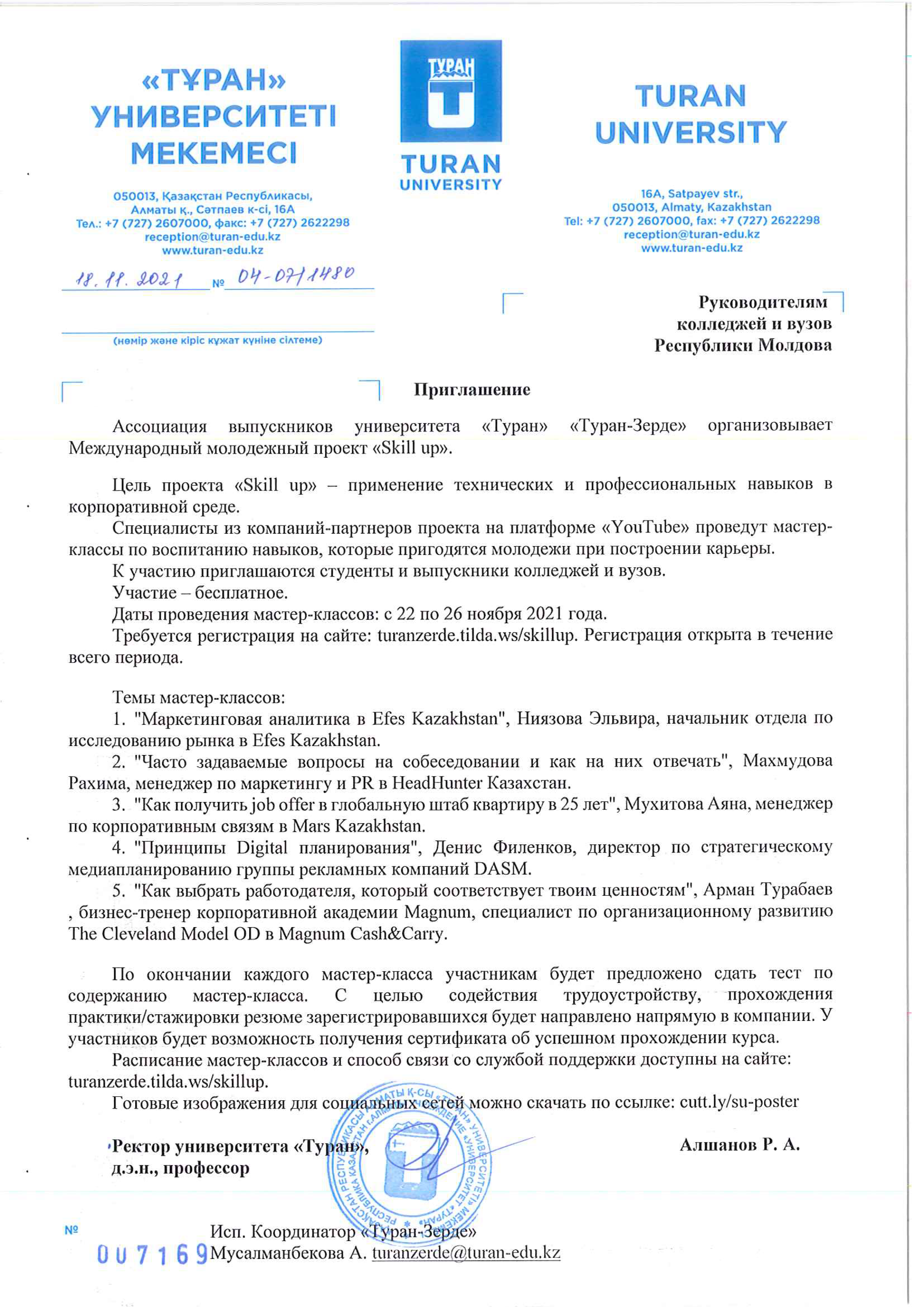 Приглашаем студентов и выпускников вашего учебного заведения принять участие в Международном молодежном проекте Skill up. В рамках проекта спикеры из компаний выступают с мастер-классами по улучшению карьерных навыков у участников.