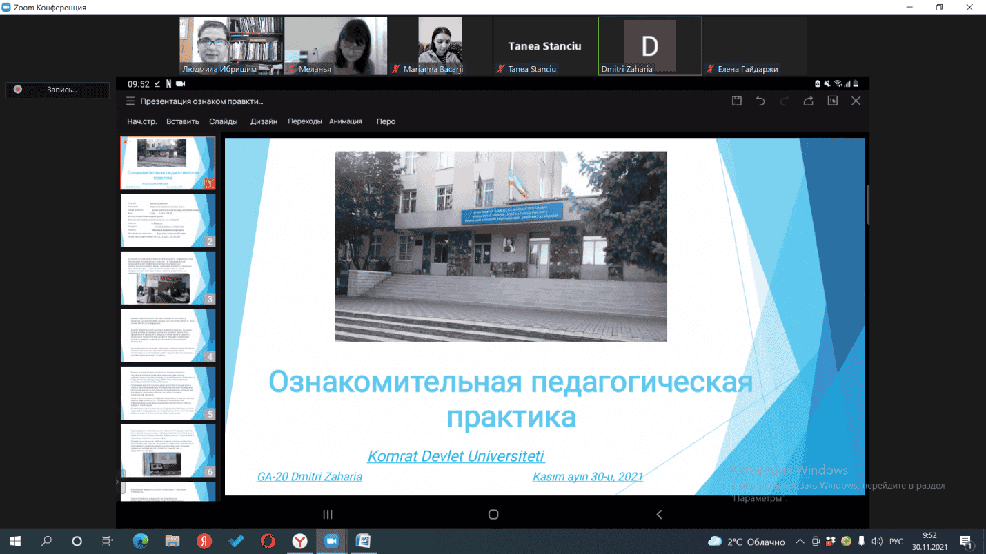 30 ноября состоялась итоговая конференция по практике, в которой приняли участие студенты группы GA-2020, студенты других групп педагогических специальностей, заведующая кафедрой гагаузской филологии Мутаф Г.Н., учителя от базового образовательного учреждения Каратерзи М.Д., завуч Кара О.Д..