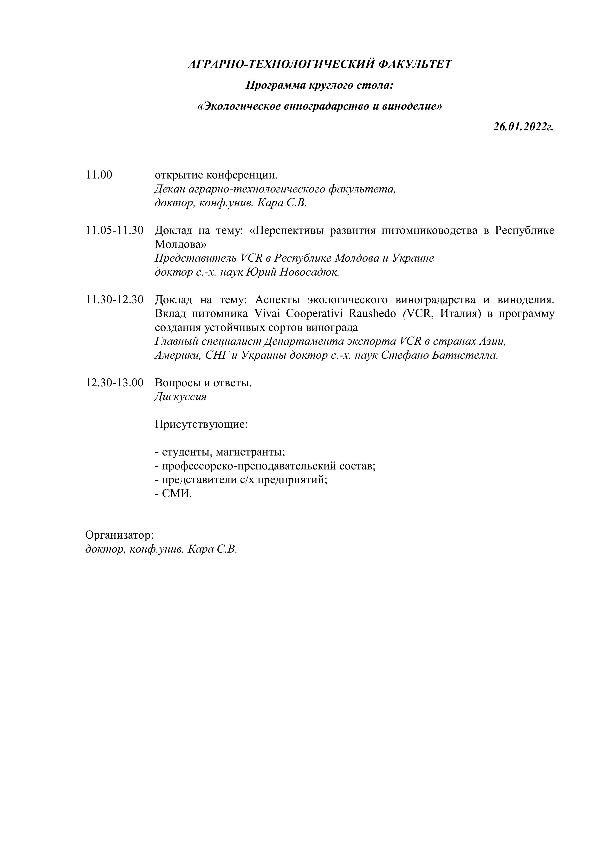 Тема круглого стола является очень важной и актуальной, в связи с тем, что одной из глобальных проблем сельскохозяйственного производства является частое применение фунгицидов комплексного действия и как результат загрязнение окружающей среды различными химическими веществами. Одним из путей решения данной проблемы является использование в производстве комплексно-устойчивых сортов винограда, требующих минимального количества обработок пестицидами.