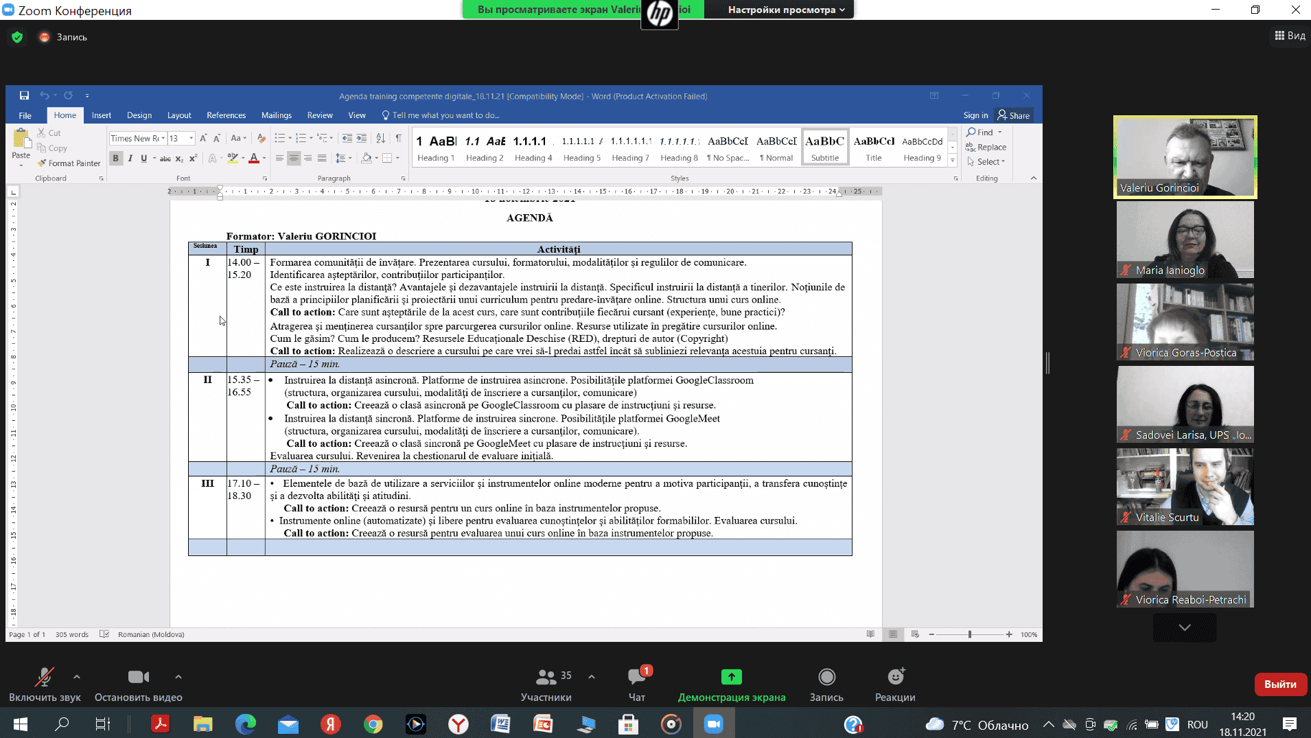 Под руководством ведущего специалистов Валериу Горинчой, участники тренинга, преподаватели Комратского государственного университета: Мутаф Г., доктор, зав. каф. гагаузской филологии и истории; Яниогло М., доктор, конф. унив., каф. педагогики и психологии; Щеголева Т., Maestru în Artă al RM, зав. каф. культуры и искусств; Кер Л., доктор, конф. унив., каф. педагогики и психологии; Иофчу Н., Maestru în Artă al RM, каф. культуры и искусств; Папцова А., доктор, конф. унив., каф. гагаузской филологии и истории; Санду Т., доктор, конф. унив., каф. иностранных языков.; Сырф В., доктор, каф. гагаузской филологии и истории, совместно с представителями других вузов - партнеров консорциума по реализации проекта EIC, рассмотрели возможности, преимущества и риски при использовании различных информационных онлайн-инструментов, доступные образовательные платформы, их использование в процессе дистанционного обучения.