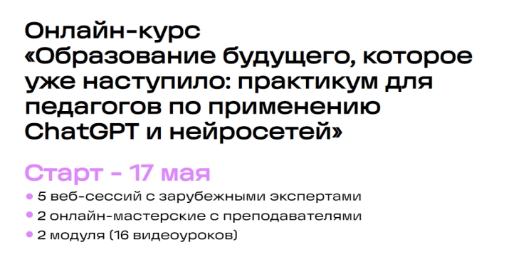 Онлайн-курс включает 2 модуля (16 видеоуроков), 5 веб-сессий с зарубежными экспертами в области искусственного интеллекта, 2 онлайнмастерские с зарубежными педагогами, использующими инструменты искусственного интеллекта, включая ChatGPT, в своей практике, практические задания к модулям и итоговую работу по разработке занятия с использованием технологии искусственного интеллекта и нейросетей.