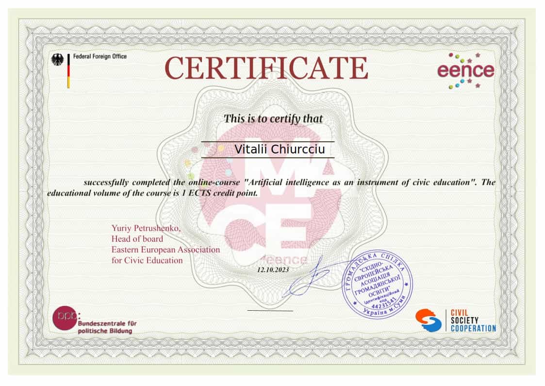 Преподаватель экономического факультета кафедры «Бухгалтерский учет и финансы» Кюркчу Виталий Иванович прошел обучение в онлайн-курсе под названием «Искусственный интеллект как инструмент гражданского образования», организованном Восточно-Европейской Ассоциацией по Гражданскому Образованию, при поддержке Федерального Агентства по гражданскому образованию (ФРГ) за счет средств Министерства иностранных дел Германии.