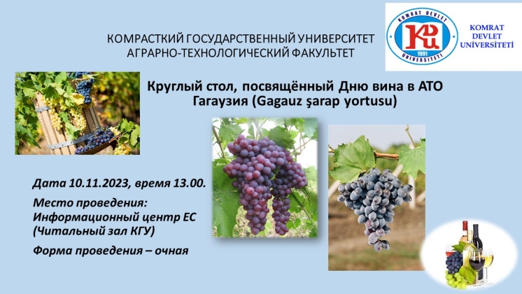 Администрация Аграрно-технологического факультета приглашает принять участие в работе круглого стола, посвящённого Дню вина в АТО Гагаузия (Gagauz şarap yortusu). Целью данного мероприятия является углубление знаний, проведение научных исследований и вовлечение молодежи в научные разработки в сфере виноградарства и виноделия. Что, в конечном итоге, способствует развитию данной отрасли в регионе.