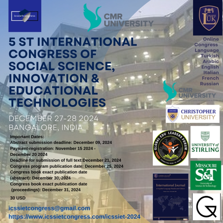 Студенты, магистранты, докторанты, профессорско-преподавательский состав Комратского государственного университета приглашаются принять участие в 5. Международном конгрессе по социальным наукам, инновациям и образовательным технологиям, организуемый ICSSIET. Конгресс пройдет онлайн с 27 по 28 декабря 2024 года в Университете CMR, Бангалор, Индия.