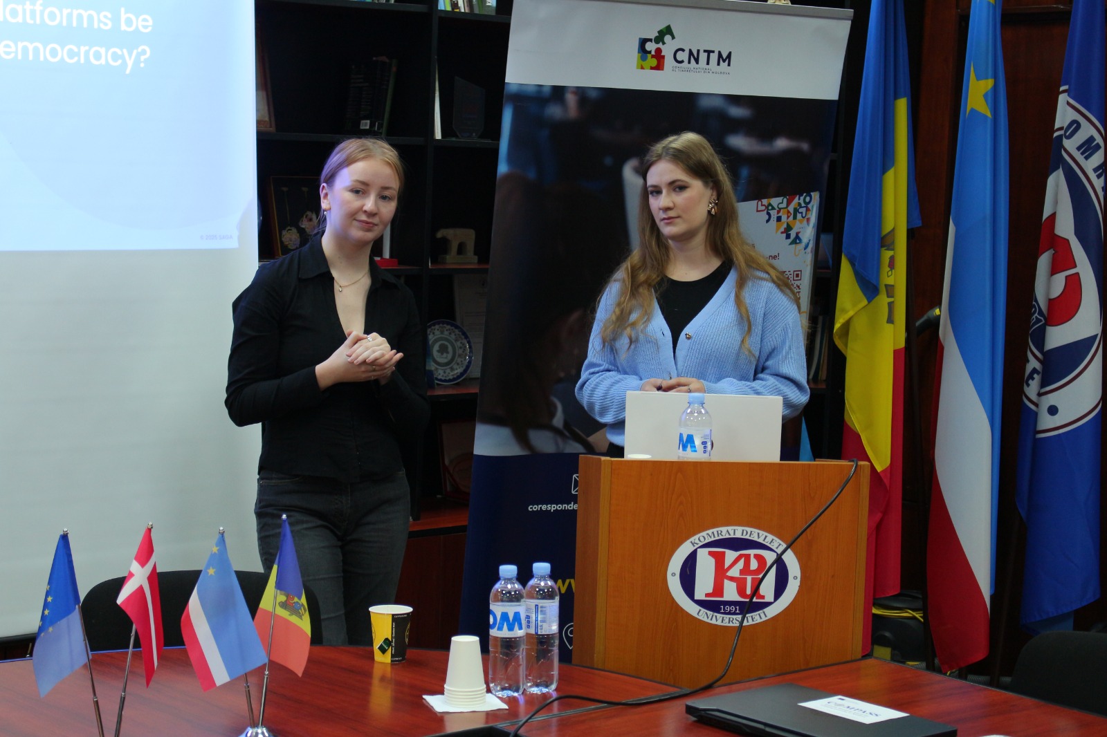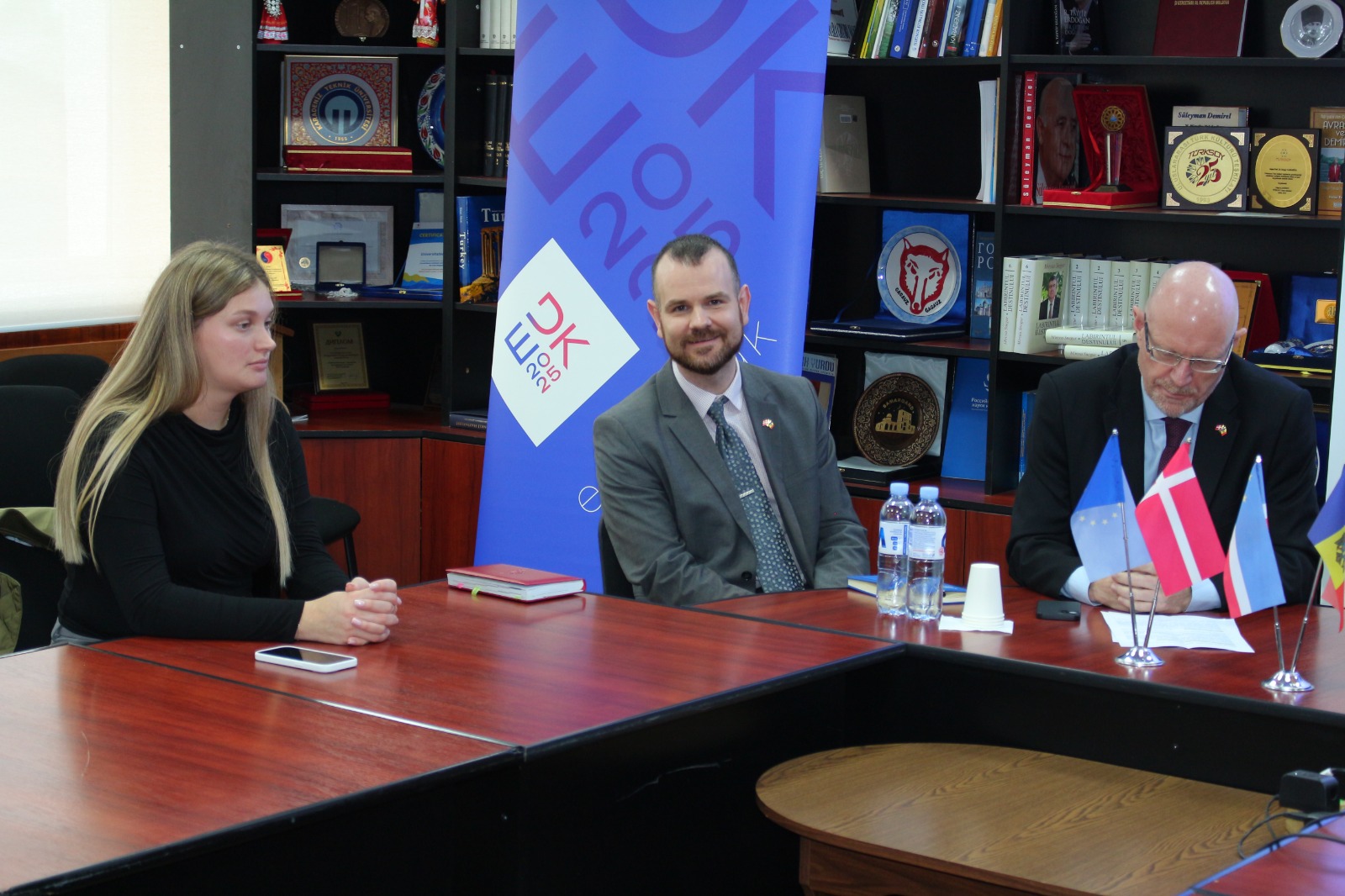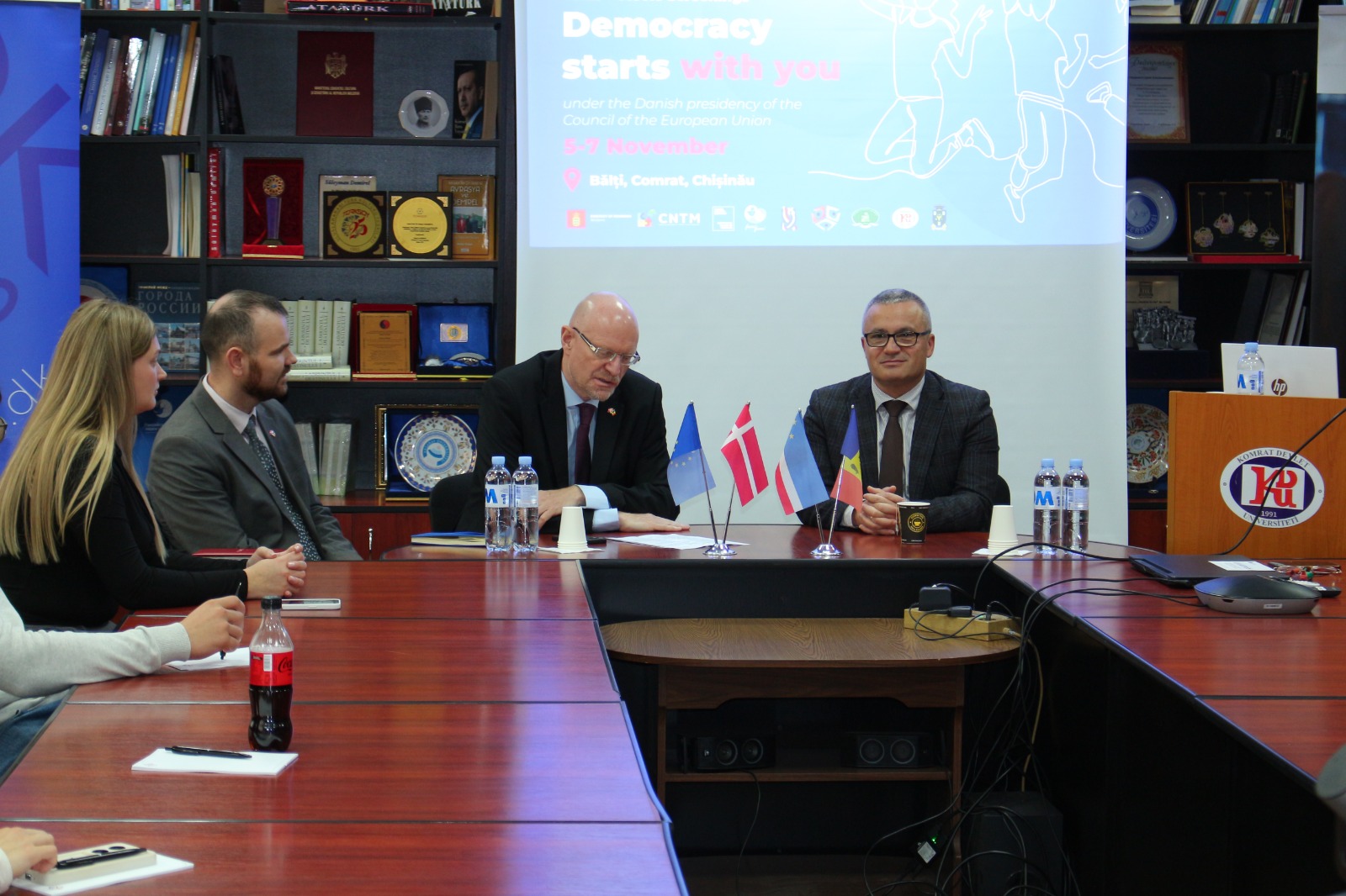 6 ноября 2025 года в Комратском государственном университете состоялось мероприятие в рамках инициативы «Беседы + Кинопоказы – Демократия начинается с тебя!», организованной Посольством Королевства Дания в Республике Молдова при поддержке партнеров. В мероприятии приняли участие ректор Комратского государственного университета, др. конф. унив. Захария С.К., представители профессорско-преподавательского состава и студенческого сообщества КГУ, а также Посол Королевства Дания в Республике Молдова господин Сёрен Йенсен, гражданская активистка и член датской организации SAGA Хелена Ольсен, работающая в Министерстве иностранных дел Дании, и представители Национального совета молодёжи Молдовы (CNTM). В ходе встречи прошёл семинар «Вовлечённость молодёжи и демократическая устойчивость», на котором участники обсудили роль молодёжи в развитии демократии, диалоге и гражданской активности. После семинара состоялся показ документального фильма «70/30» – вдохновляющей истории о том, как молодёжное движение повлияло на формирование экологической политики Дании. Зрители также приняли участие в онлайн-встрече с режиссёром фильма Фие Амбо, где обсудили идеи ответственности, устойчивого развития и участия граждан в принятии решений. Ректор КГУ Захария С.К. поблагодарил Посольство Королевства Дания за сотрудничество и отметил важность подобных инициатив для студенческой молодёжи, способствующих развитию критического мышления, гражданской позиции и европейских ценностей.